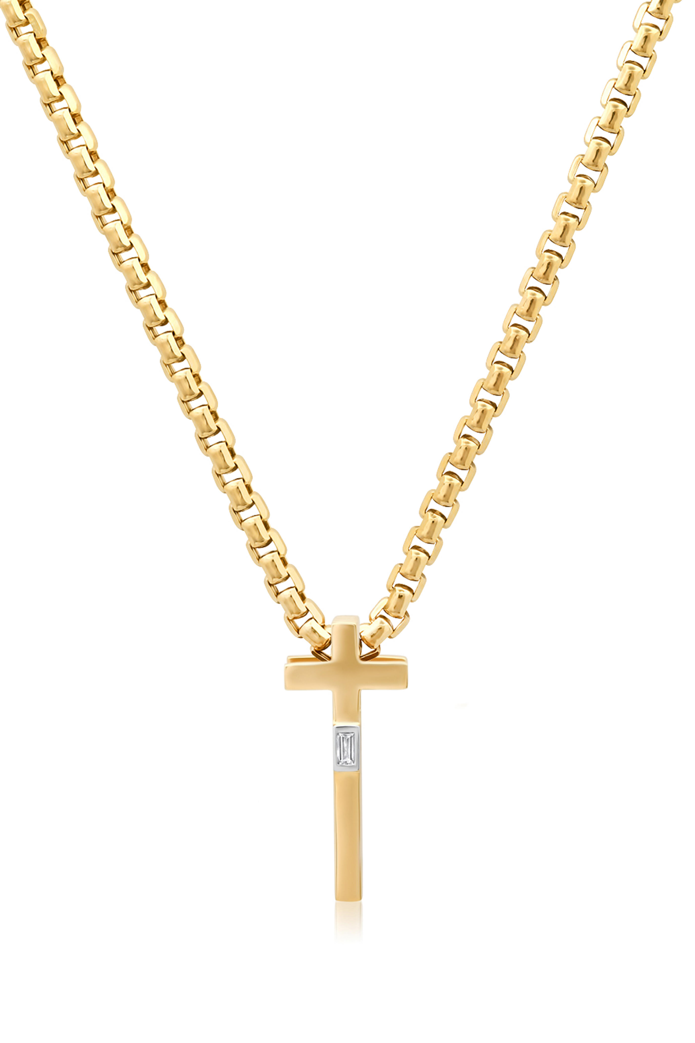 Our slide-on cross pendant is handcrafted in 14k gold with a diamond baguette. Wear this alone or slide it on next to any of our initial charms for the perfect stack.