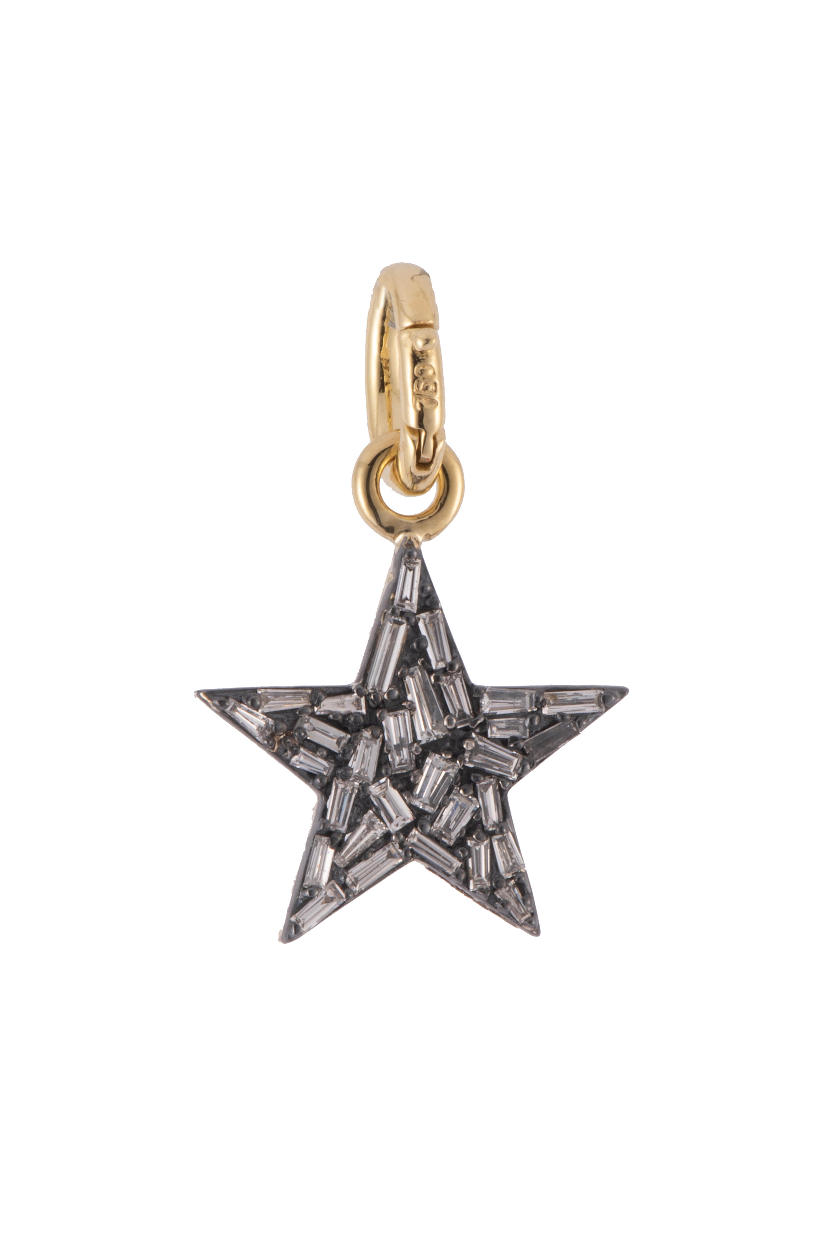 18k gold. 18k white gold. Diamond 0.60 total carat weight. Baguette cut diamond. Star design. Gold hinge bail. Made in the USA.