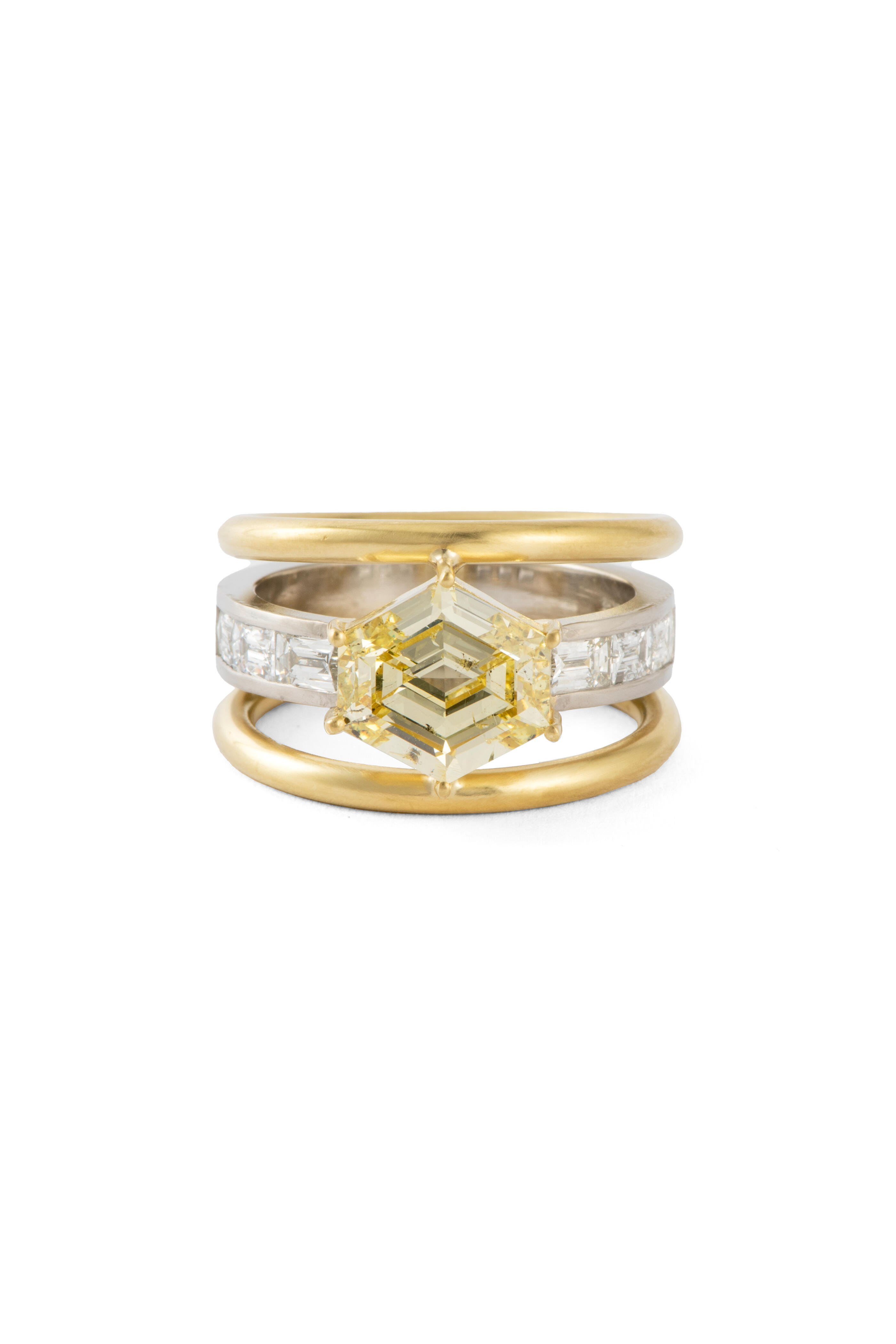 18k gold. Platinum. Diamond 1.10 total carat weight. Yellow diamond 2.91 total carat weight. Full cut diamond. Triple band design. Prong setting. Made in the USA. Ring size 7.