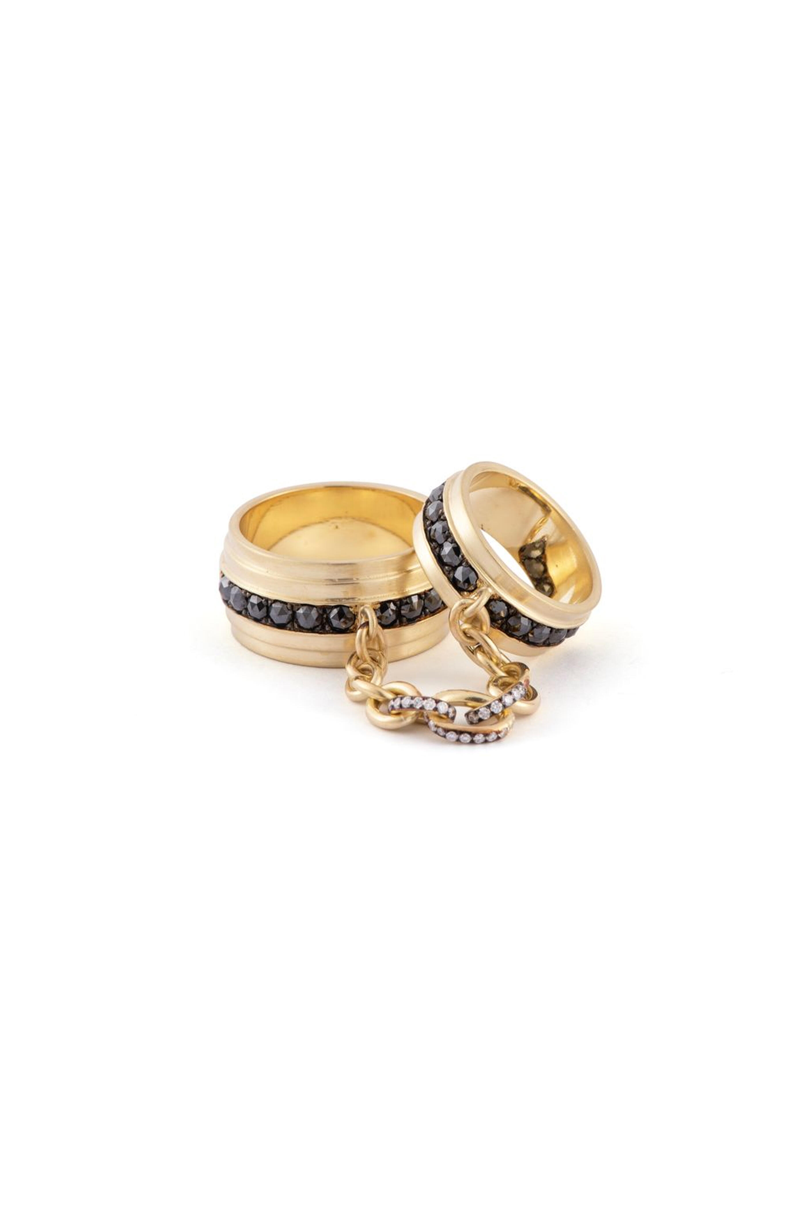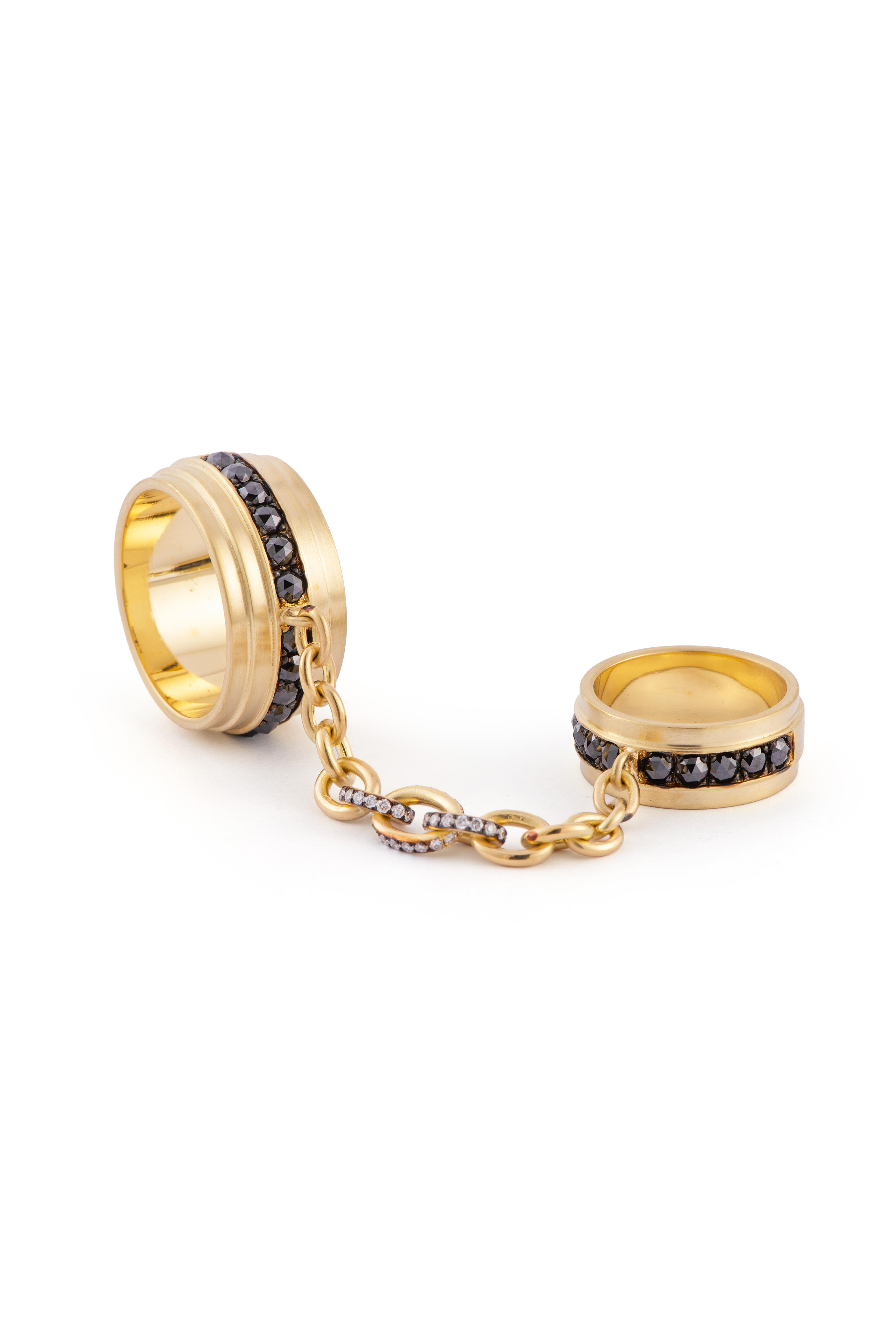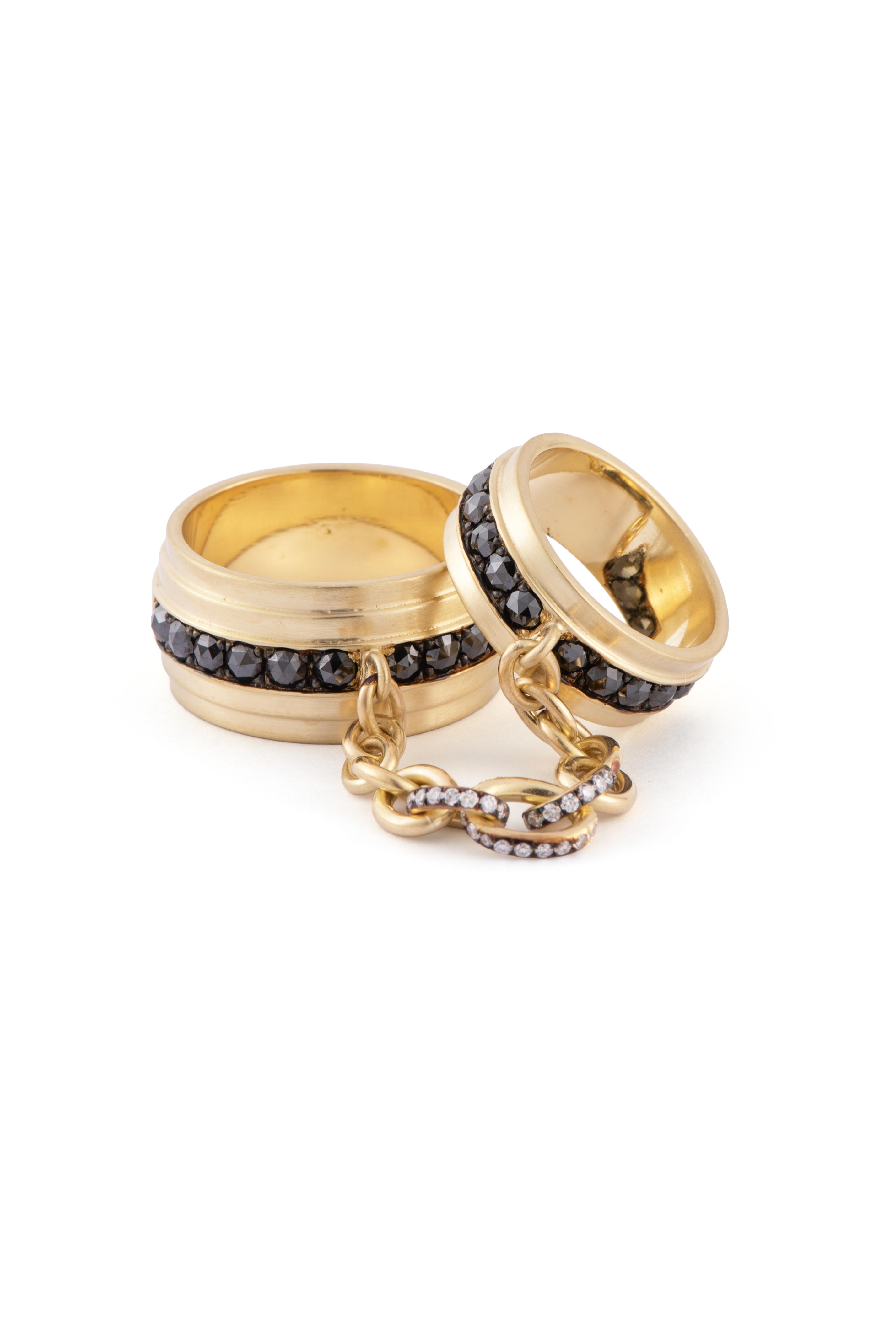 18k gold. Diamond 0.28 total carat weight. Black diamond 1.410 total carat weight. Double band design. Chain length. Prong setting. Made in the USA. Call for ring size.
