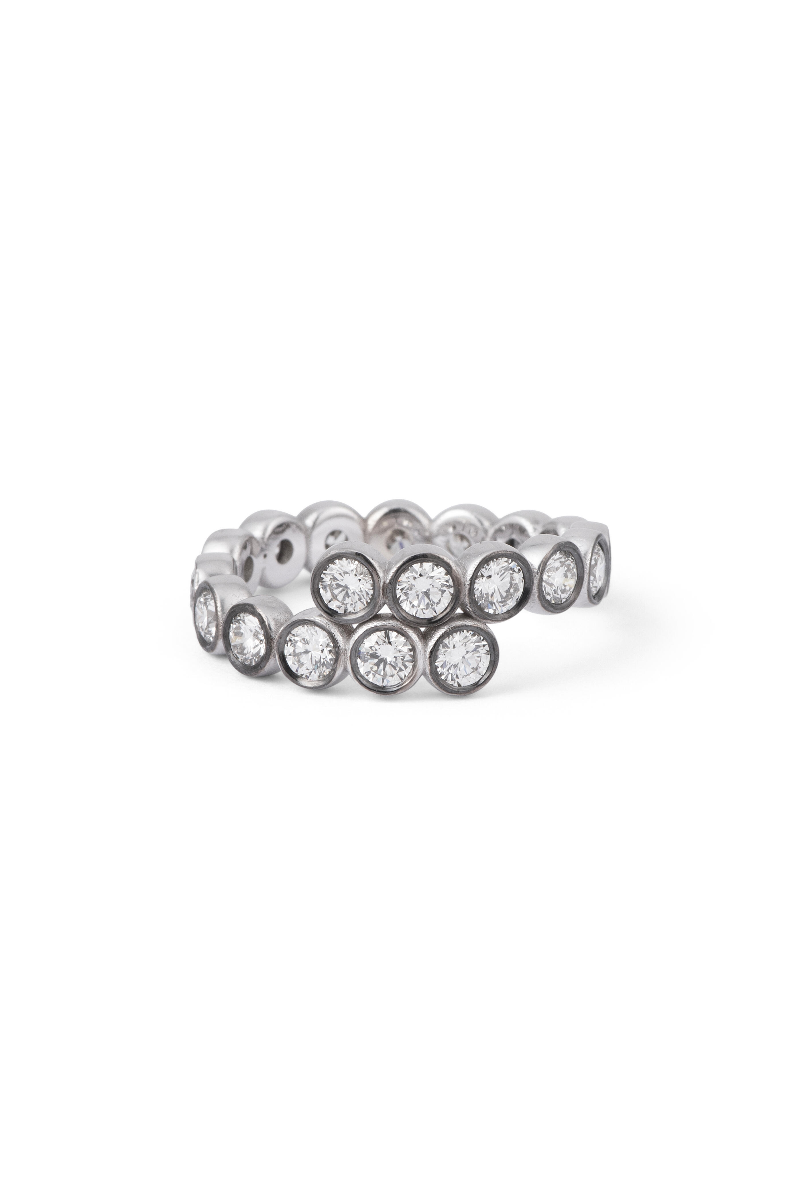 18k white gold. Diamond 2.00 total carat eight. Round, brilliant cut diamond. Swirl design. White gold bezel. Made in the USA. Ring size 7.5.