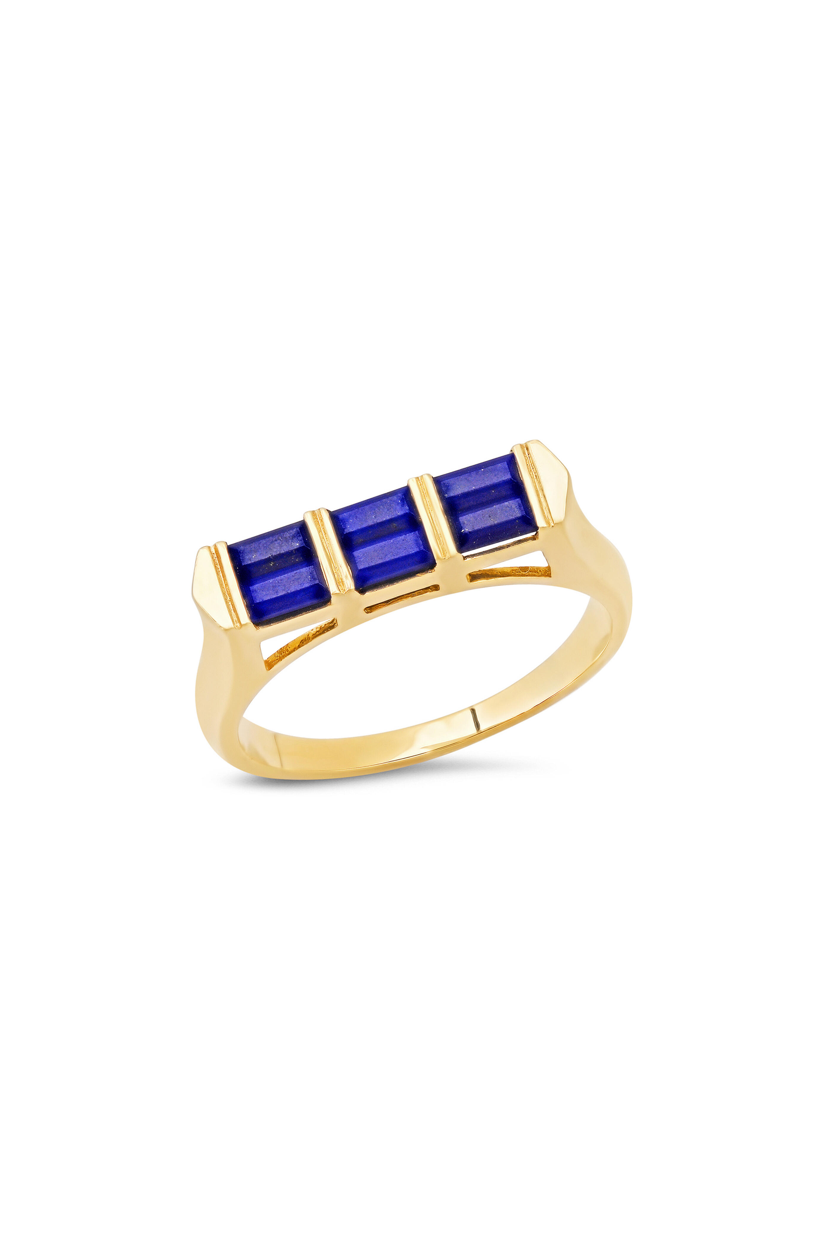 Our colorblock ring is handcrafted in 14K yellow gold with 6 baguette stones.