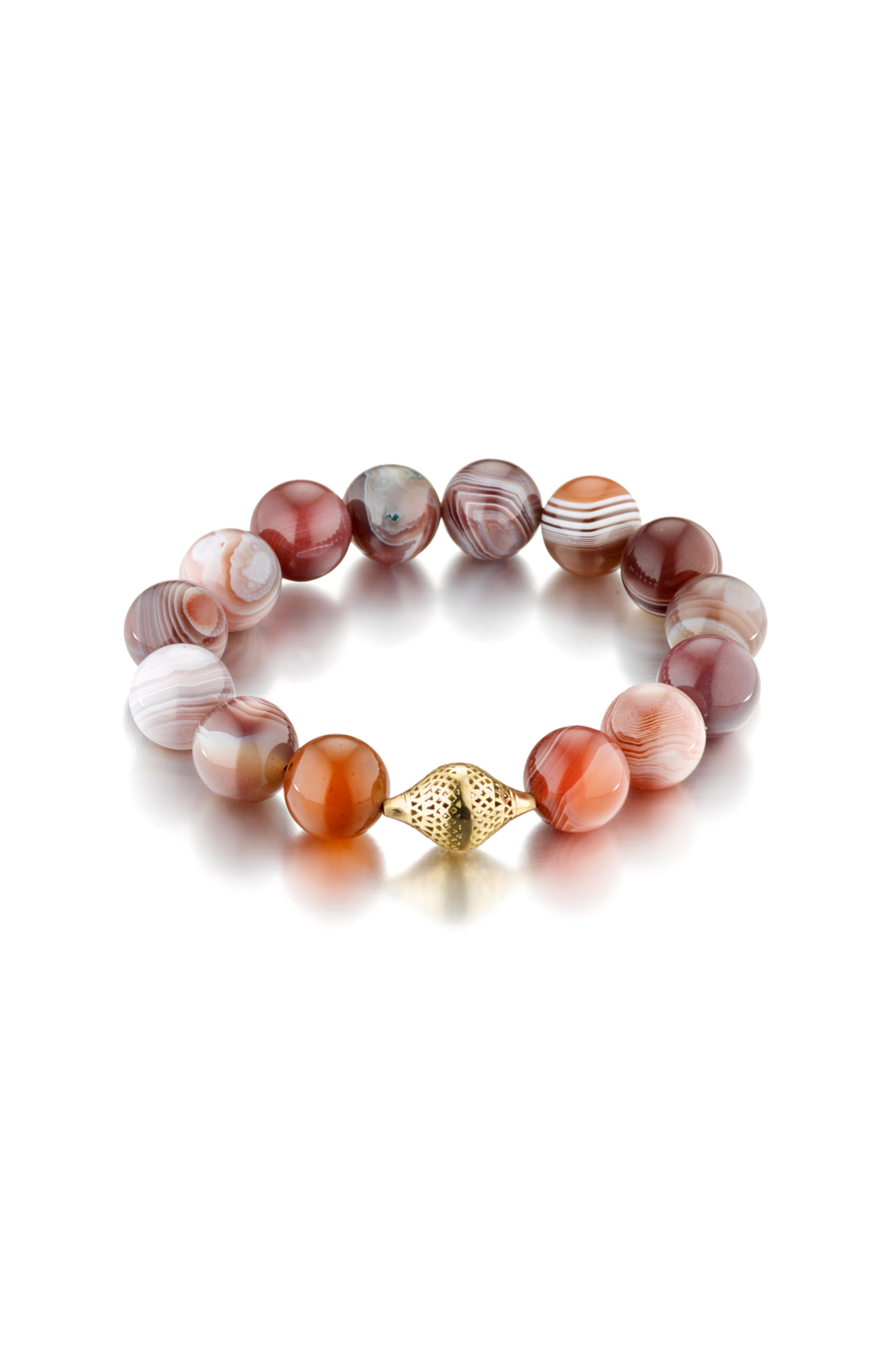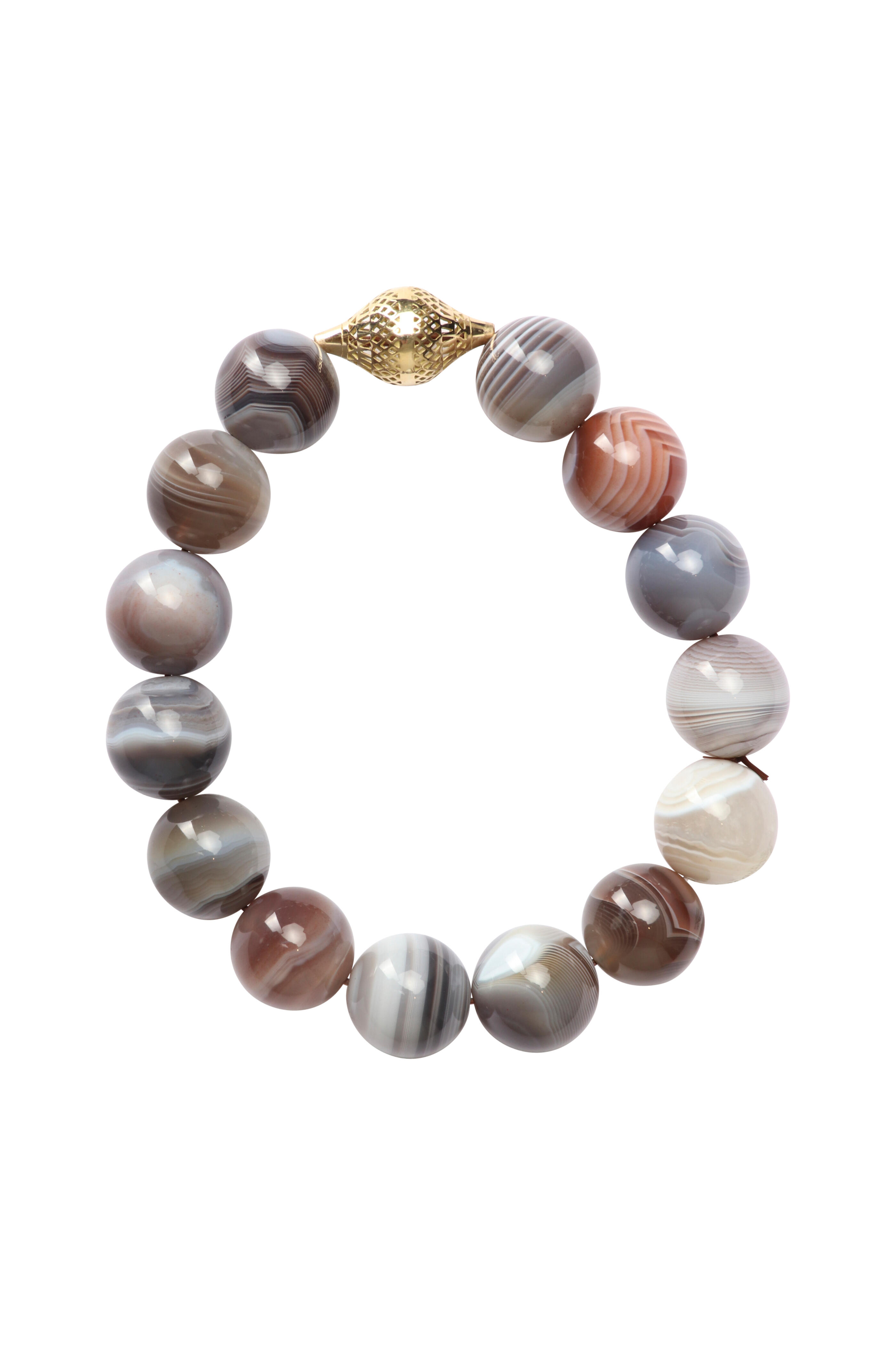 18k gold. Agate. Faceted bead. Beaded. One gold crownwork bead. Stretch design. Handmade in New York. Diameter: 2.75”.