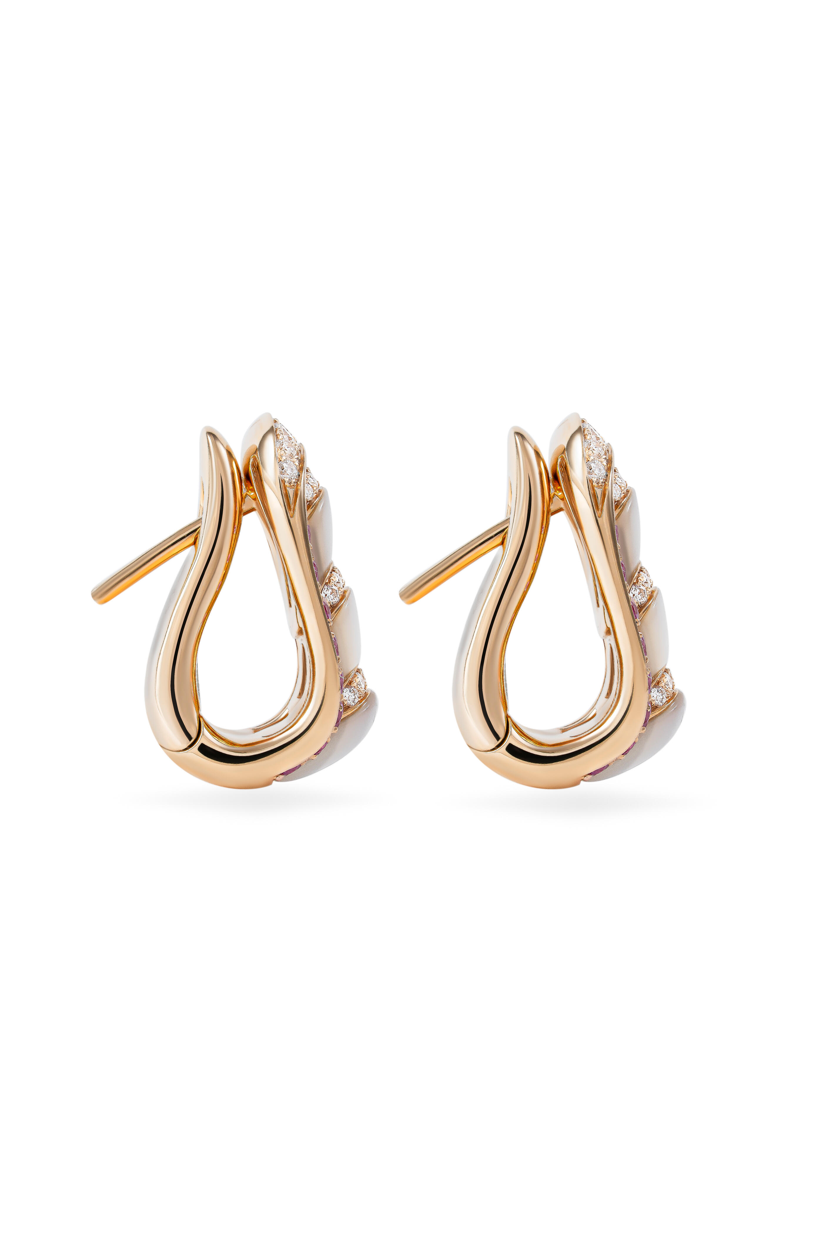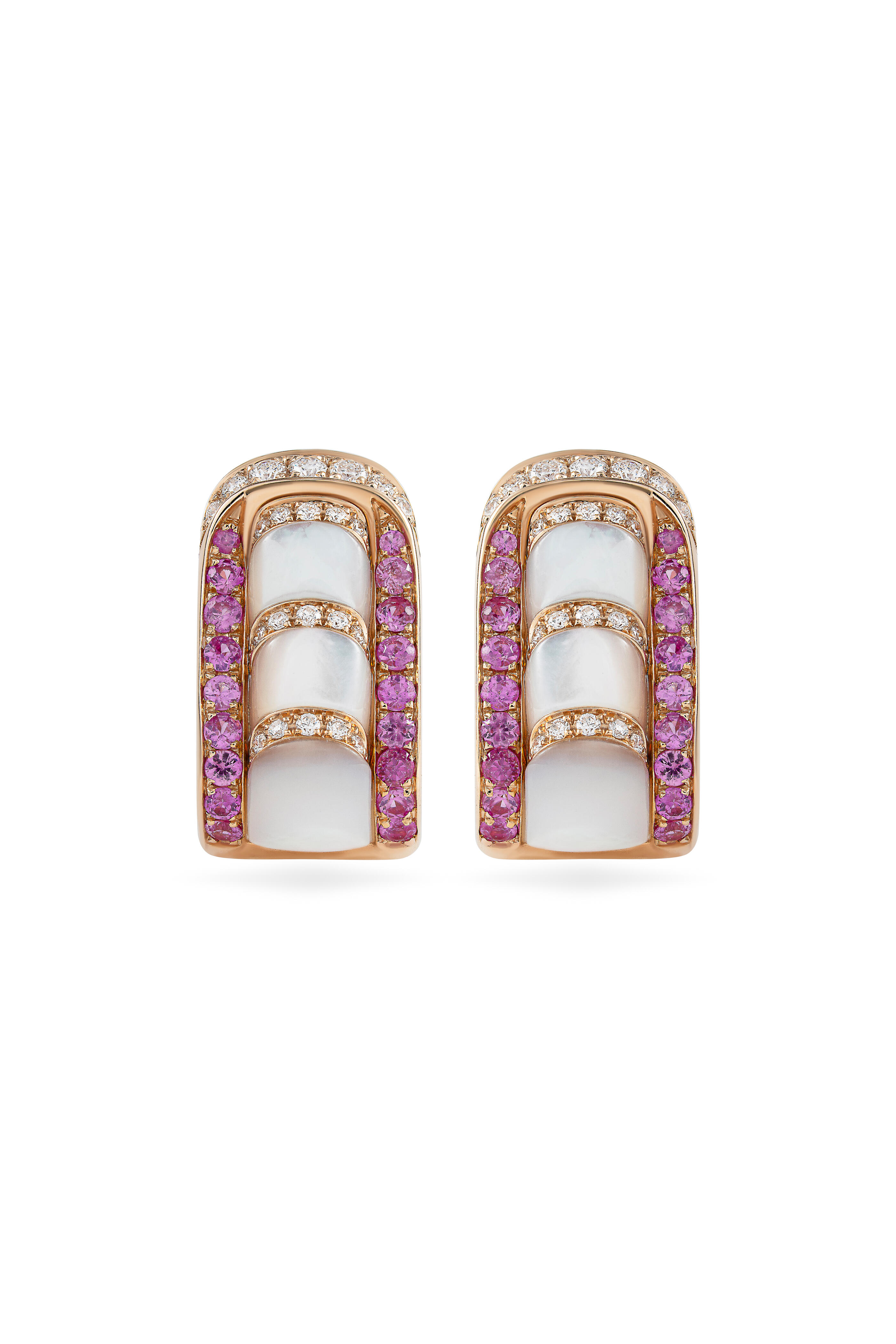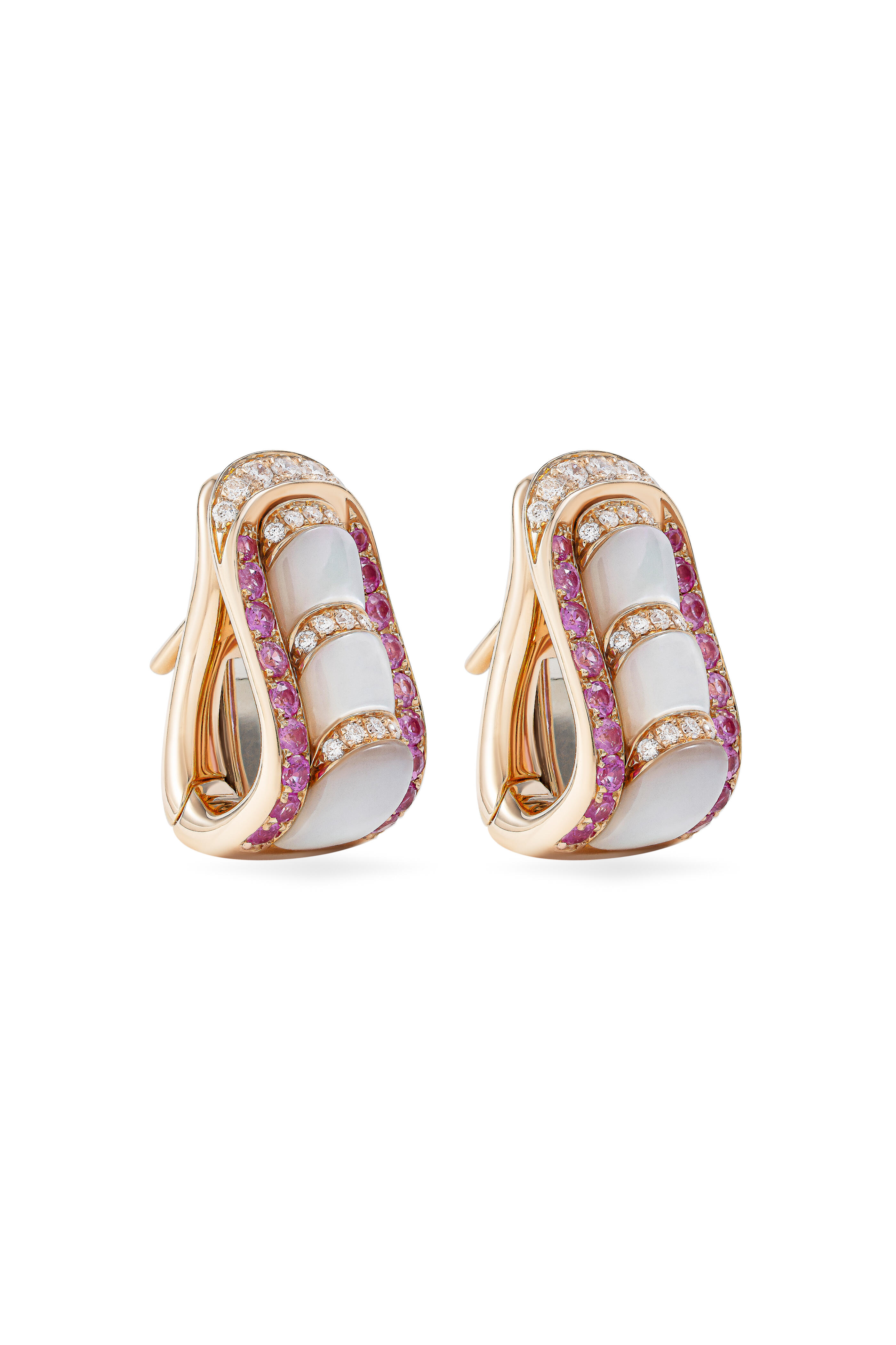 18k Rose Gold. 0.84 ct Mother of Pearl. 0.32 ct Diamond. 0.75 ct Pink Sapphire.