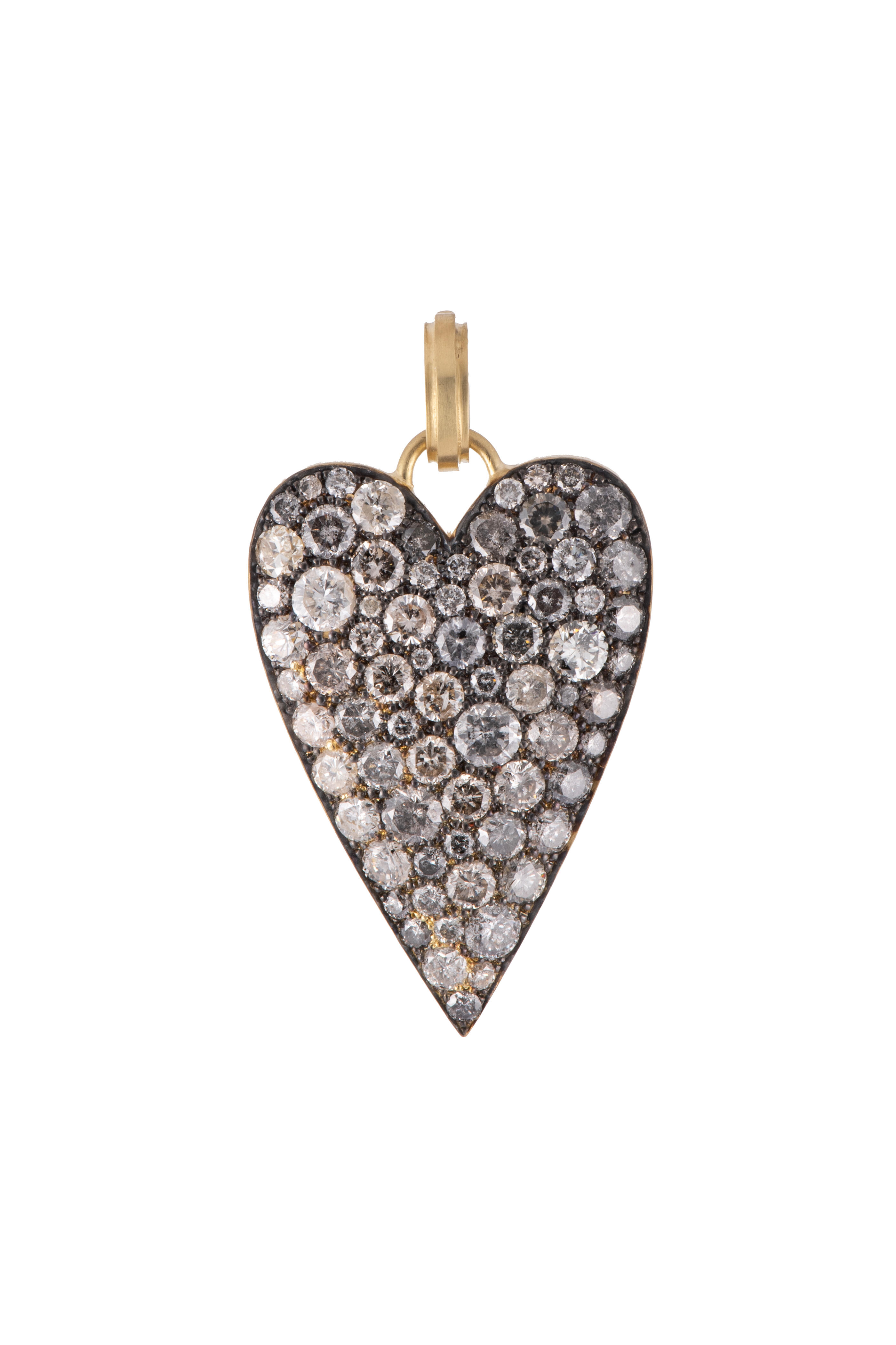 18k gold. Gray diamond. Heart design. Scattered diamond design. Prong setting. Hinge bail. Made in the USA.