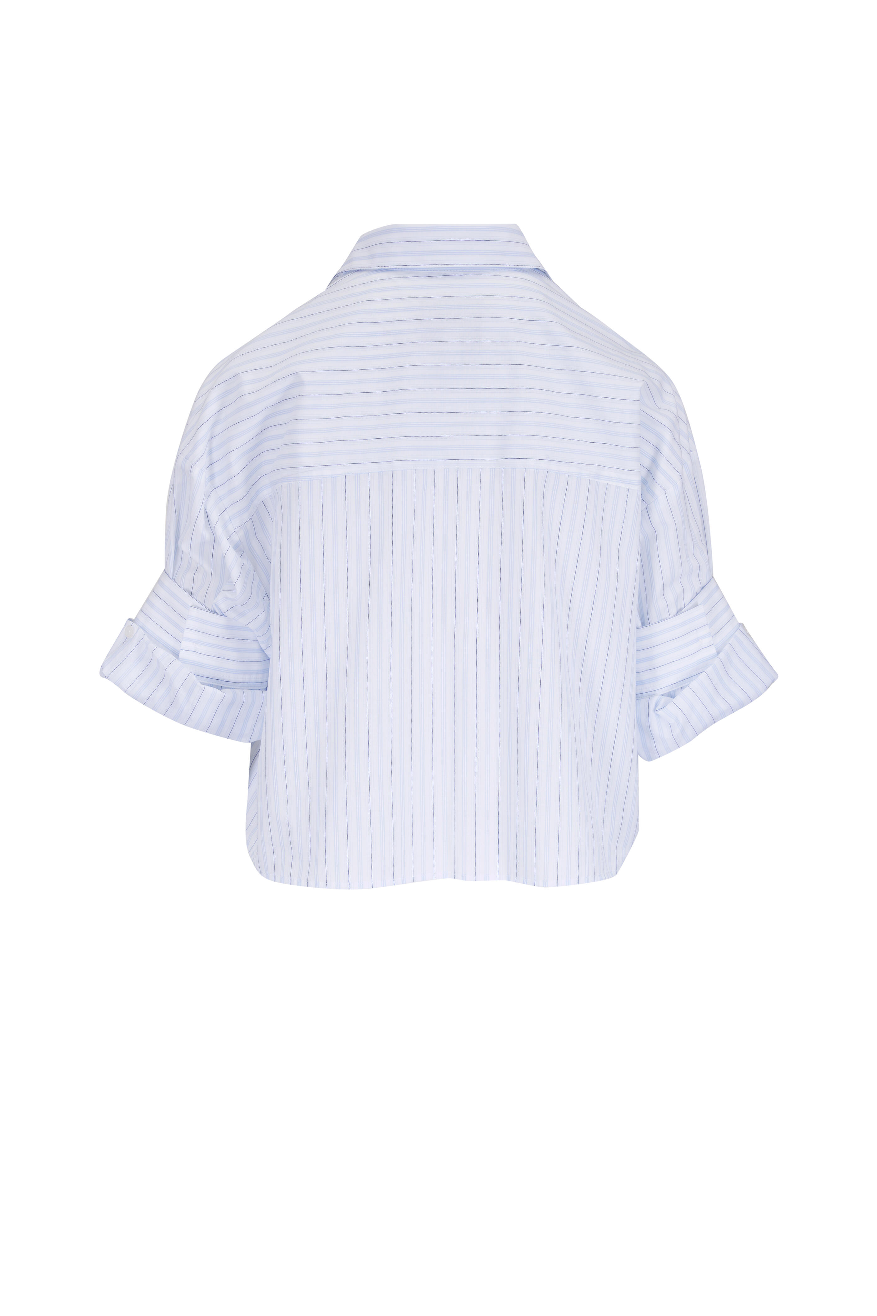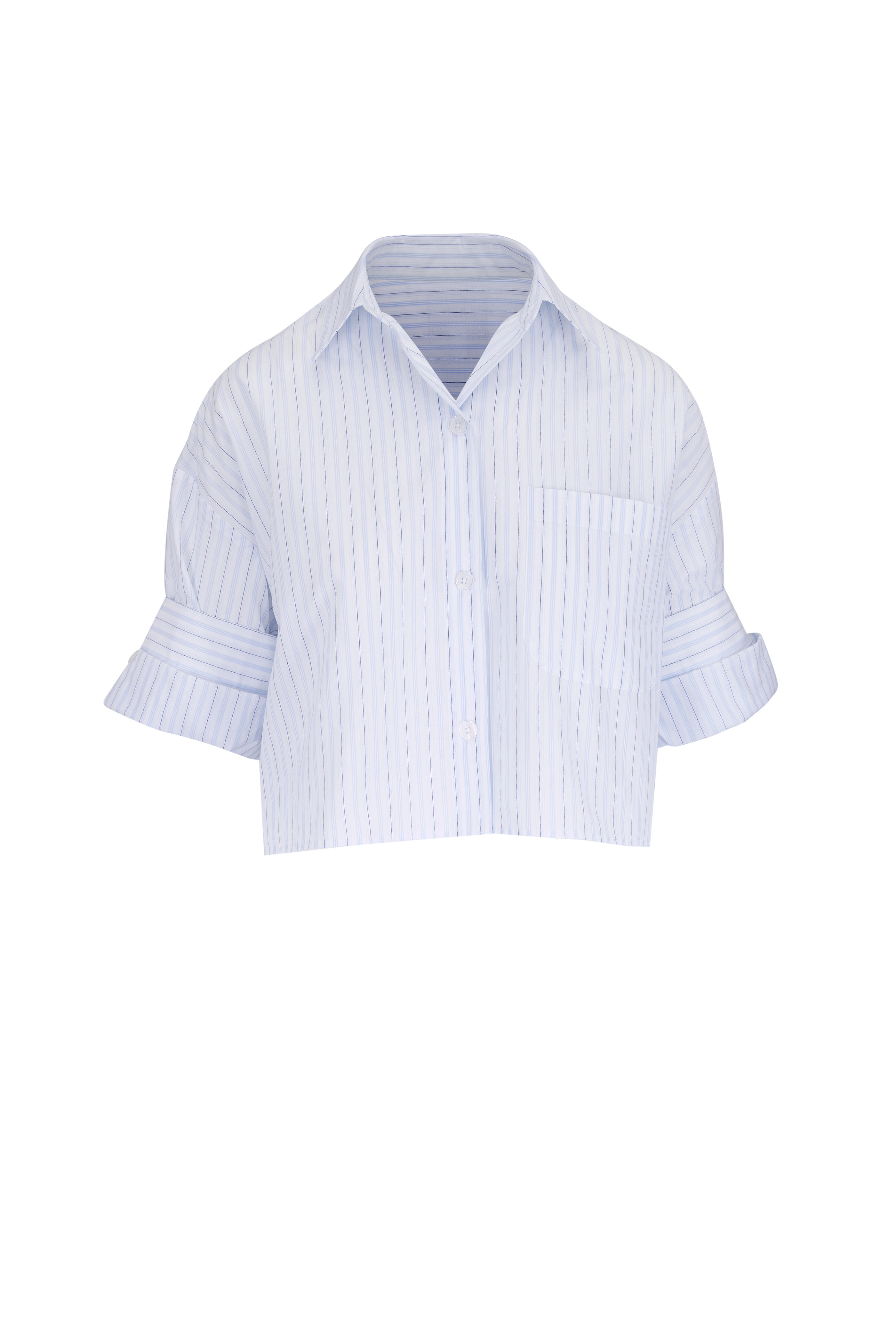 Spread collar. Front button placket. Chest patch pocket. Three-quarter sleeves; convertible cuffs. Cropped hem. Made in the USA. 100% cotton. Dry clean.
