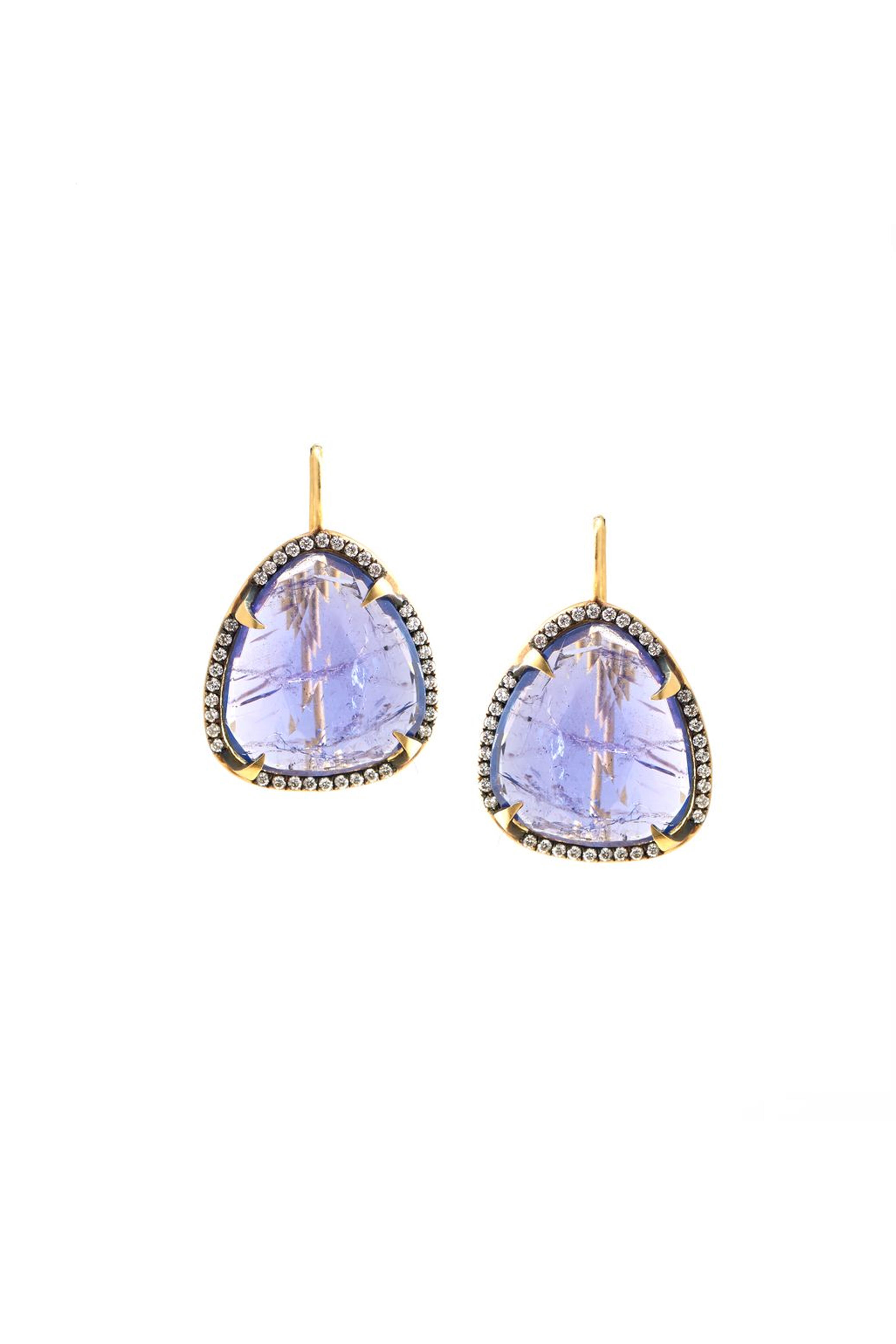 18k gold. Diamond. Tanzanite. Teardrop shape design. Diamond halo. Prong setting. Drop style. Wire back. Made in the USA.
