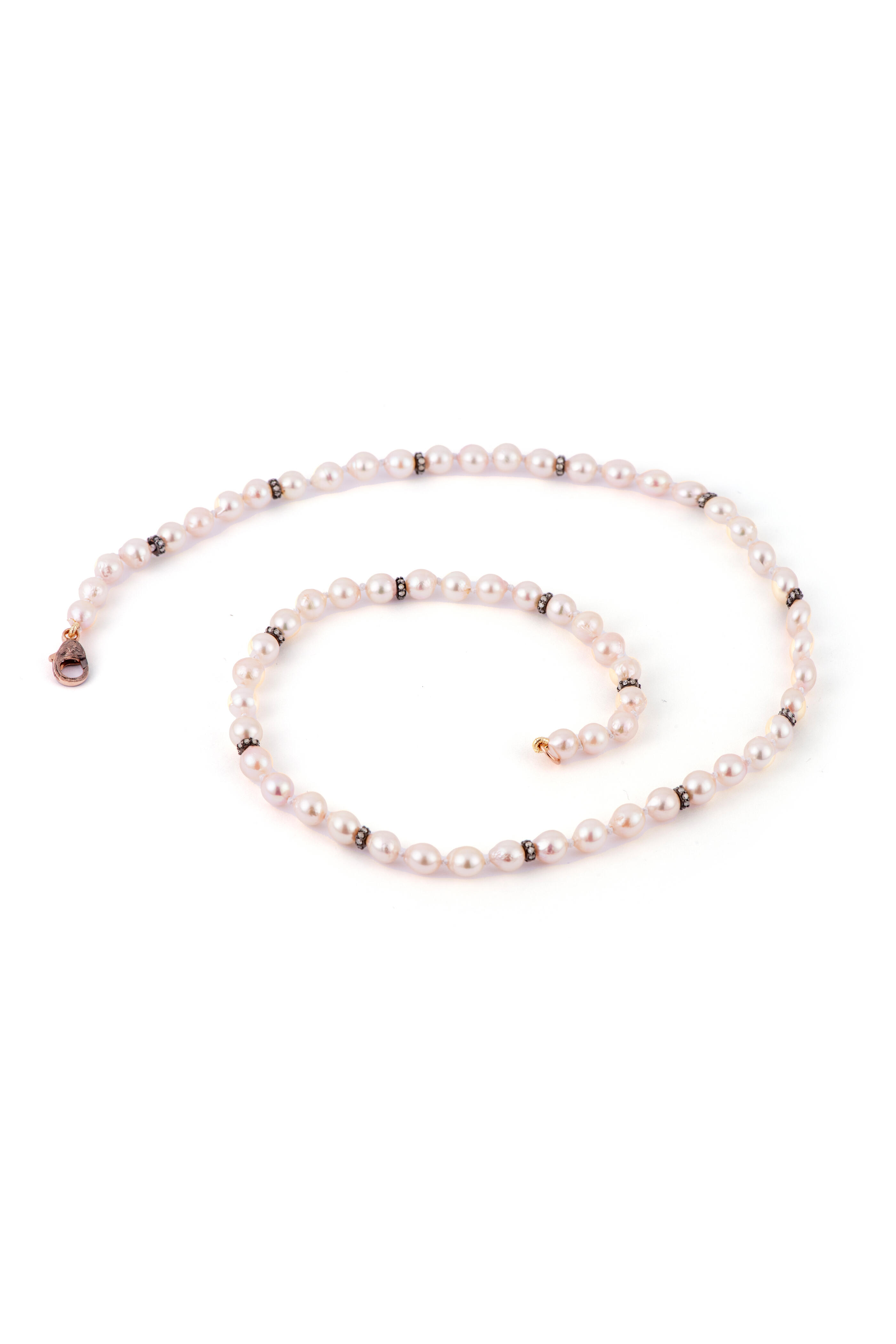 14k rose gold. Diamond. Pearl. Beaded. Lobster claw clasps. Made in the USA.