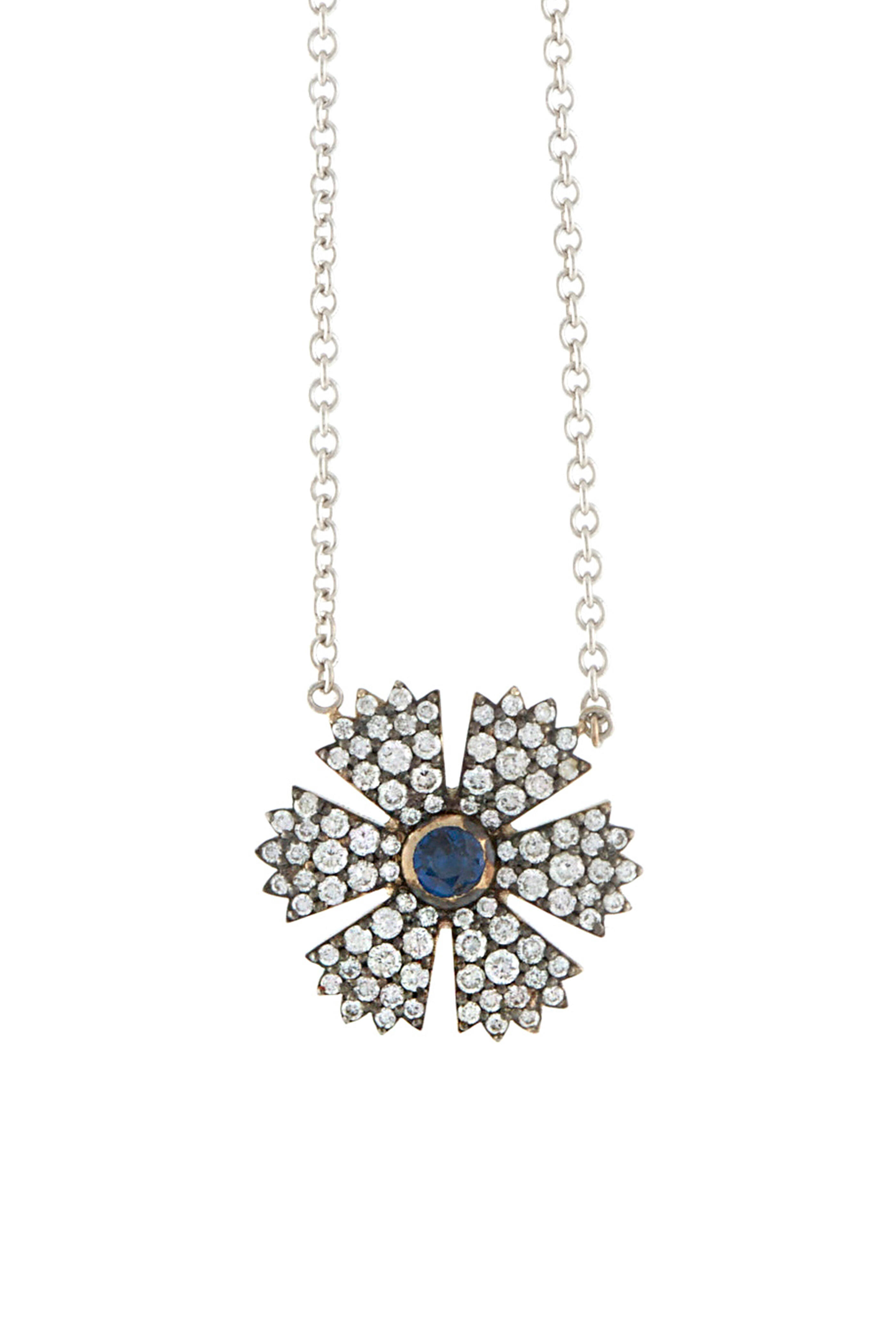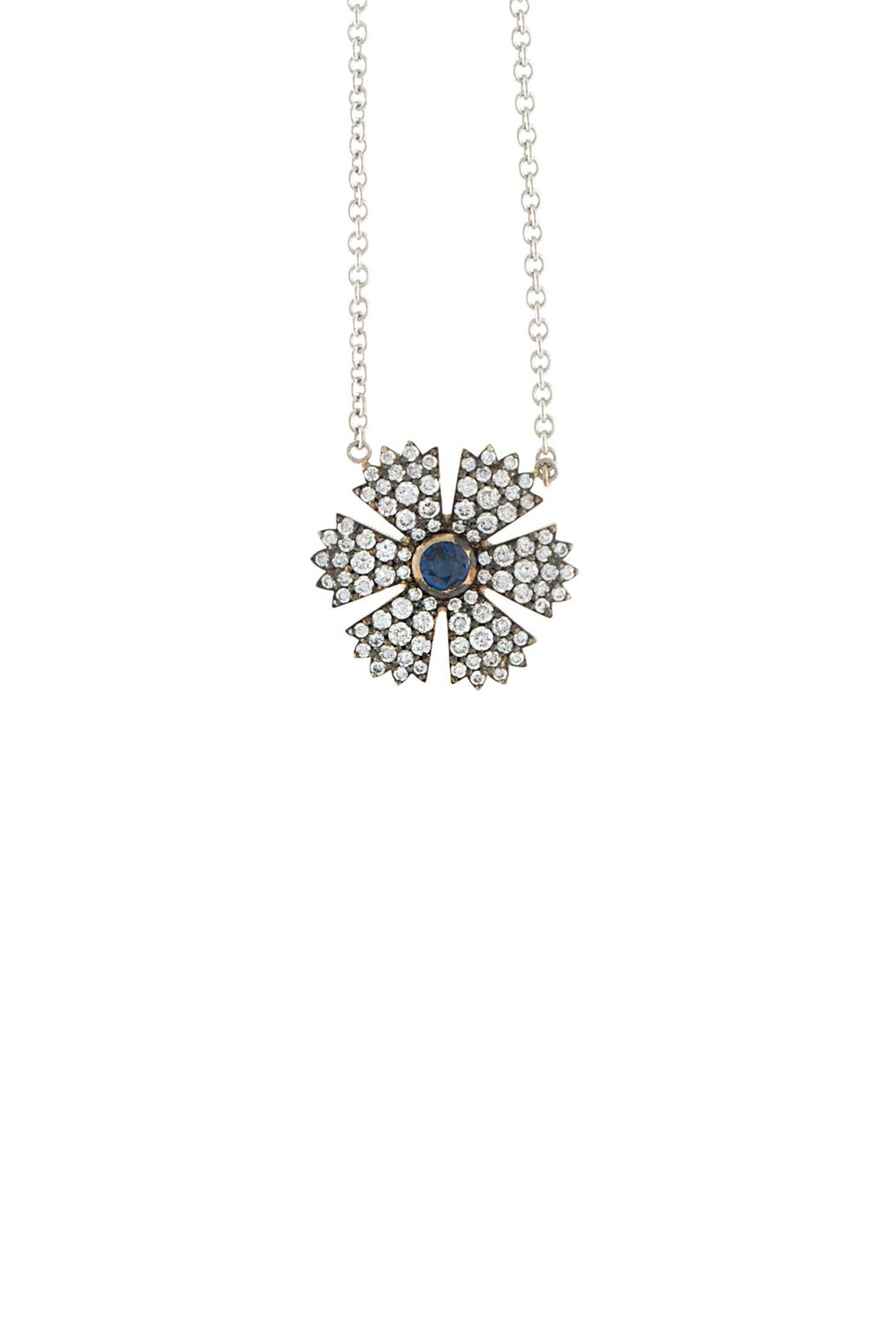 18k white gold. Diamond. Flower design. Engrave detailing. Cable chain. Prong setting. Lobster claw clasps. Made in the USA. Length: 20”.