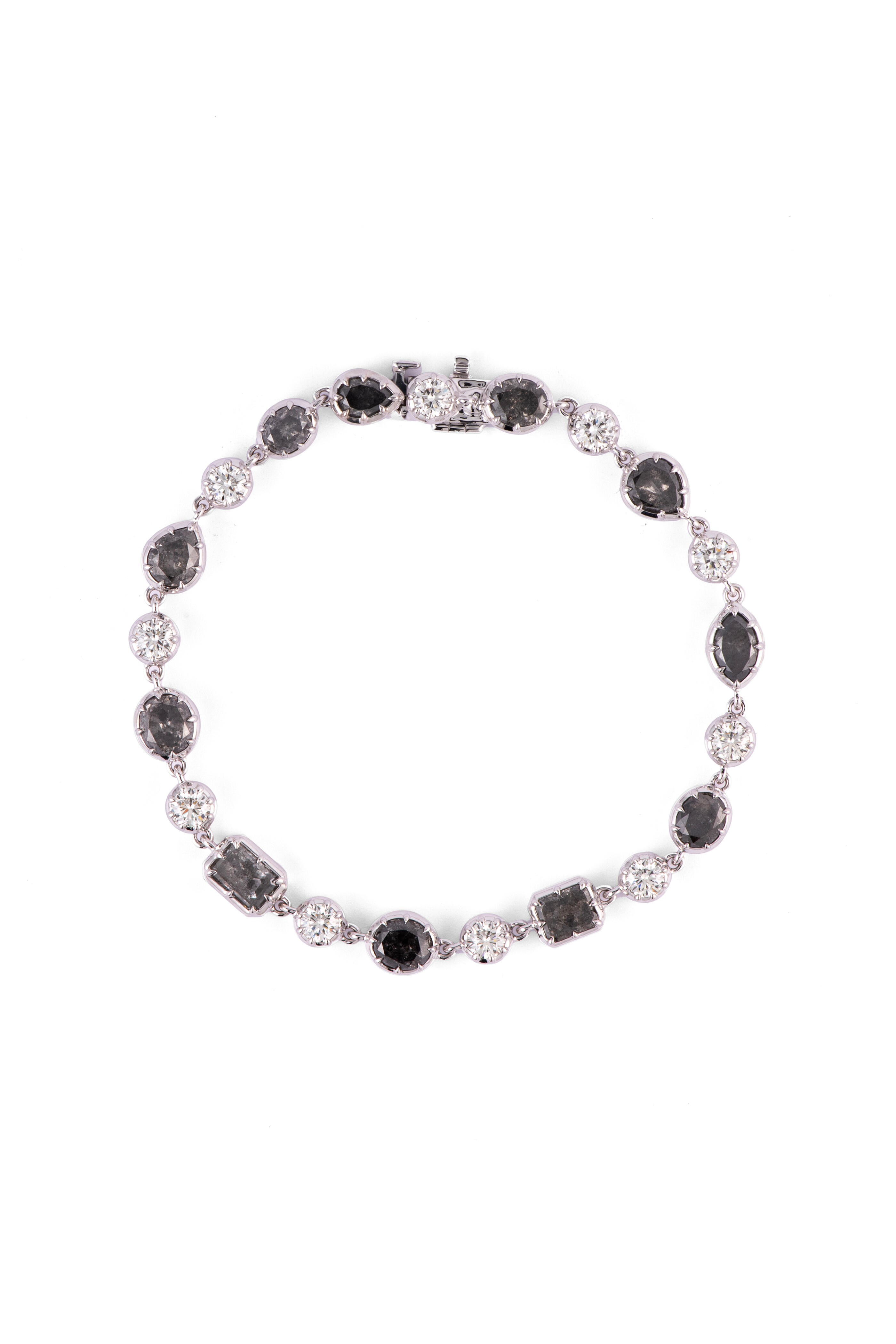 18k white gold. White diamond. Gray diamond. Mixed cut gemstones. White gold bezel. Prong setting. Box clasps. Made in the USA.