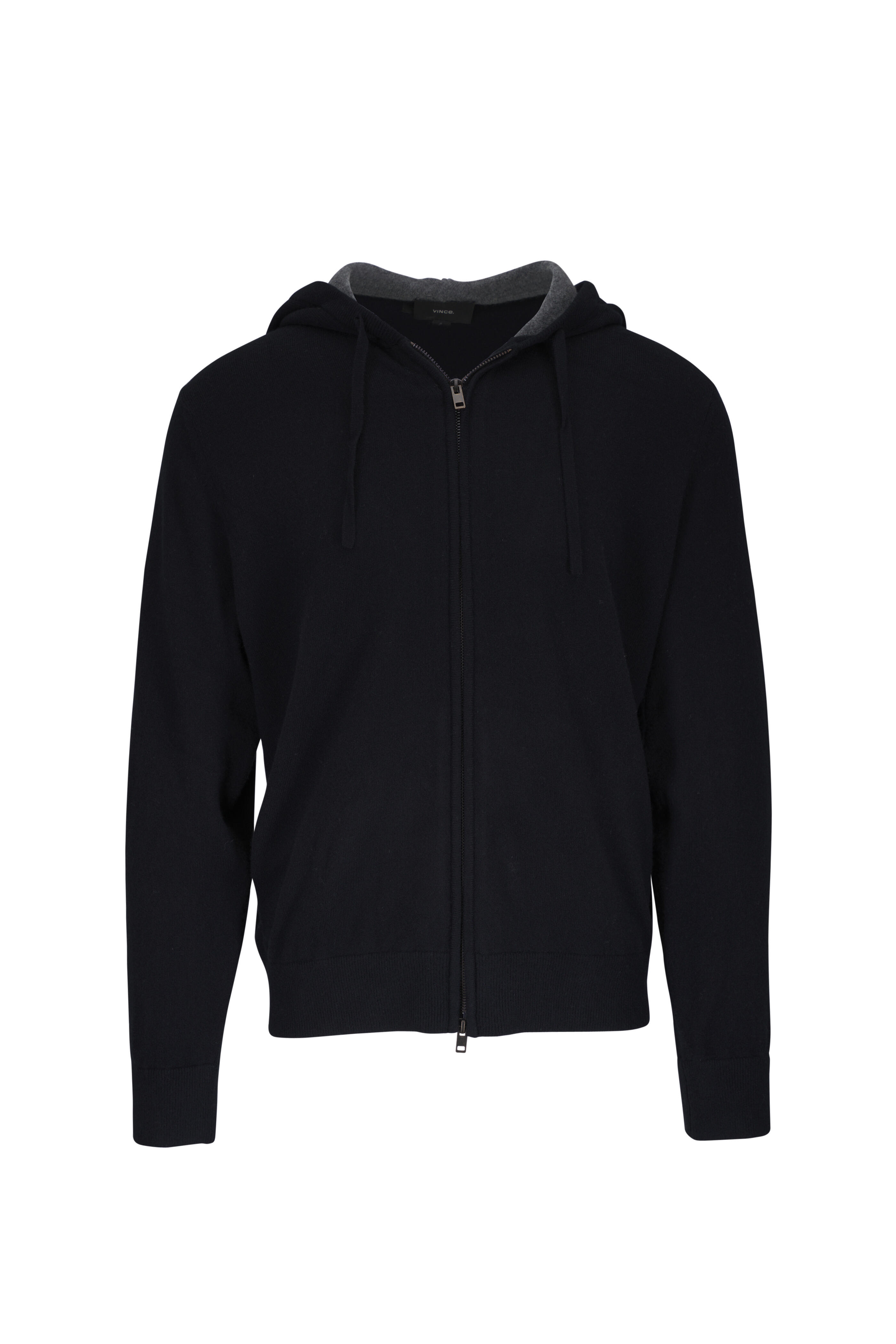 Attached hood with drawstring. Two-way zip placket. Side slip pockets. Ribbed knit trim. Imported. Shoulder to hem 29" (size l). 100% Cashmere. Hand wash.