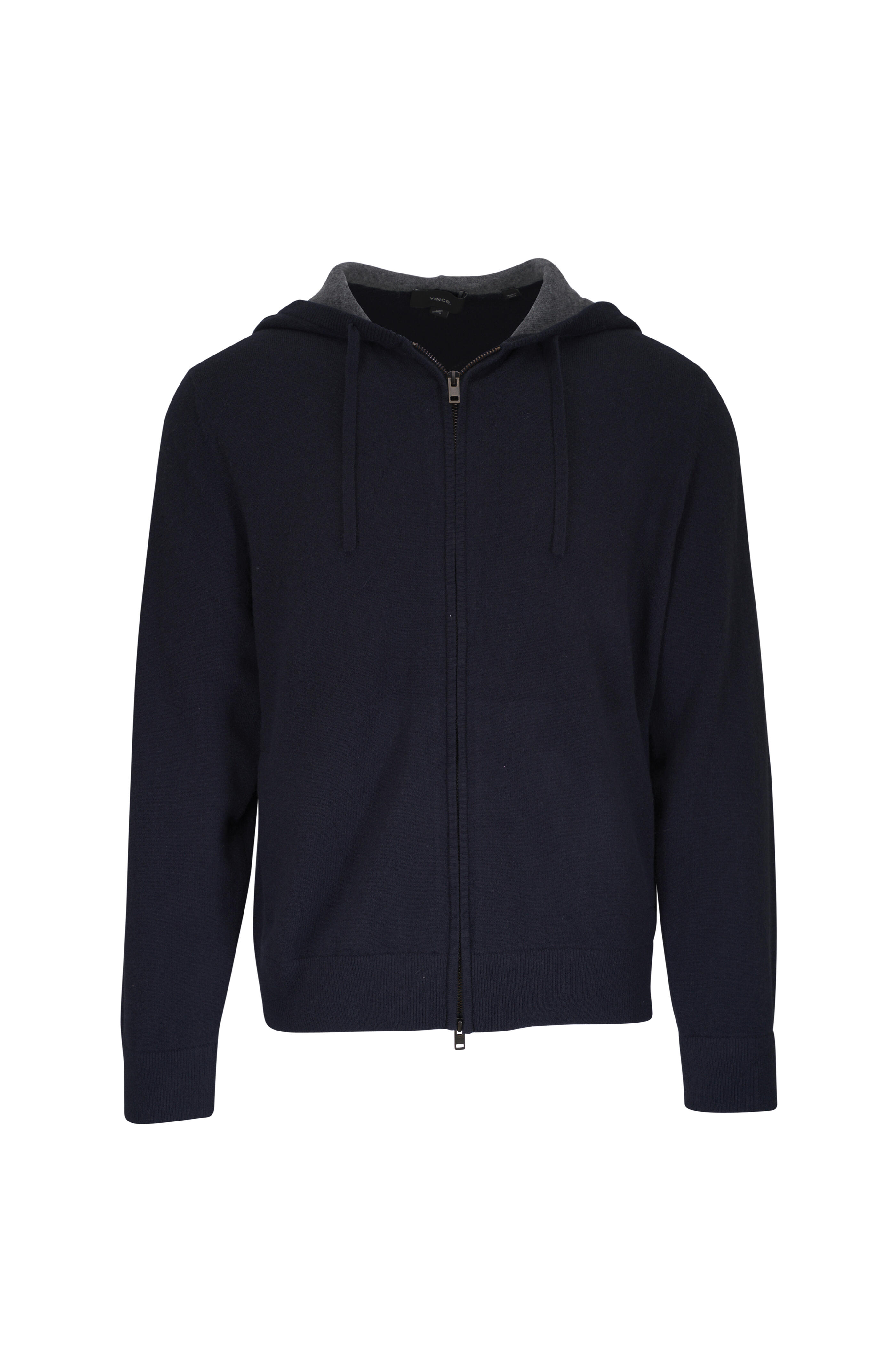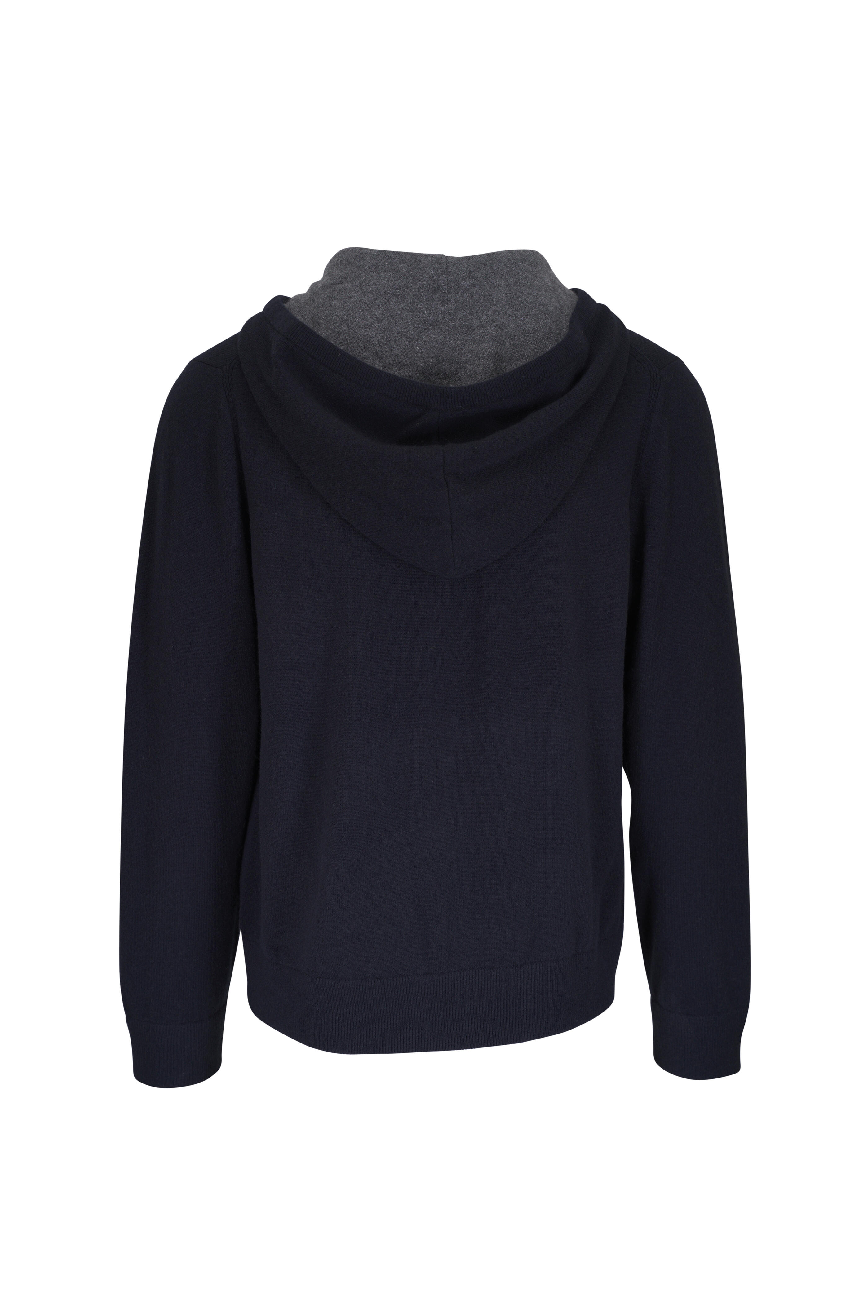 Double-faced drawstring hood. Two-way zip. Ribbed knit trim. Imported. Color: Coastal blue/medium heather grey. 100% cashmere. Hand wash.