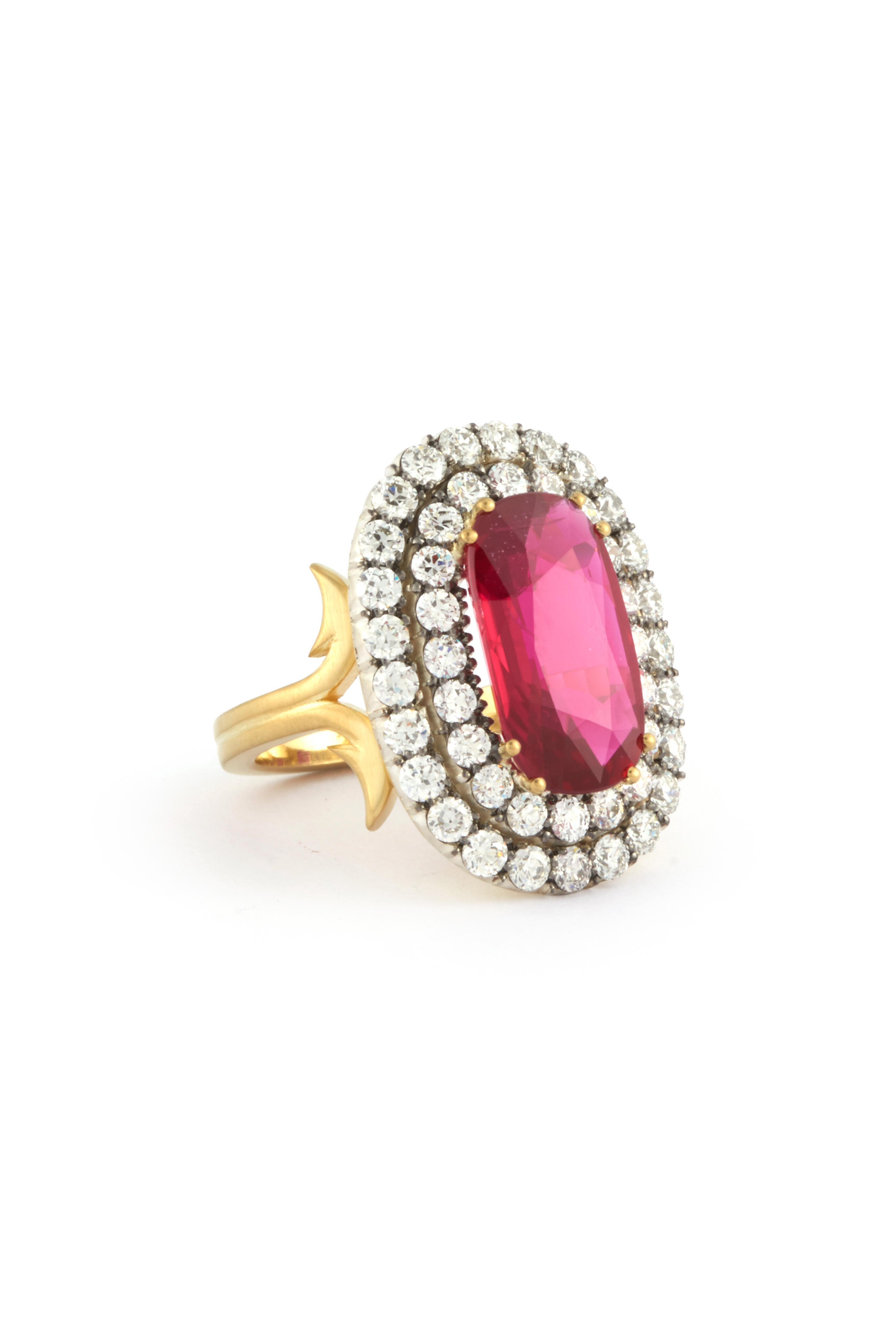 18k Yellow Gold. 5.94 ct Thai Ruby. 2.3 ct Oval Old Euro Cut Diamond. 7.5 Ring.