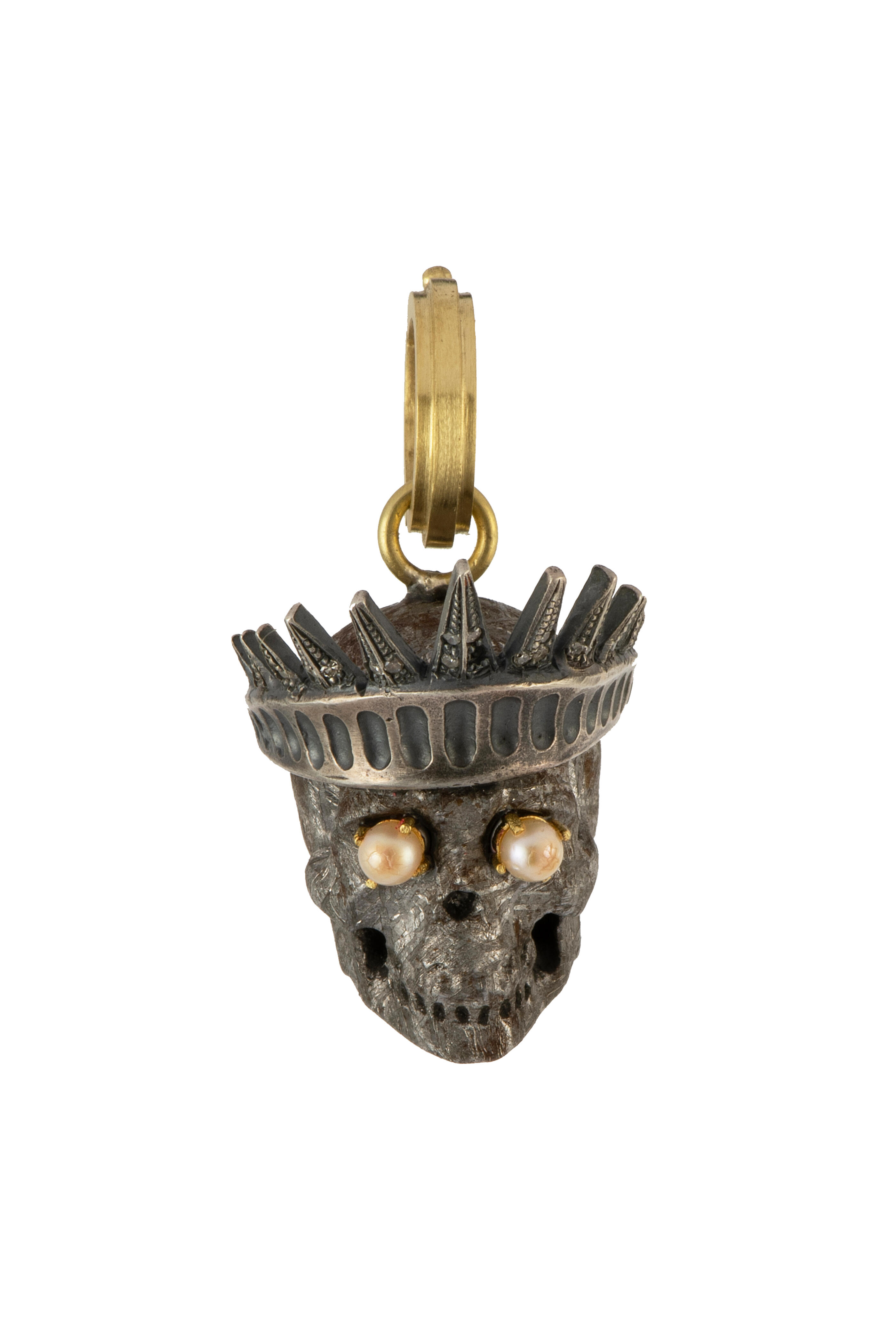 18k gold. Diamond 0.10 total carat weight. Pearl. Skull design. Crown design. Pearl eyes. Hinge bail. Made in the USA.