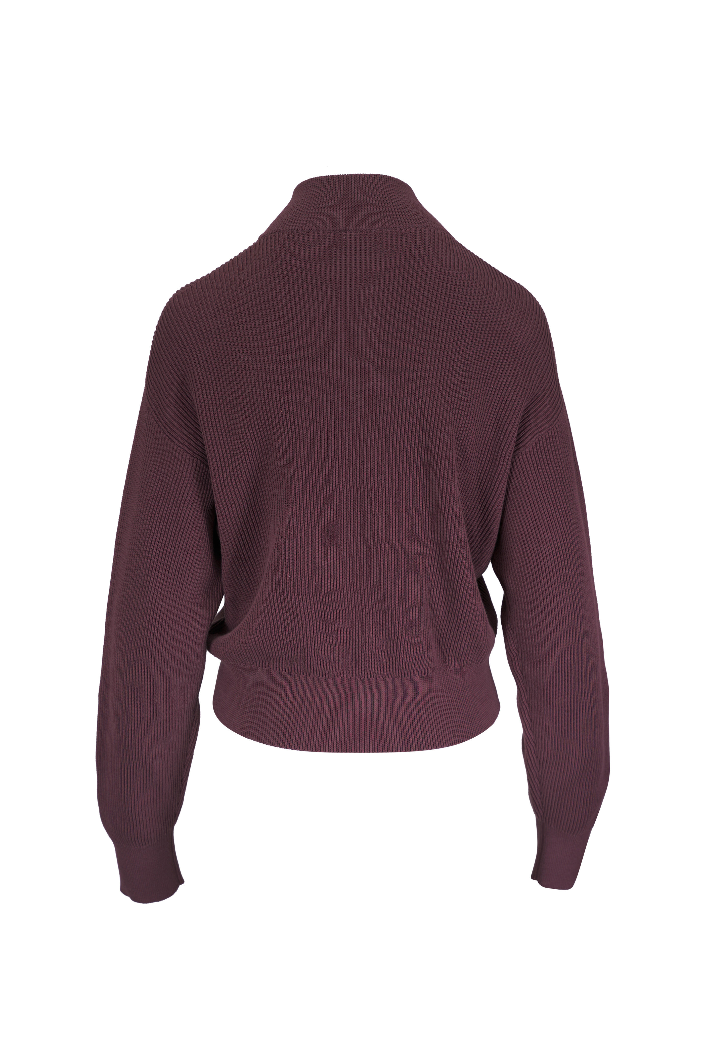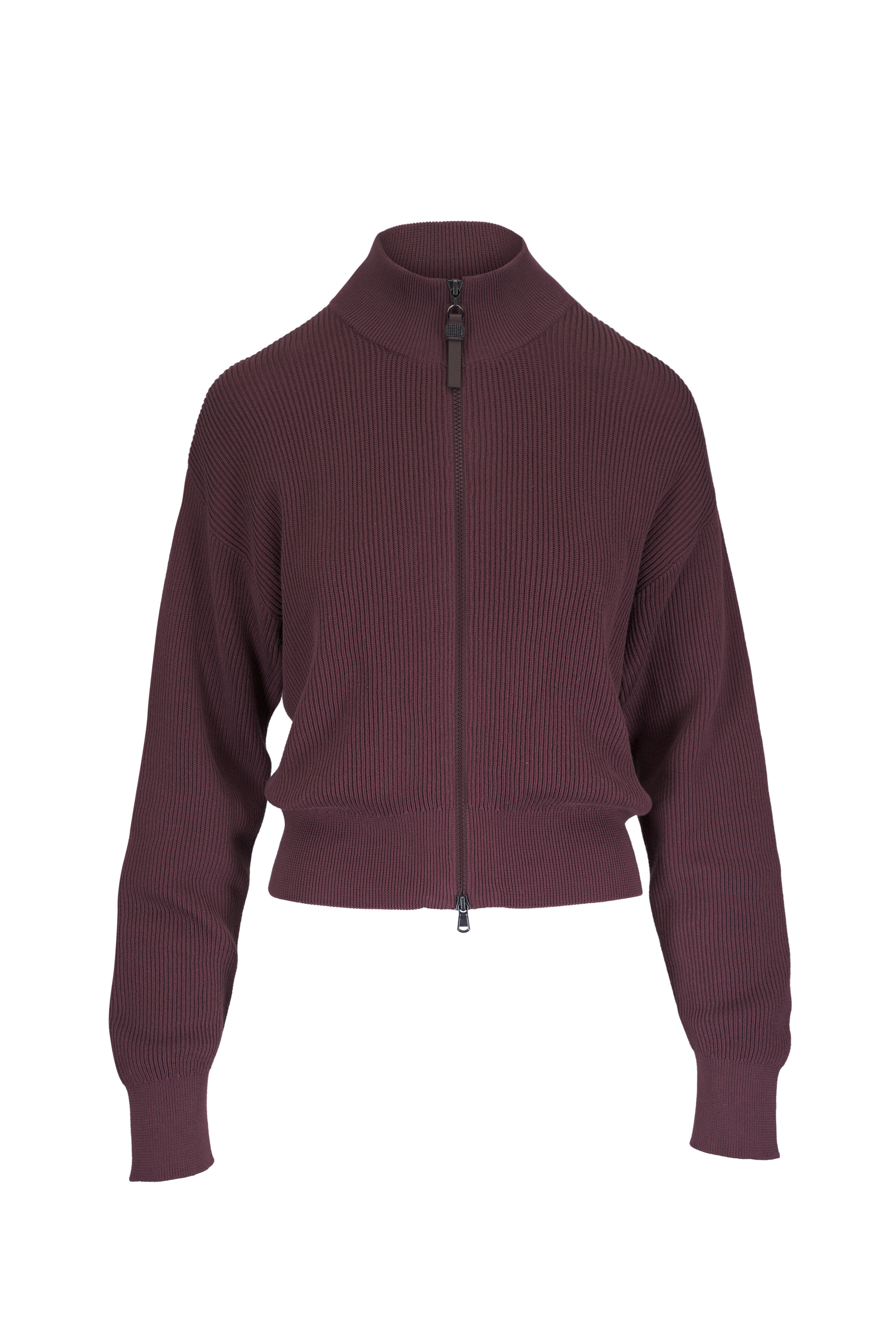 Mock neckline. Front two-way zip placket; monili detailed leather pull. Ribbed throughout. Made in Italy. Approx. 22" shoulder to hem. 100% cotton. Dry clean.