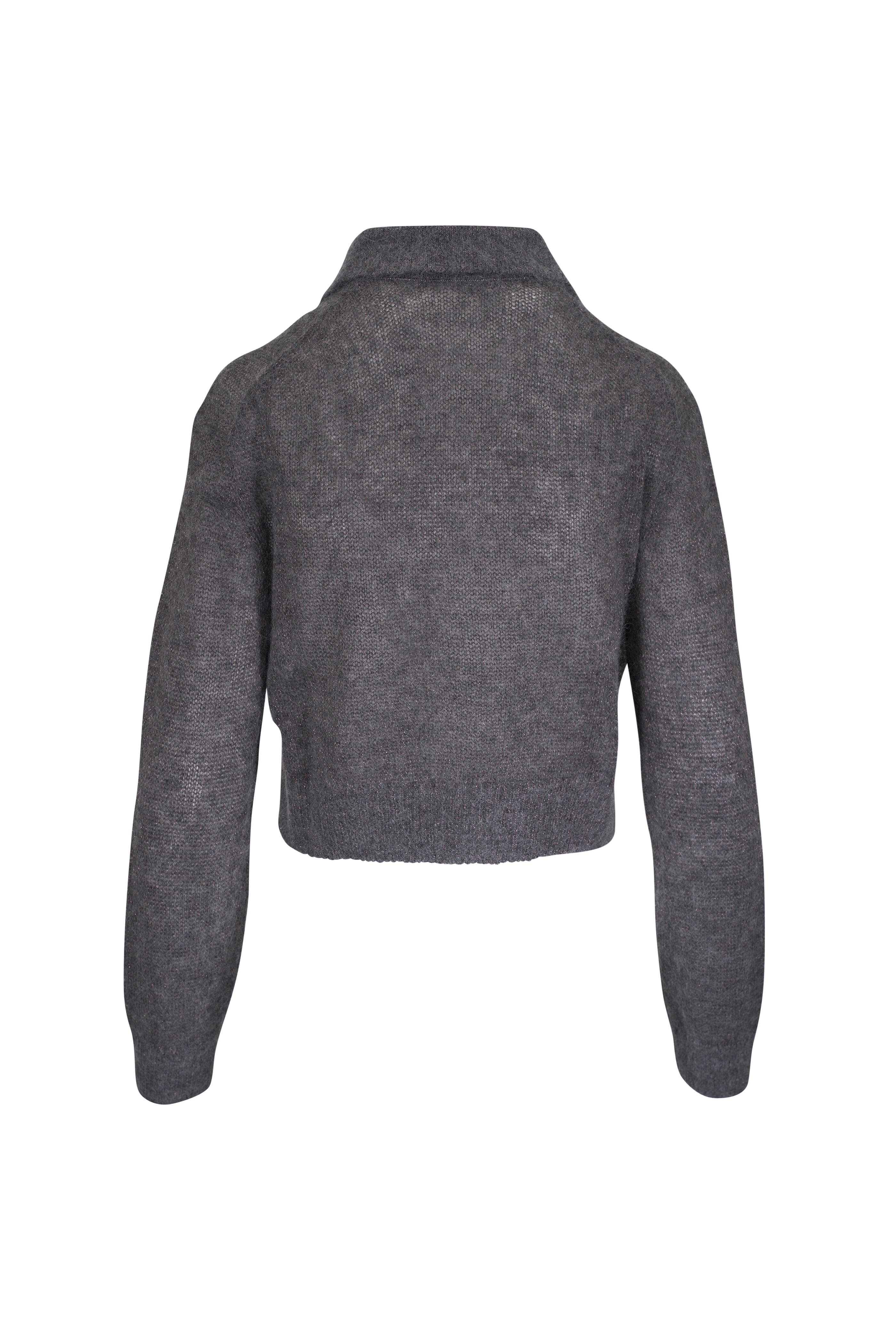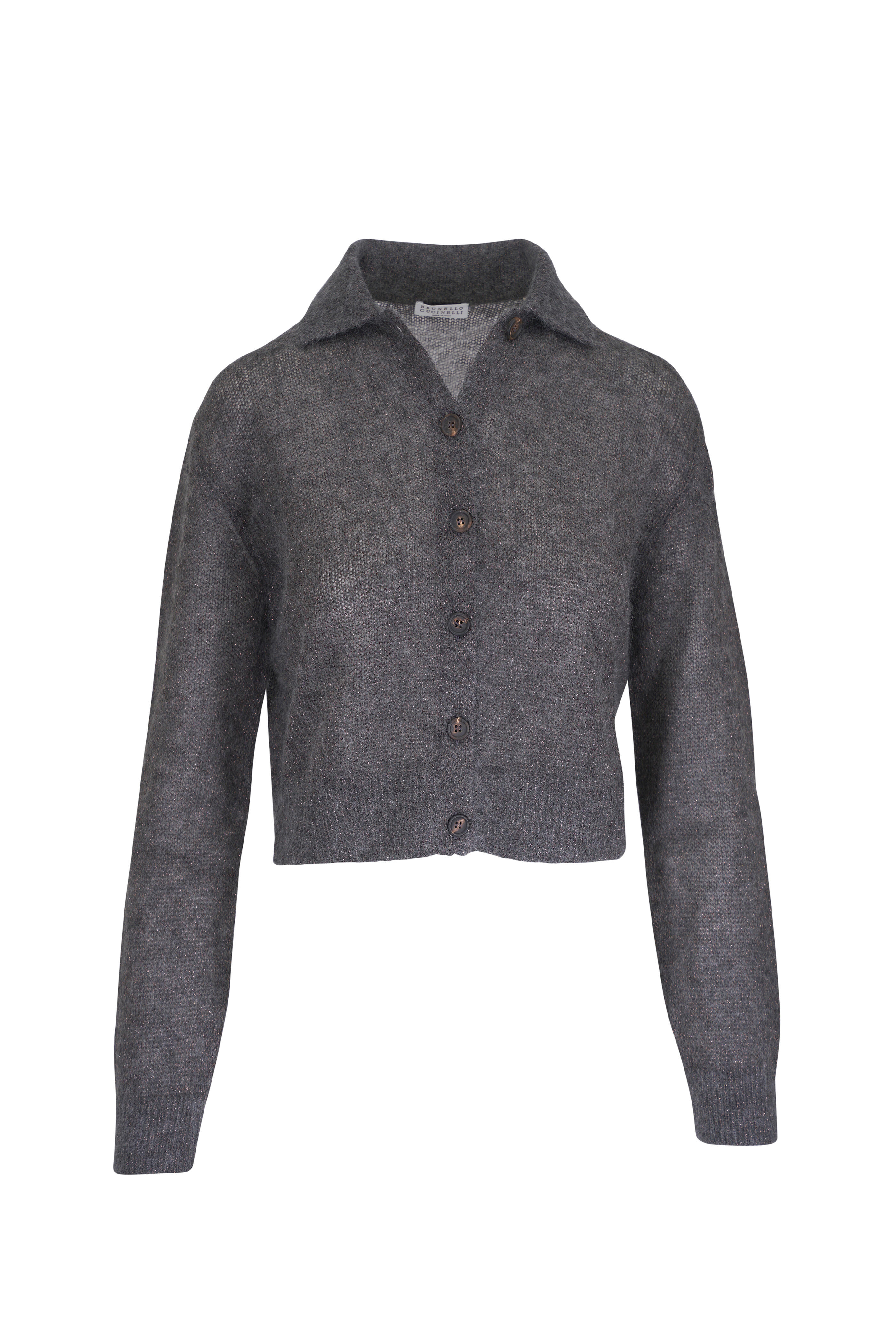 Spread collar. Front button placket. Ribbed trims. Made in Italy. 42% mohair, 38% polyamide. Dry clean.