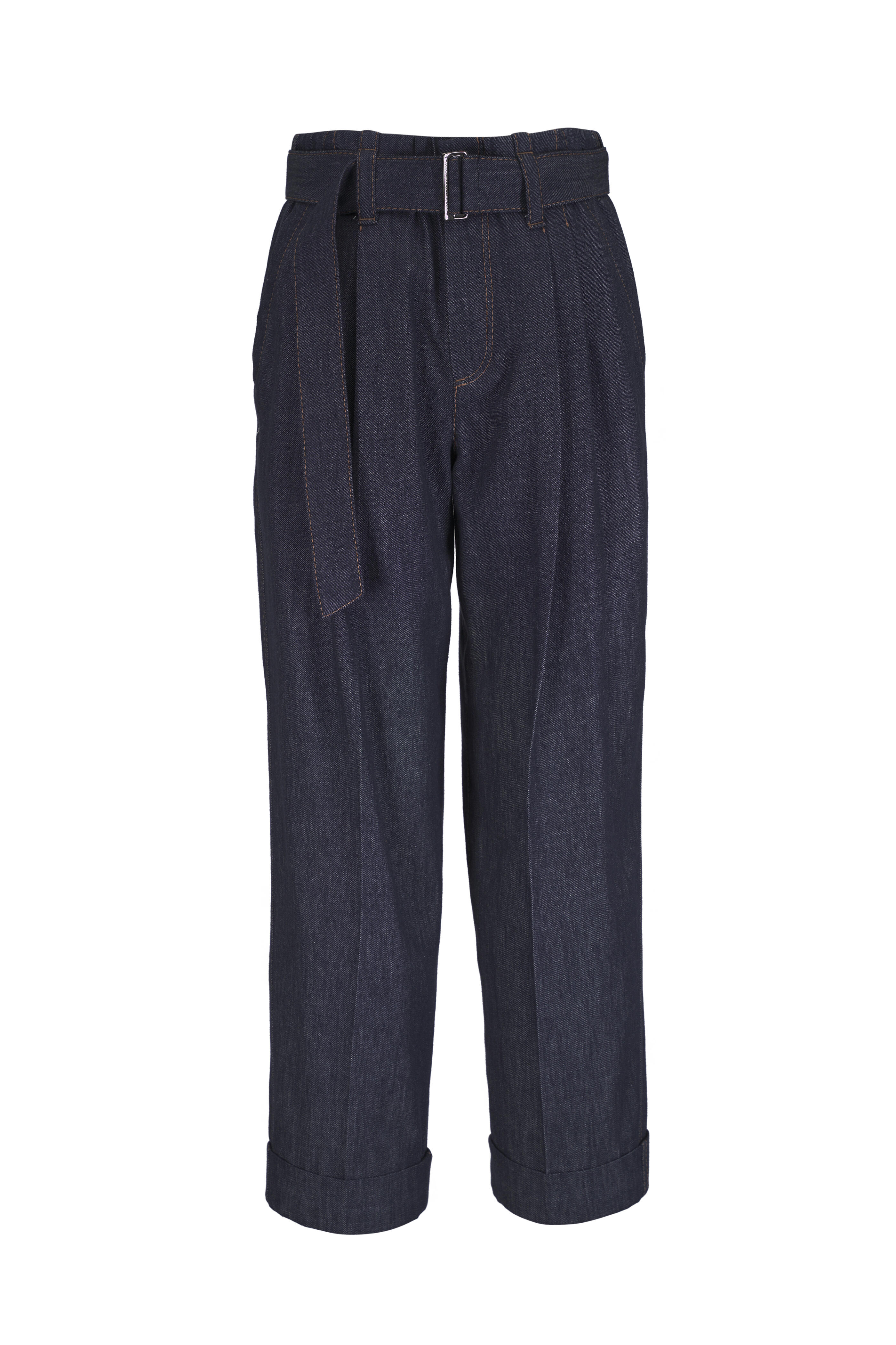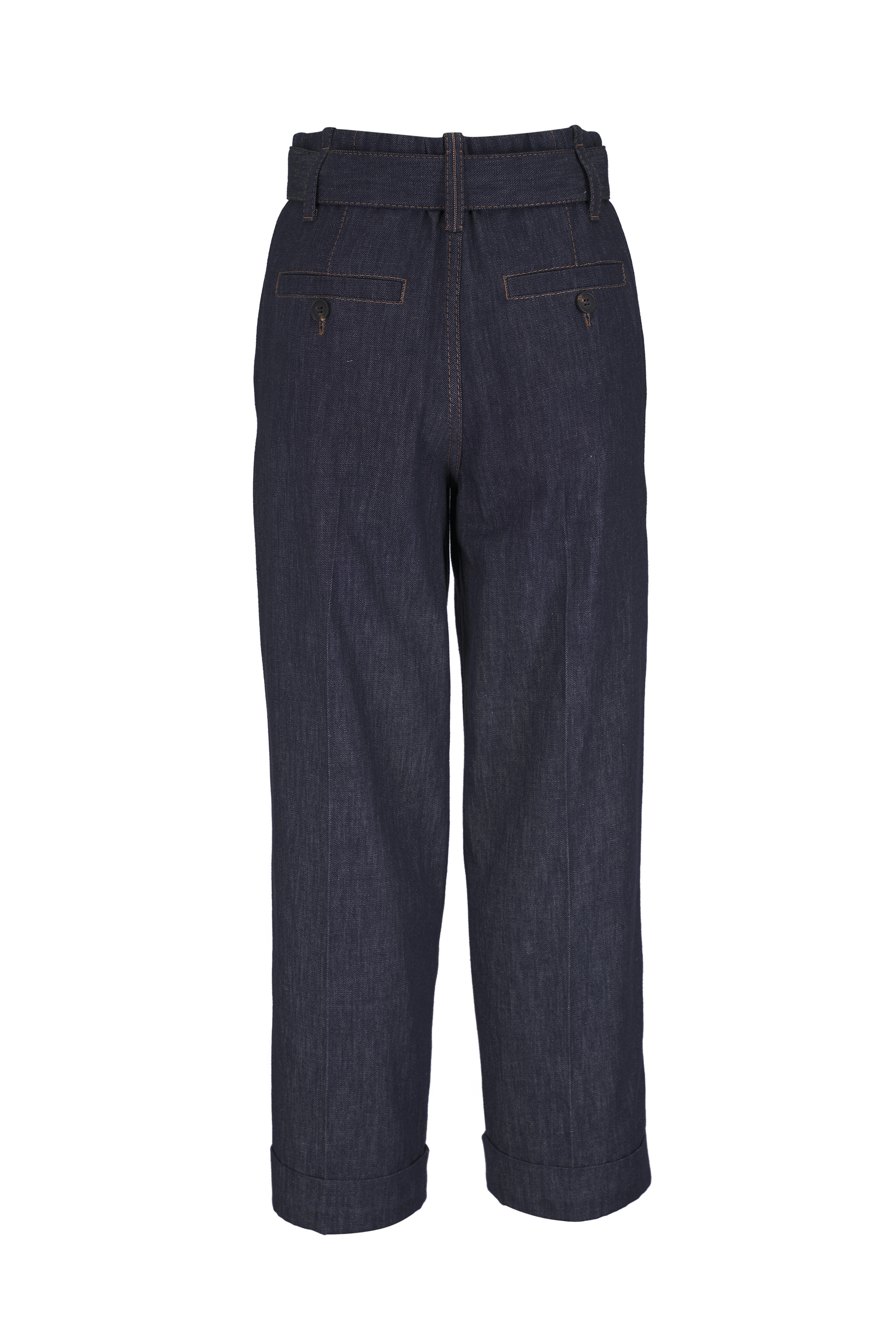Adjustable belt; zip fly; double button closure. Front slip pockets; back welt pockets. Nickel-free monili decoration. Pleat. Cuffed hem. Made in Italy. 26" Inseam (size 0). 100% Cotton. Machine wash.