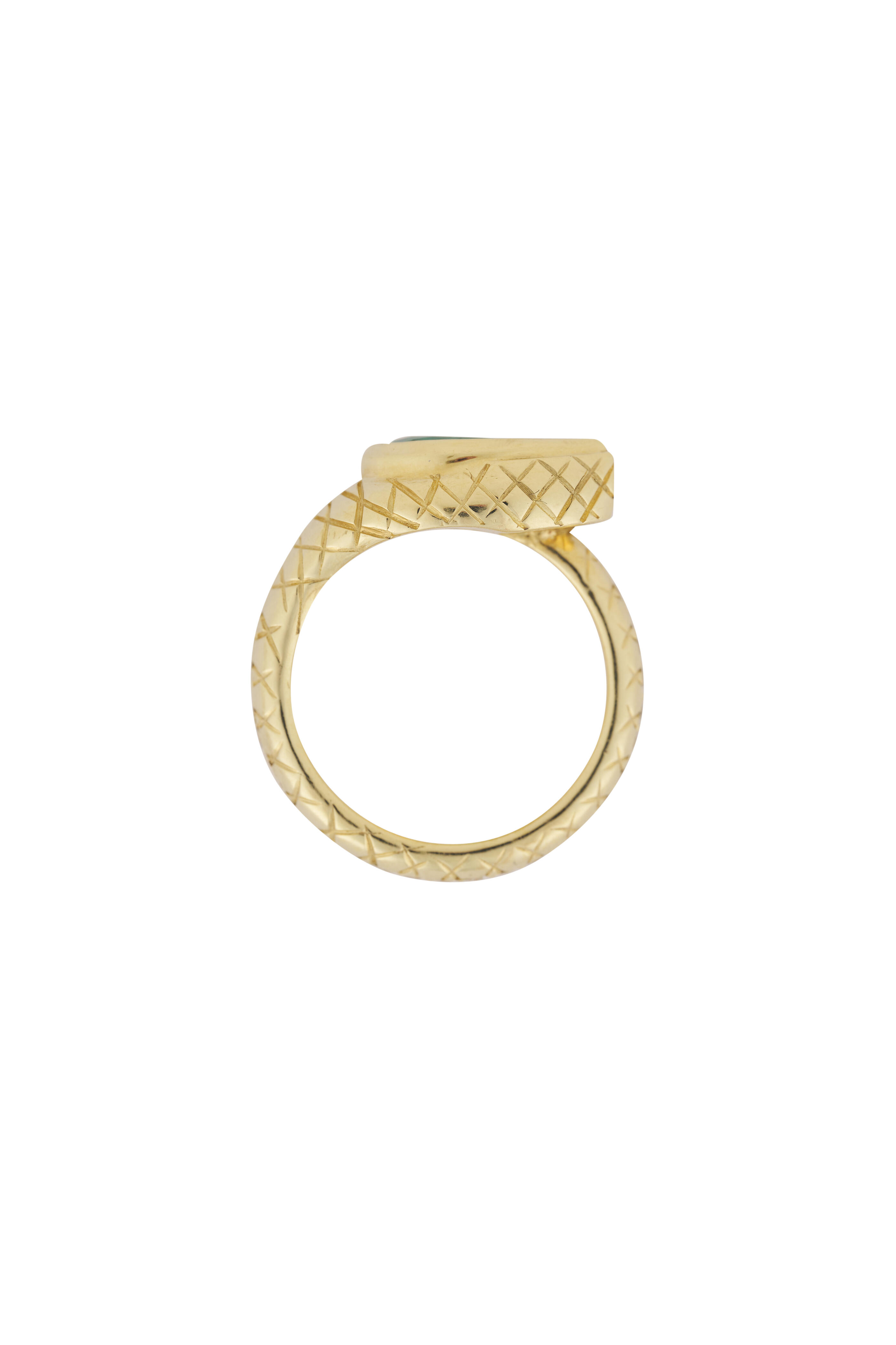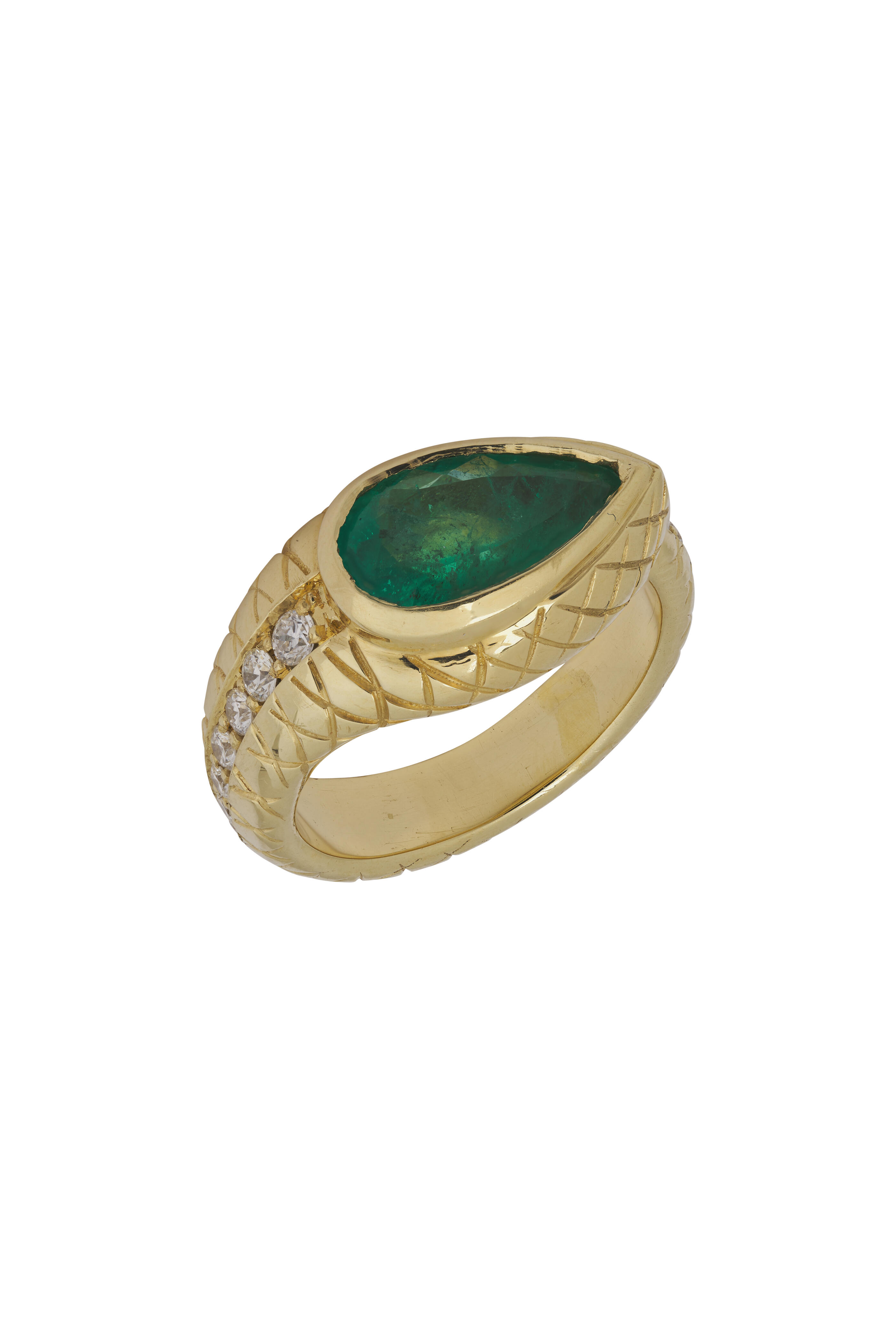 18kt yellow gold. Diamond. Emerald 1.12 total carat weight. Snake design. Engraved detailing. Band style. Imported. Call for ring size.