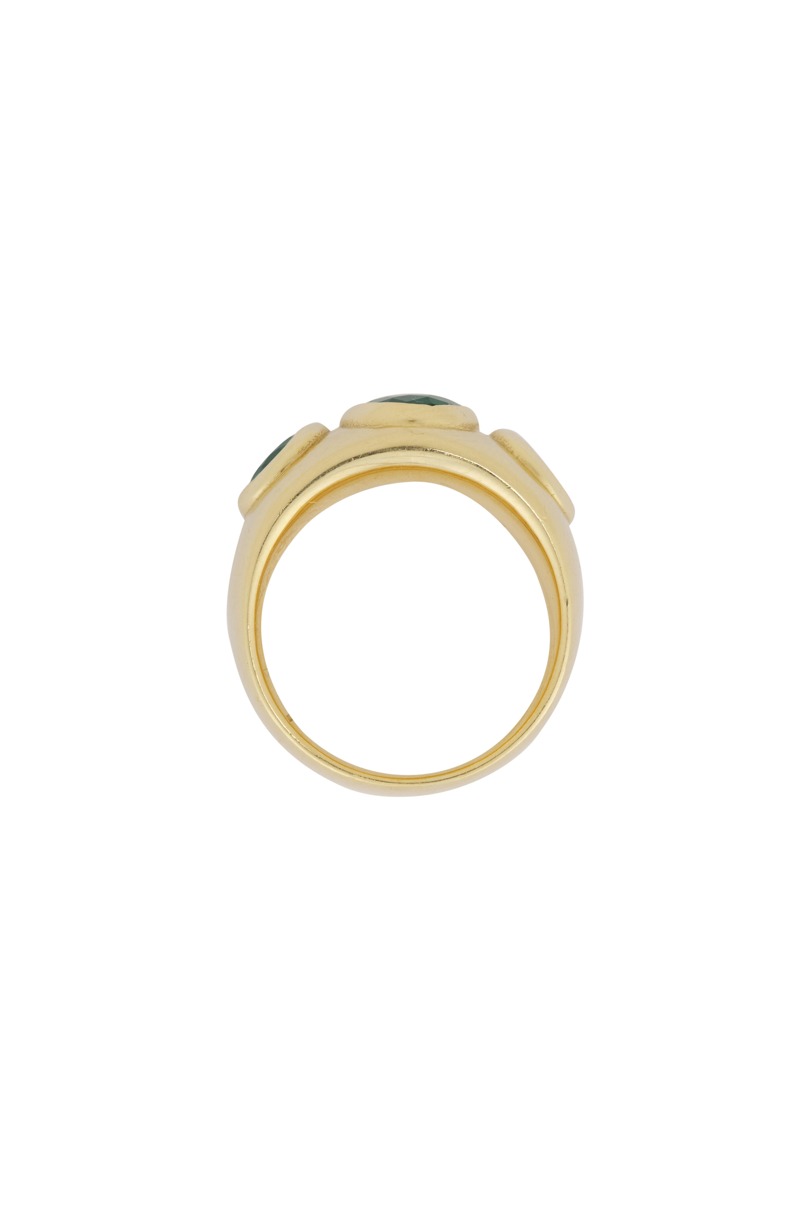 18k yellow gold. Emerald 2.05 total carat weight. Oval cut gemstones. Gold bezel. Cigar band style. Imported. Face width: 12.6mm. Call for ring size.