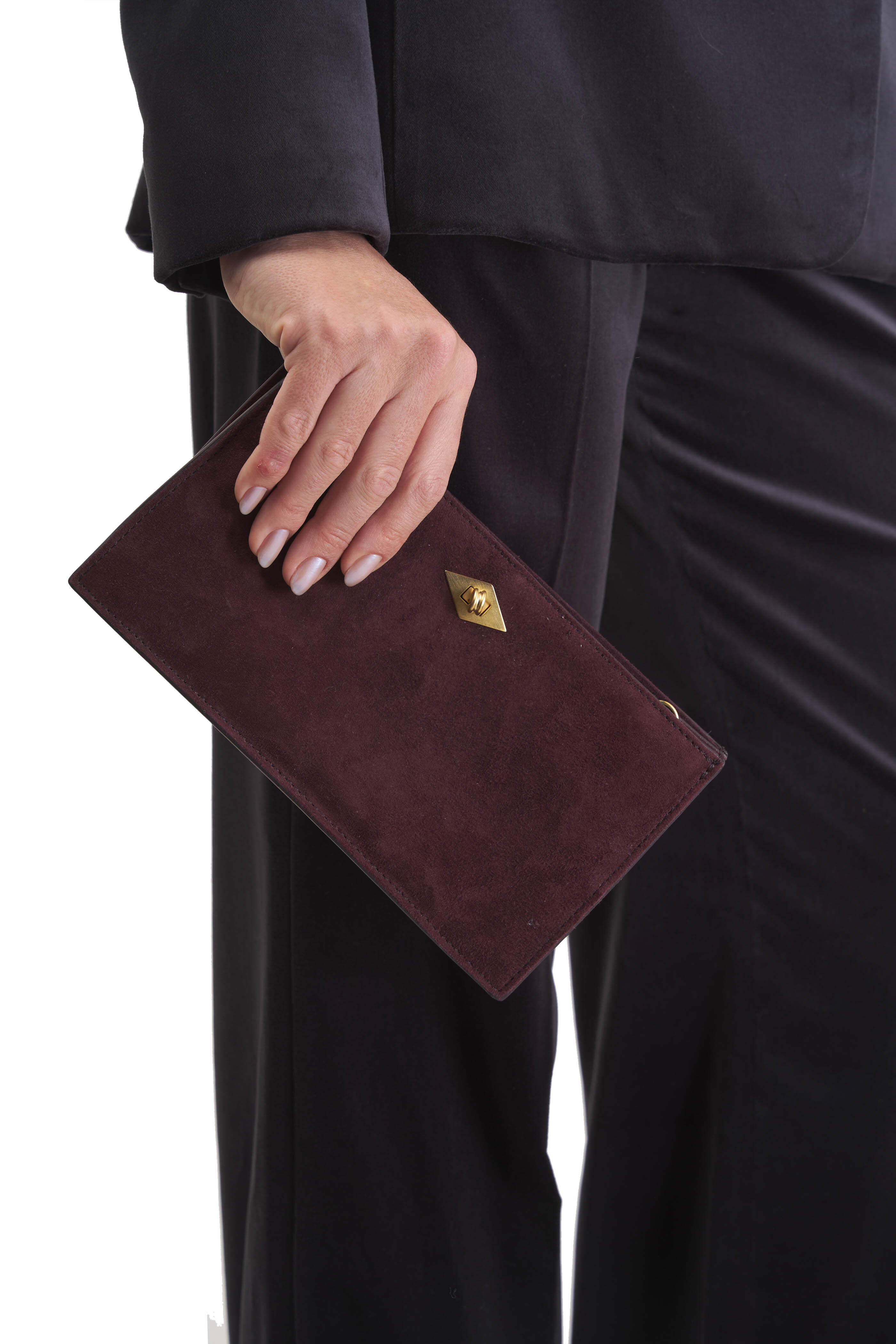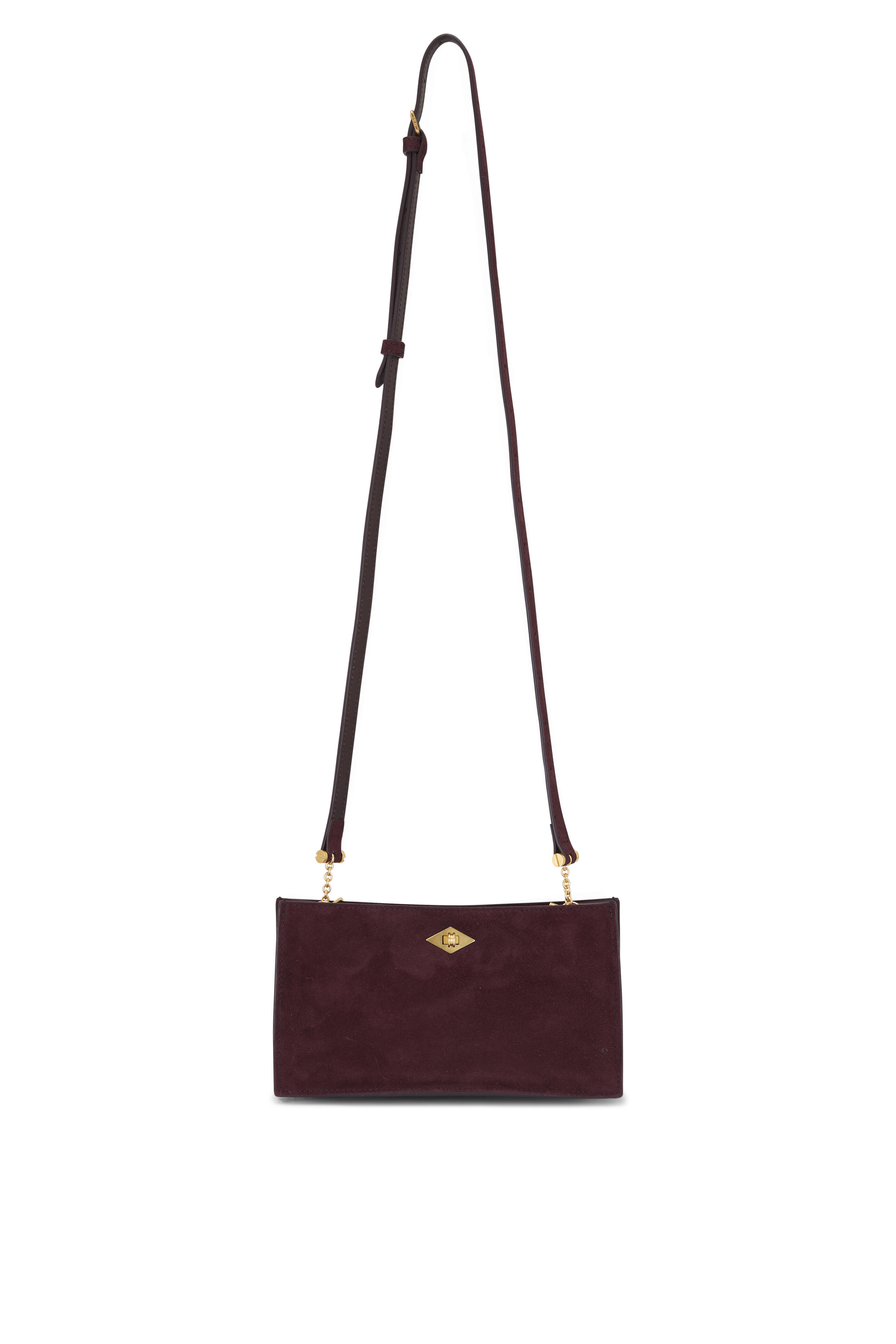 Suede. Adjustable and removable crossbody strap. Signature turn-lock closure. Internal zip pocket. Made in Italy. Color: Amarone. Width at Base: 9.1”. Width at Top: 9.1”. Depth: 2.0”. Height: 4.9”. Weight: 0.53lbs.