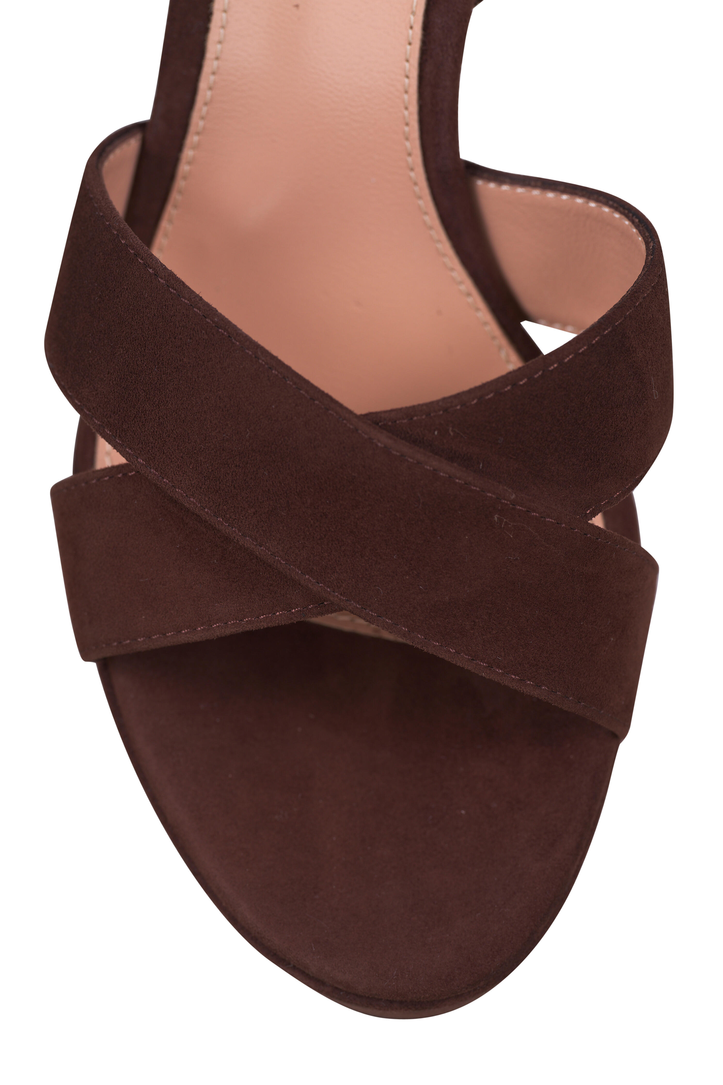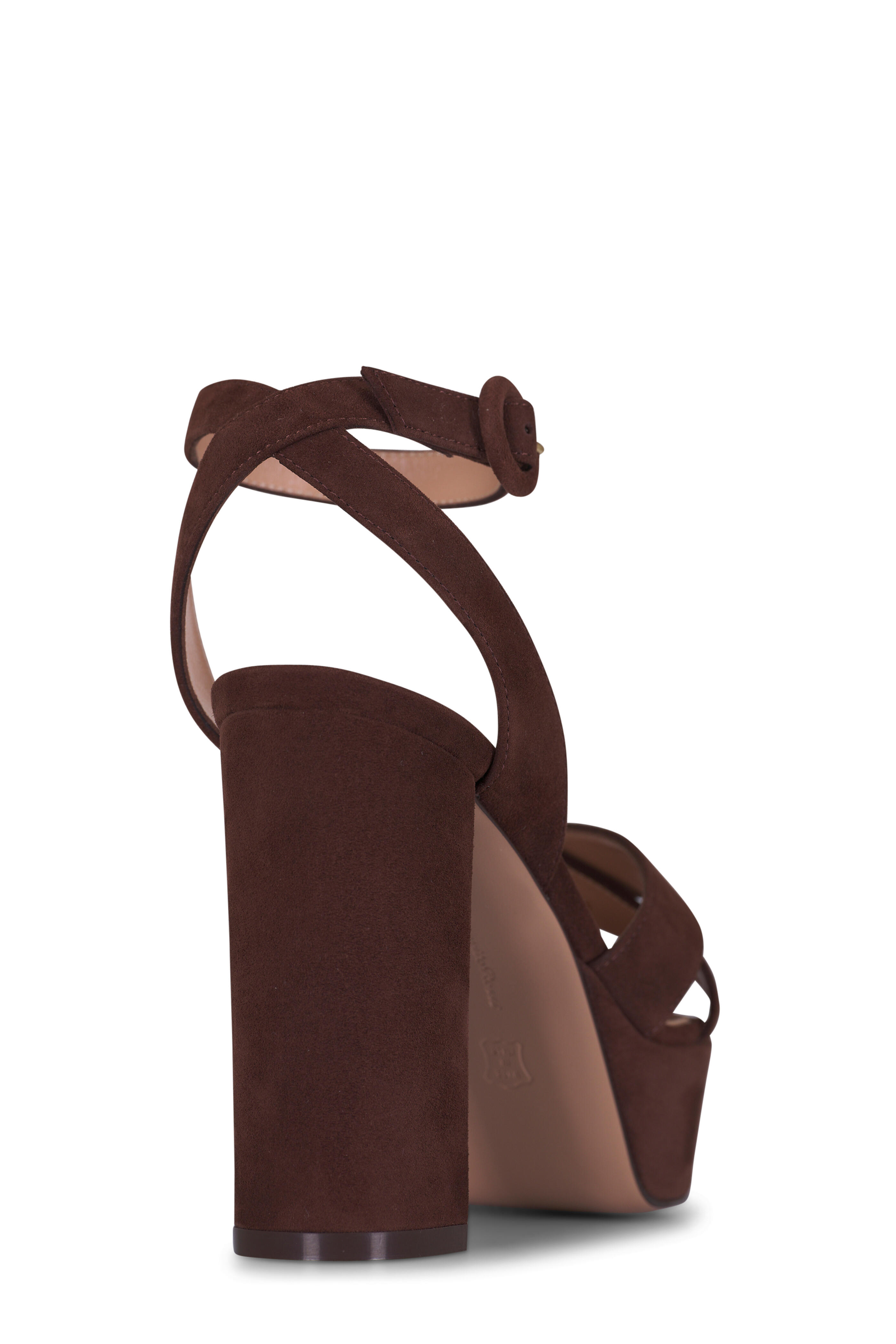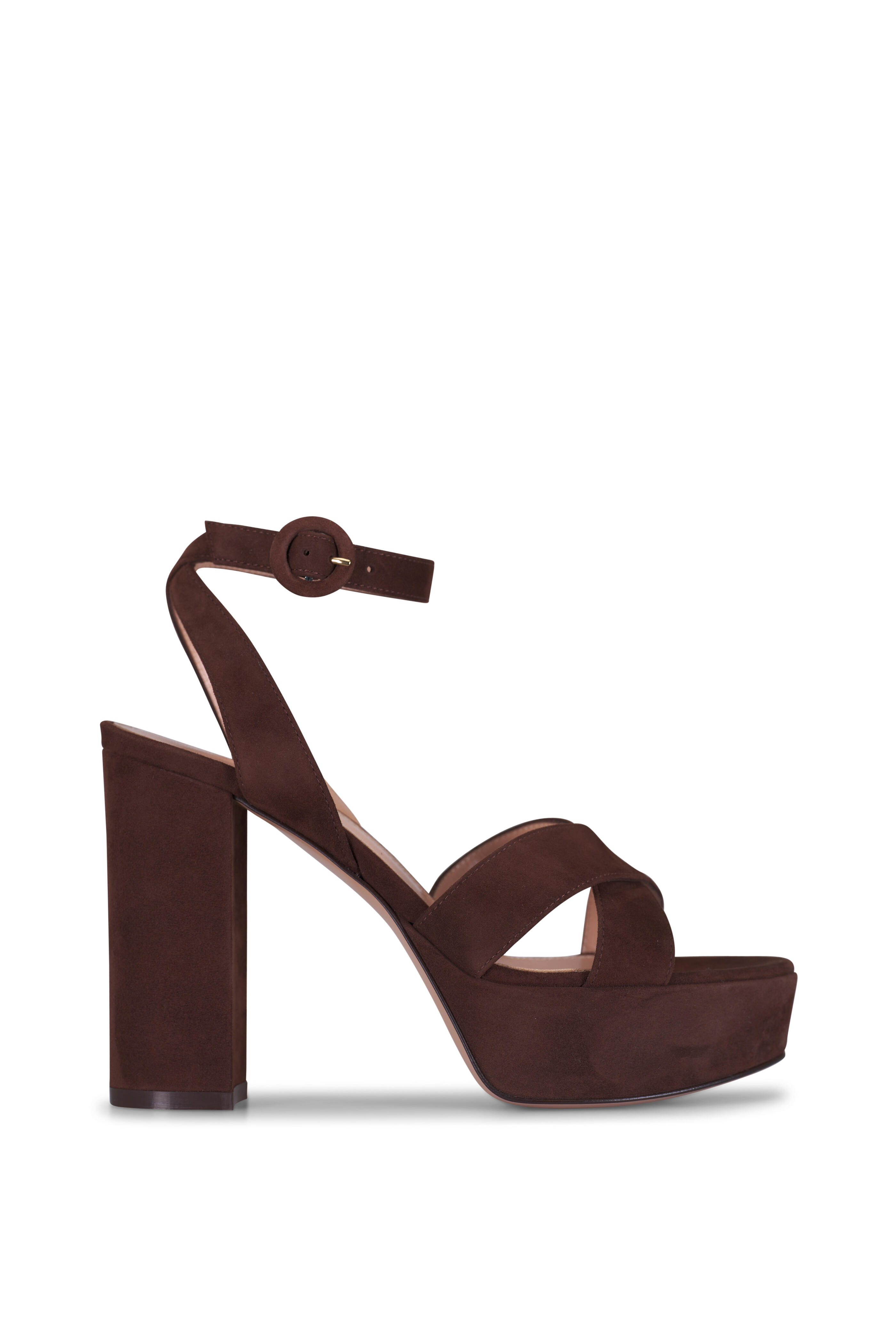 Suede upper. Open toe. Adjustable buckle ankle strap. Criss-cross straps at vamp. Self-covered heel. Leather lining and insole. Leather sole. Made in Italy. Heel measurement: 70mm.