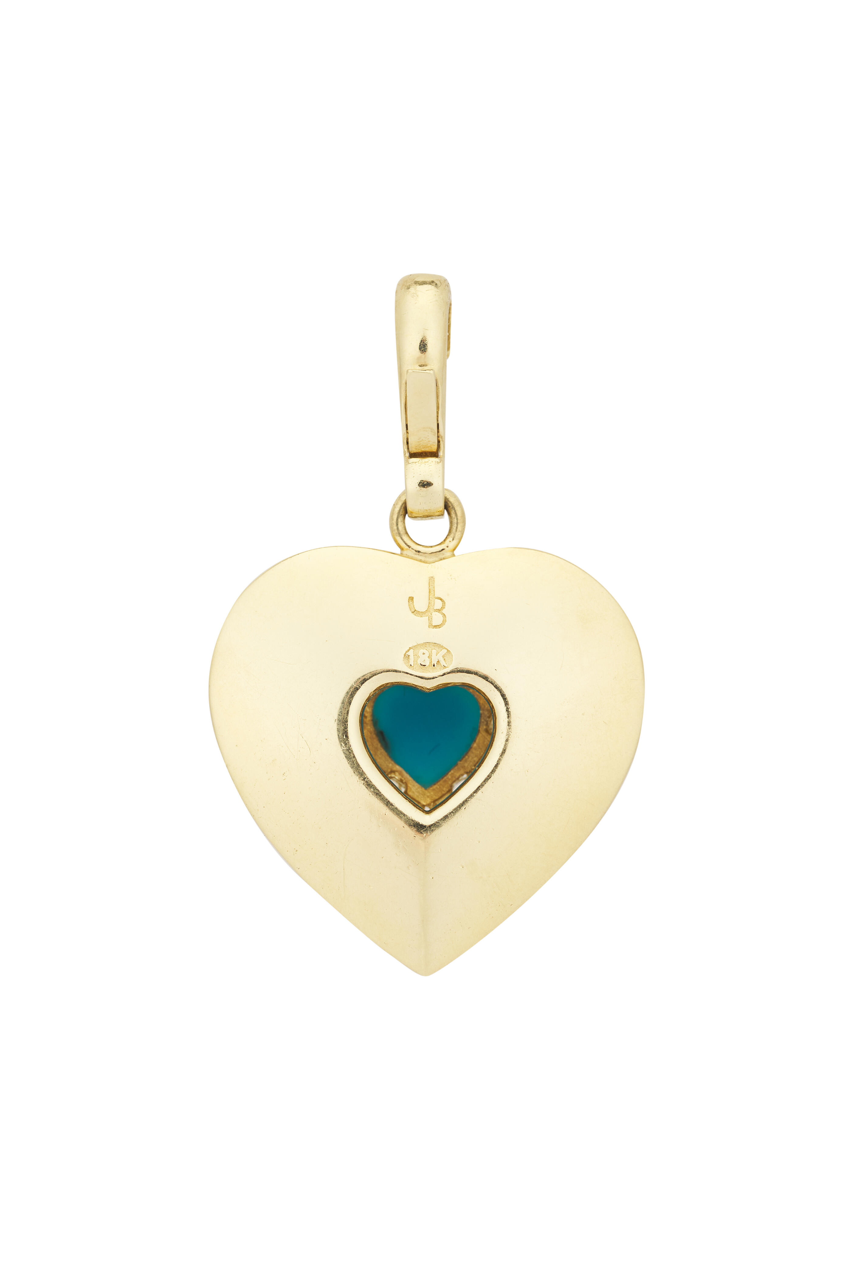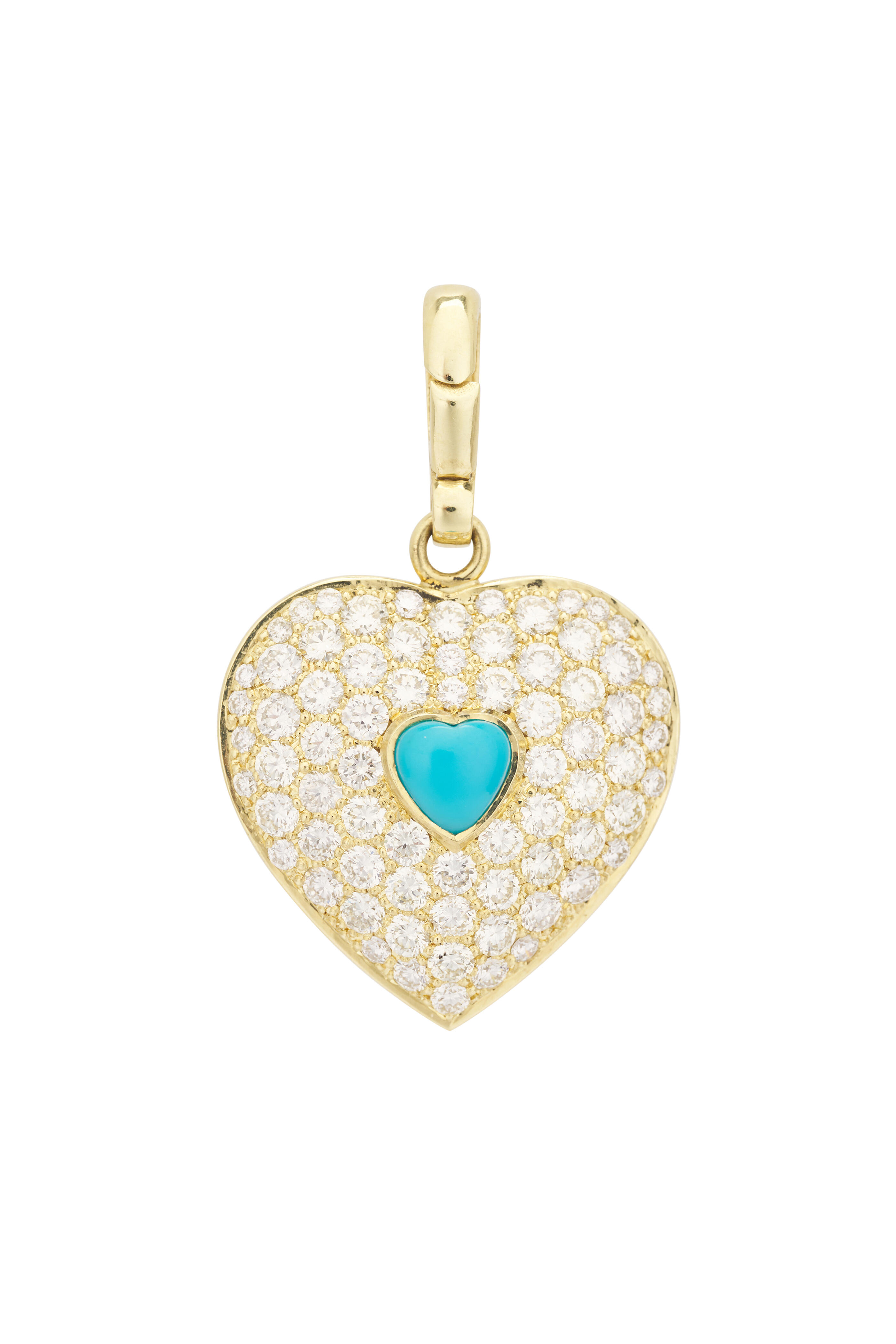 18k gold. Diamond 3.10 total carat weight. Turquoise. Heart design. Scattered diamond design. Prong setting. Hinge bail. Imported. 27mm x 24mm.