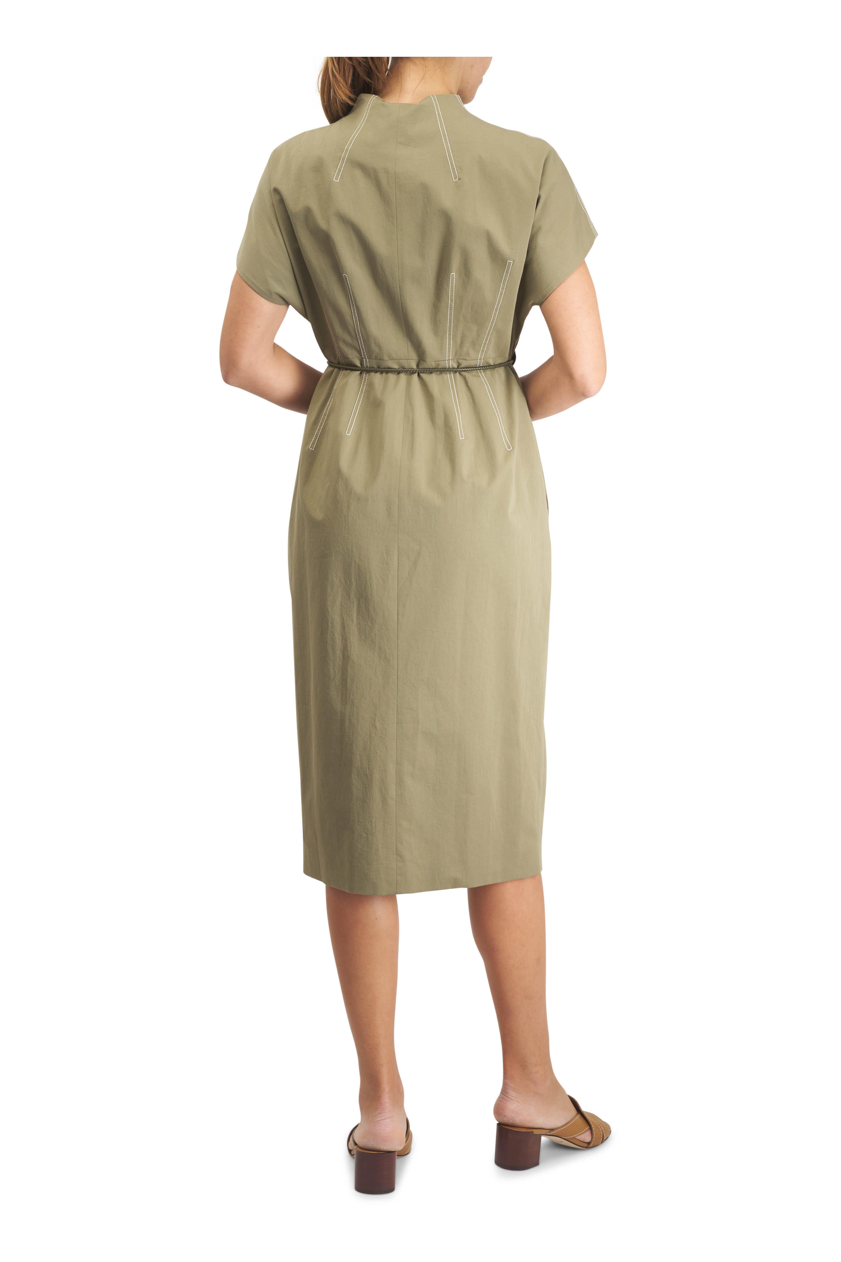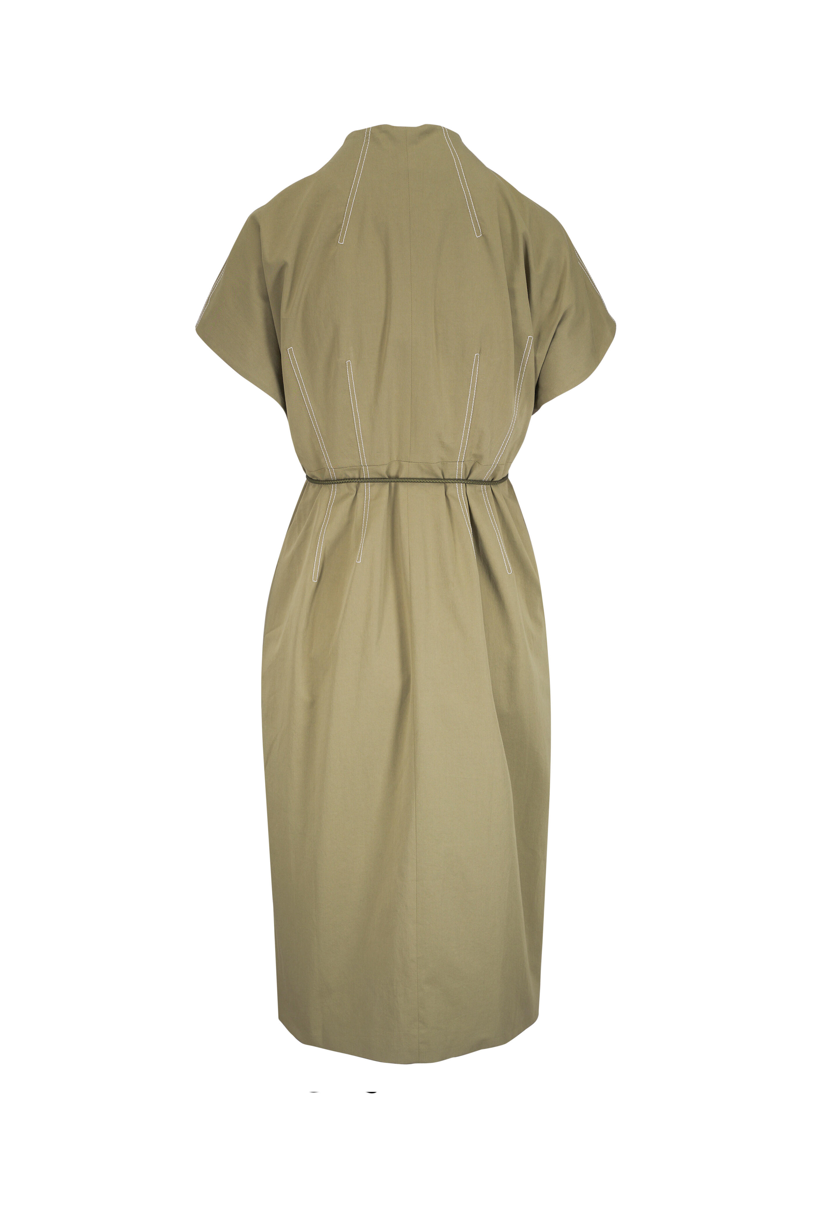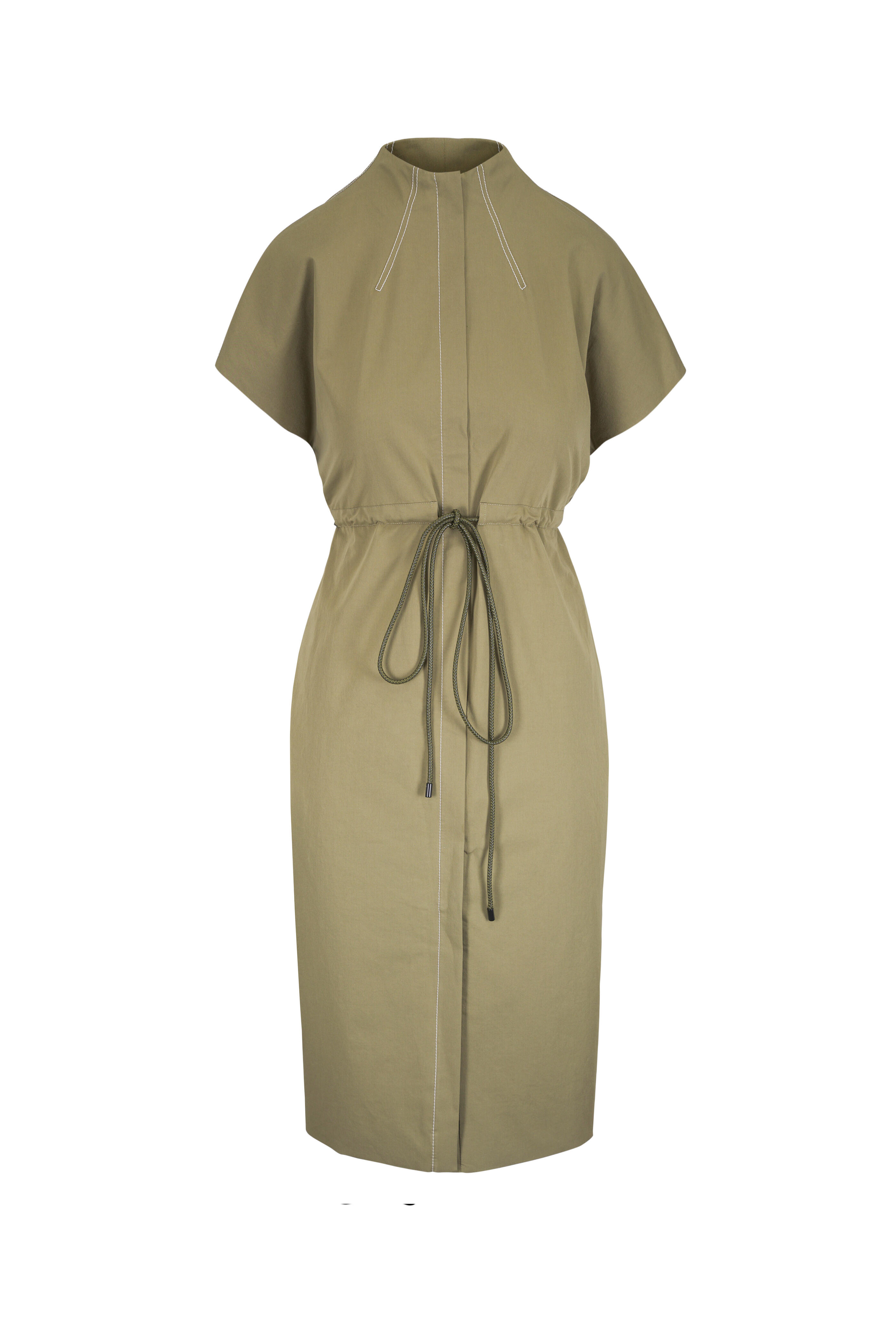 Round neckline. Concealed front zip. Self-tie drawstring waist. Made in USA. 44" shoulder to hem. 100% organic cotton. Machine wash.