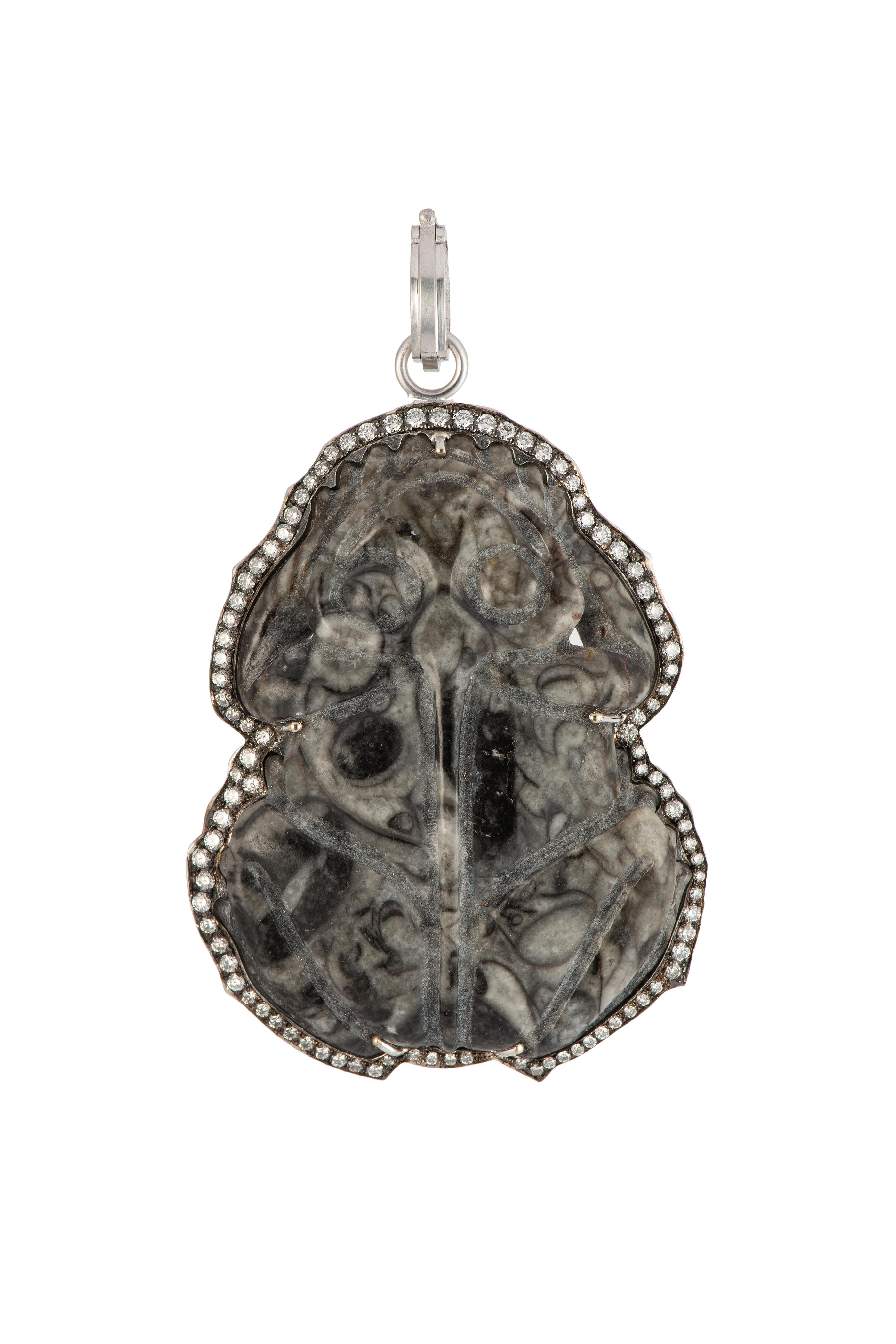 18k white gold. Diamond 1.45 total carat weight. Round, brilliant cut daimond. Fossil. Frog design. Engraved detailing. Diamond halo. Prong setting. Hinge bail. Made in the USA.