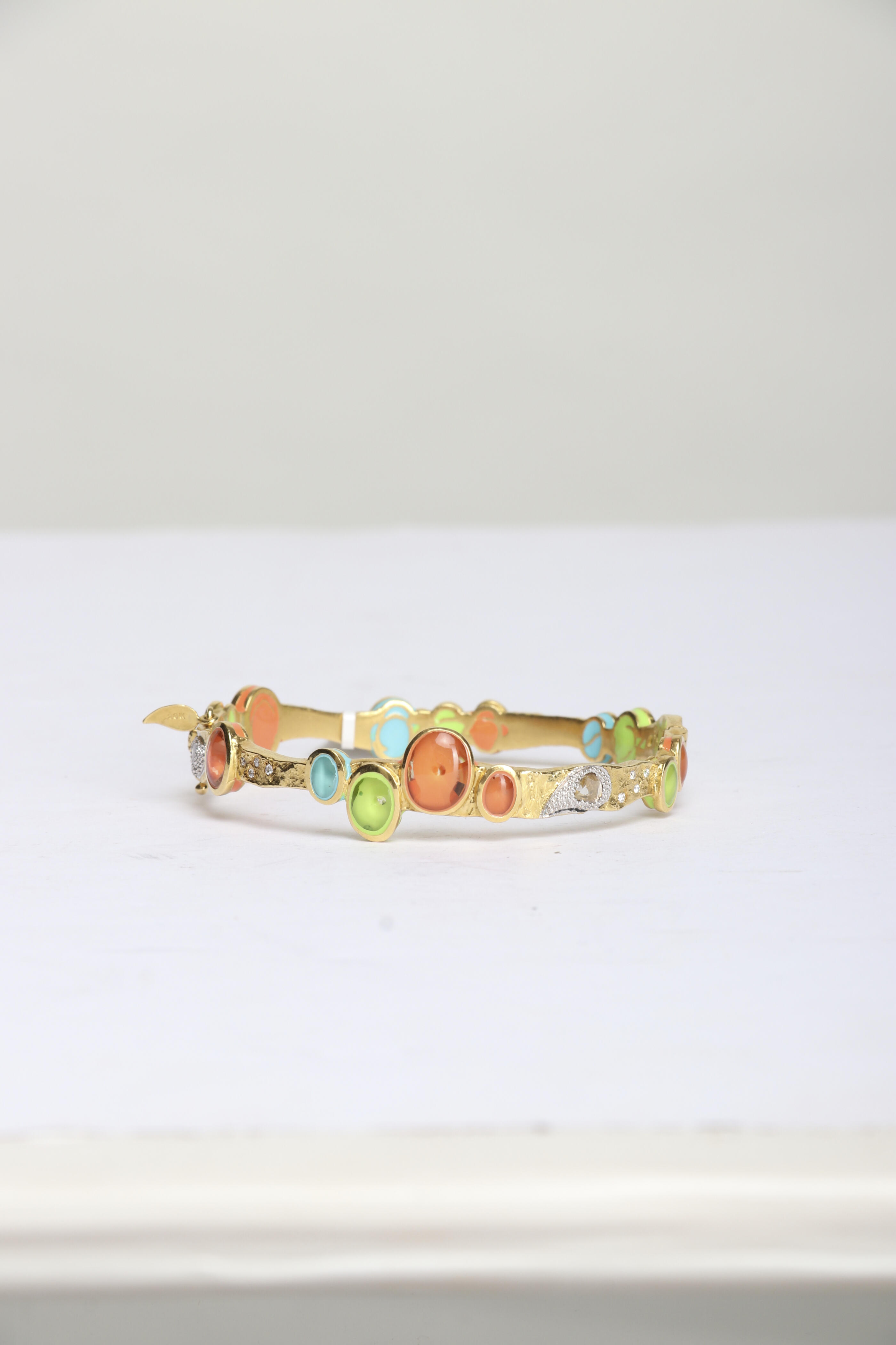 20k gold. Diamond. Olive quartz 12.33 total carat weight. Turquoise quartz. Coral quartz.