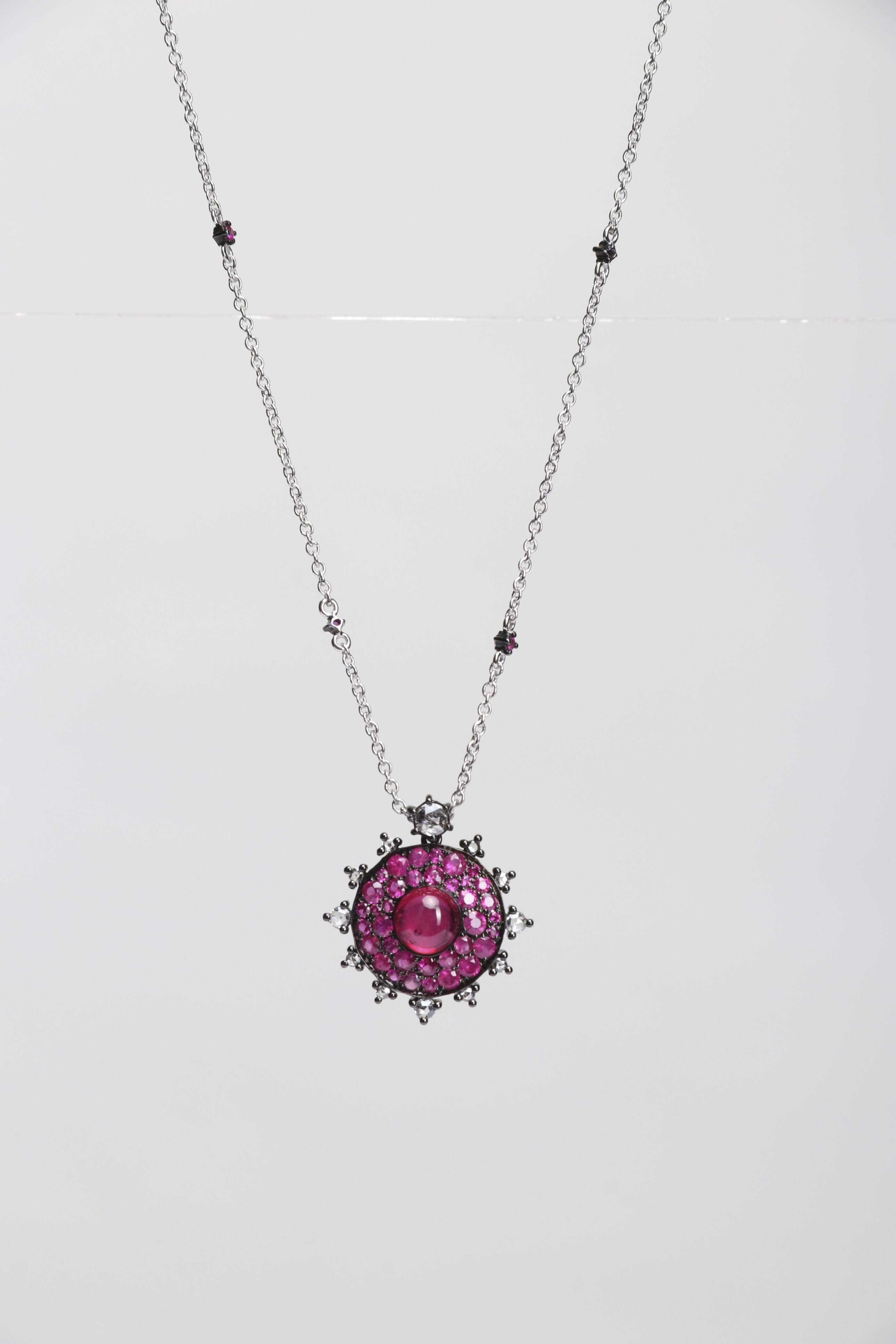 18K White Gold. Grey and White Rhodium. White Diamond = 0.35 CT. Ruby = 2 CT. Ruby Cabochon = 1.5 CT. 16"-18".
