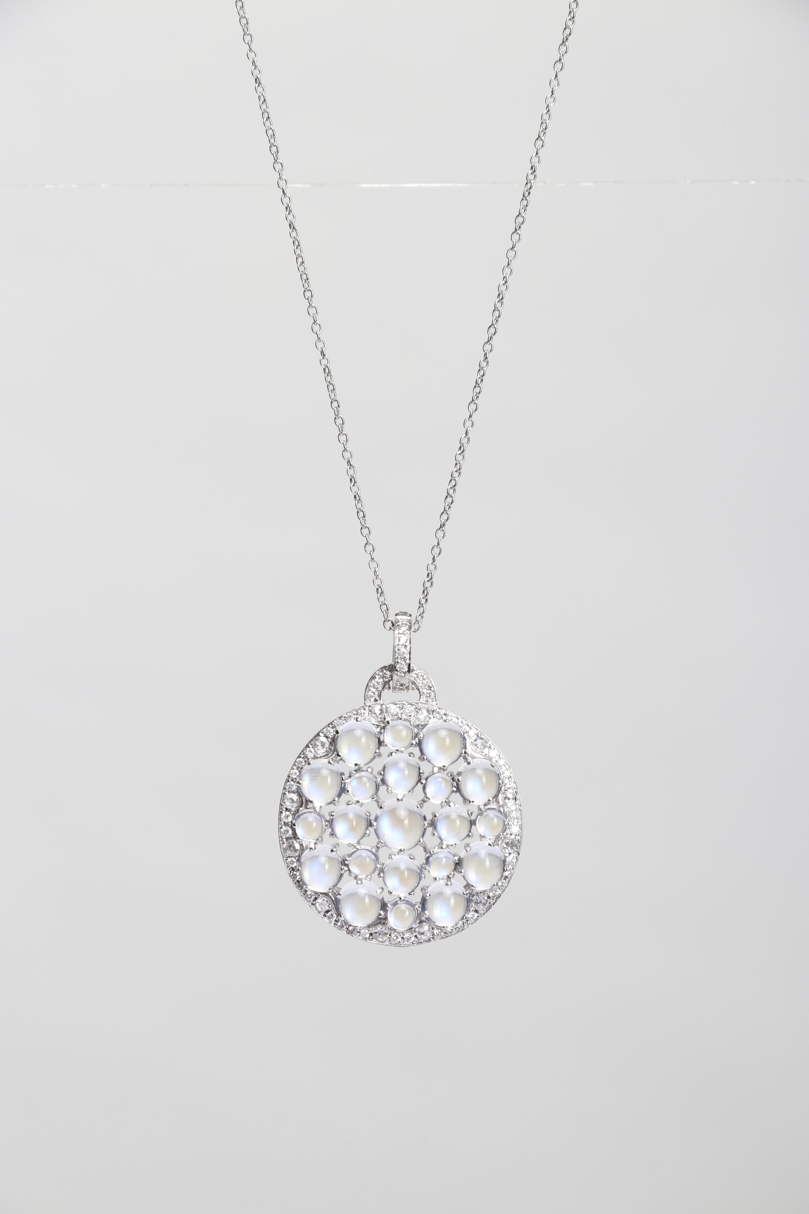 18K White Gold. White Rhodium. White Diamond = 0.658 CT. Blue Moonstone = 12.306 CT. 18".