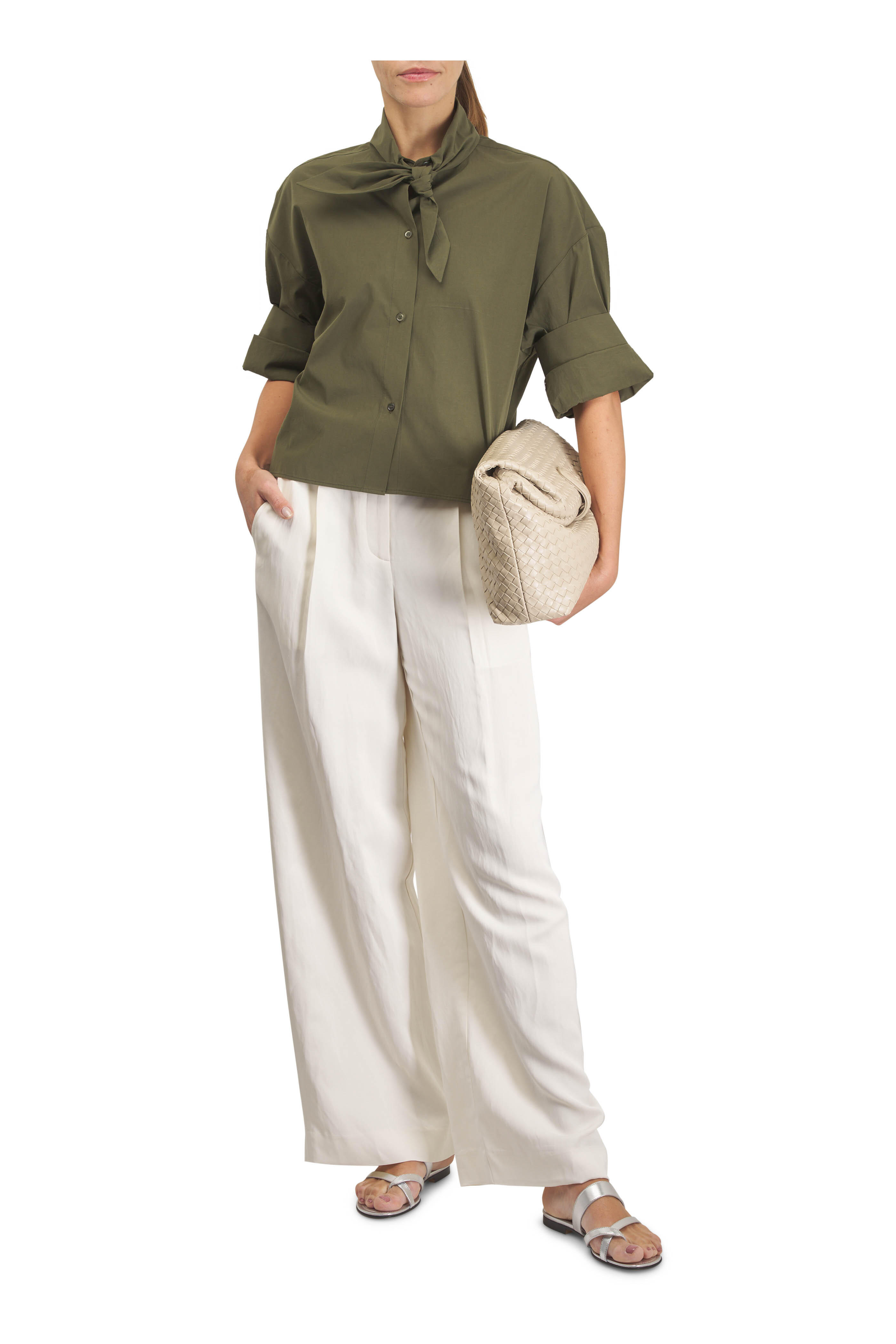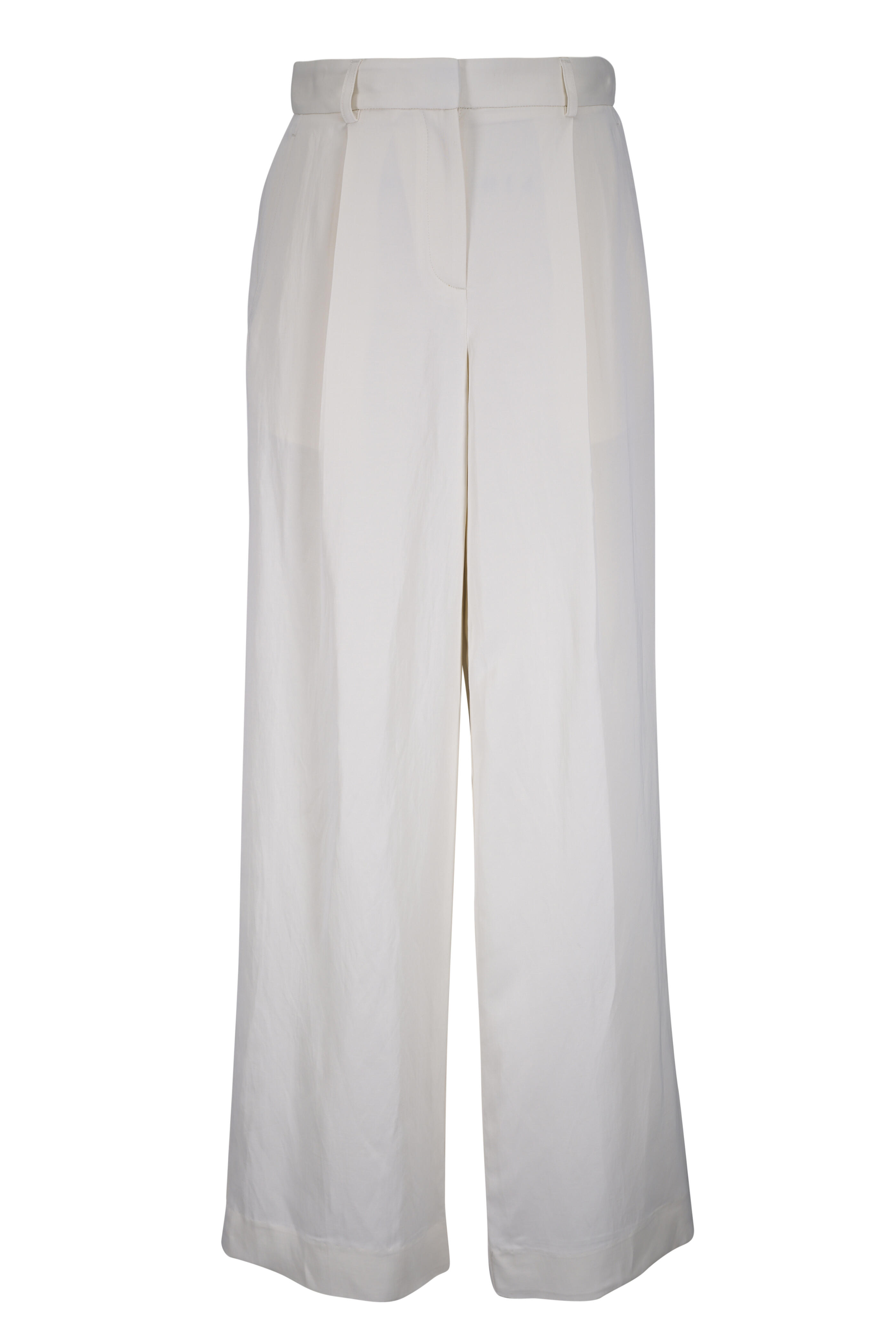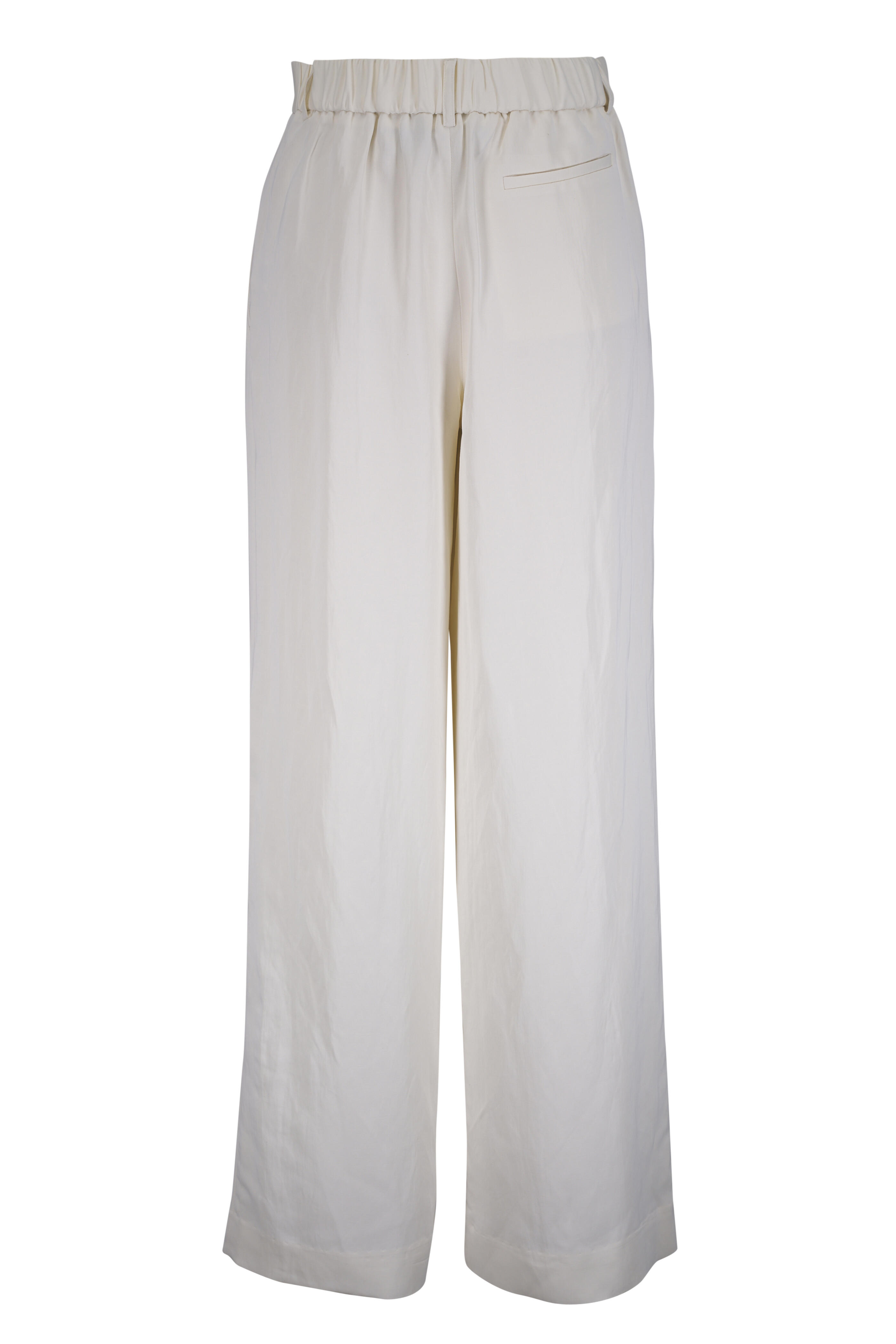 Zip fly; hook-and-bar closure. Banded waist; belt loops. Back elasticized waistband. Side slip pockets; back welt pockets. Pleated front. Made in the USA. Inseam: 32". 76% cotton, 24% linen. Dry clean.