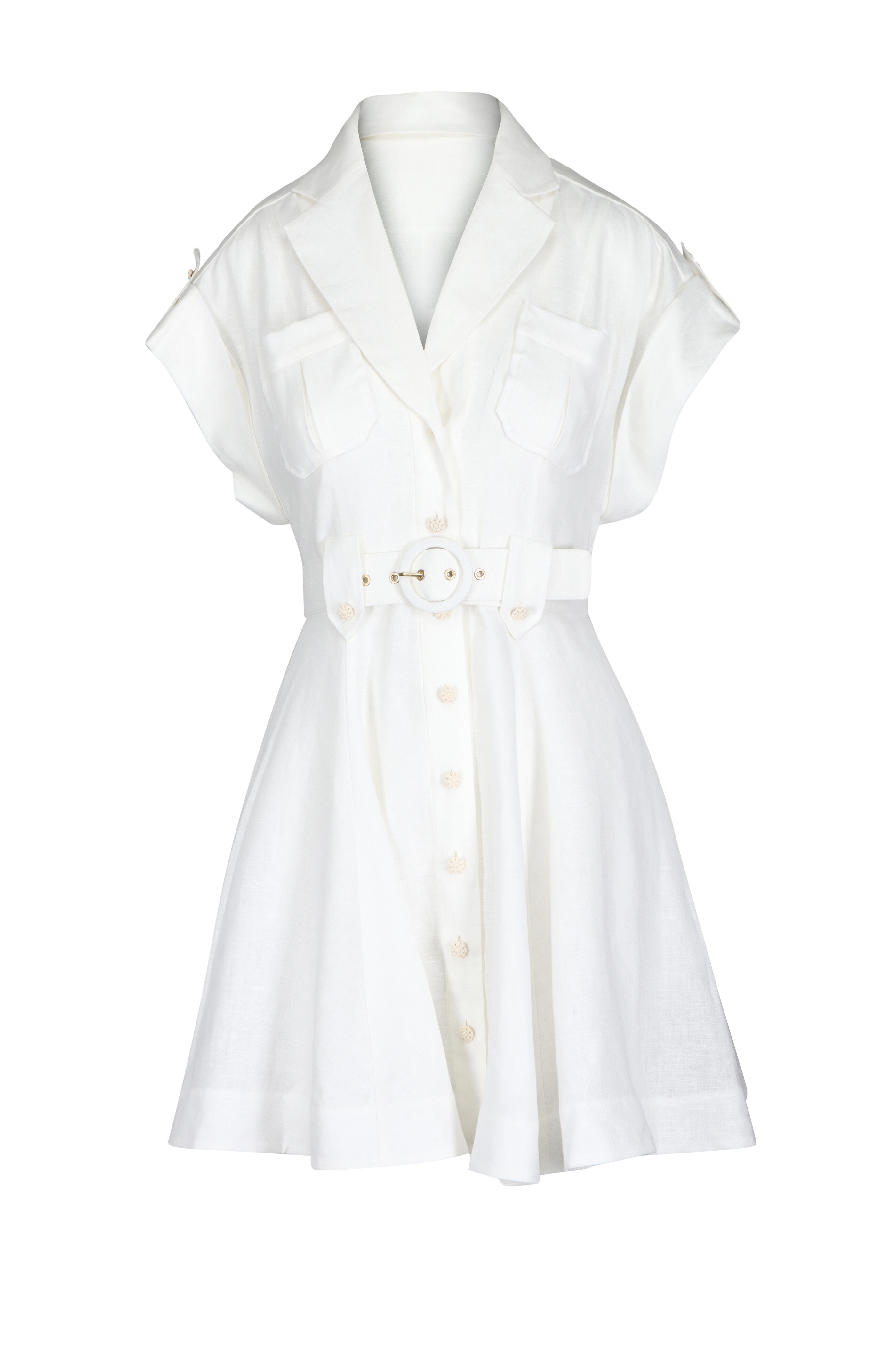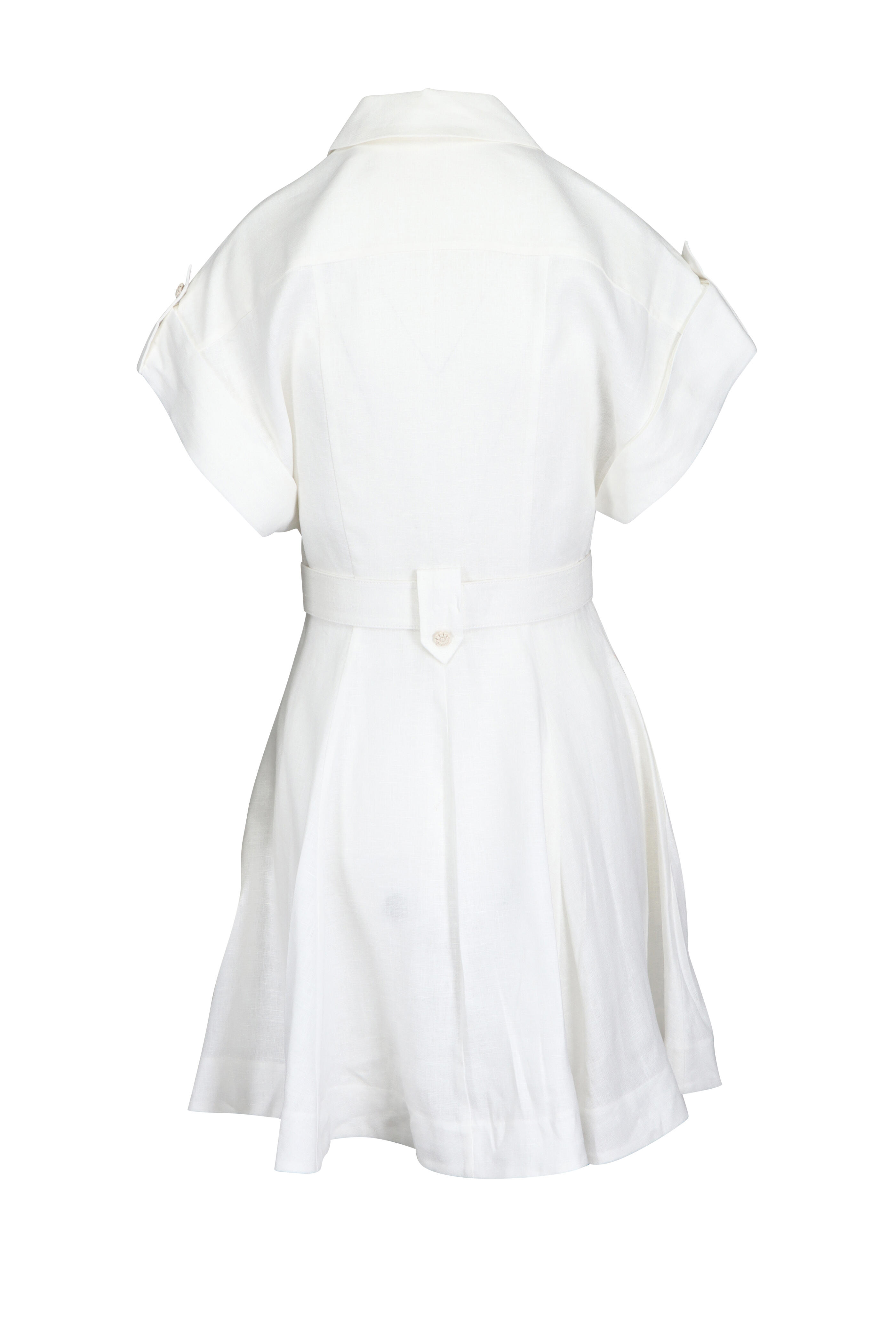 Front button closure. Notched lapels. Short sleeves with roll-tab cuffs. Chest patch pocket; side-seam pockets. Removable belt. Imported. 100% linen; lining: 100% cotton. Dry clean.