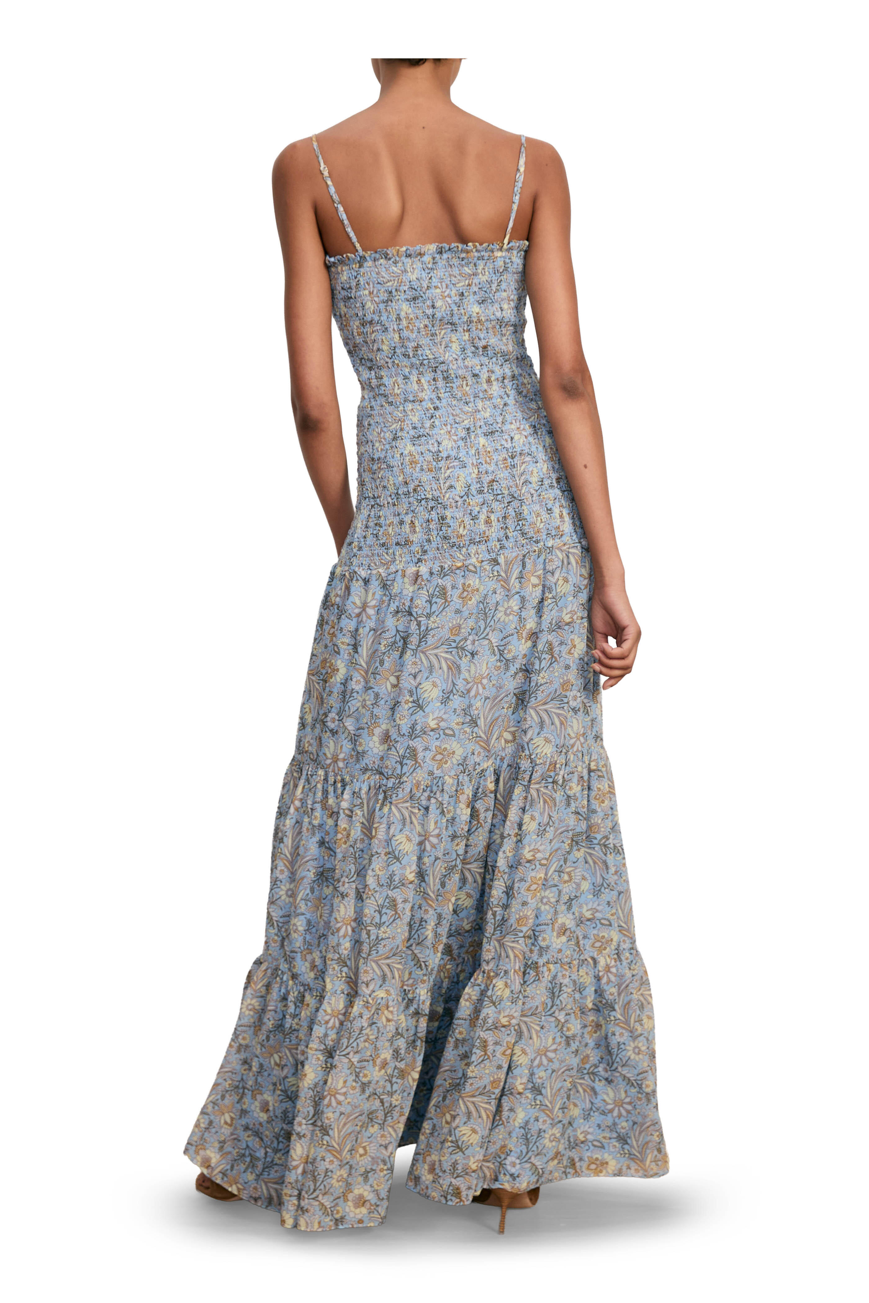 Square neckline. Slip-on style. Adjustable straps. Smocked through bodice, waist, and hips. Imported. Approx. 62" shoulder to hem (measurements taken from size 2). 75% cotton, 25% silk; lined. Dry clean.