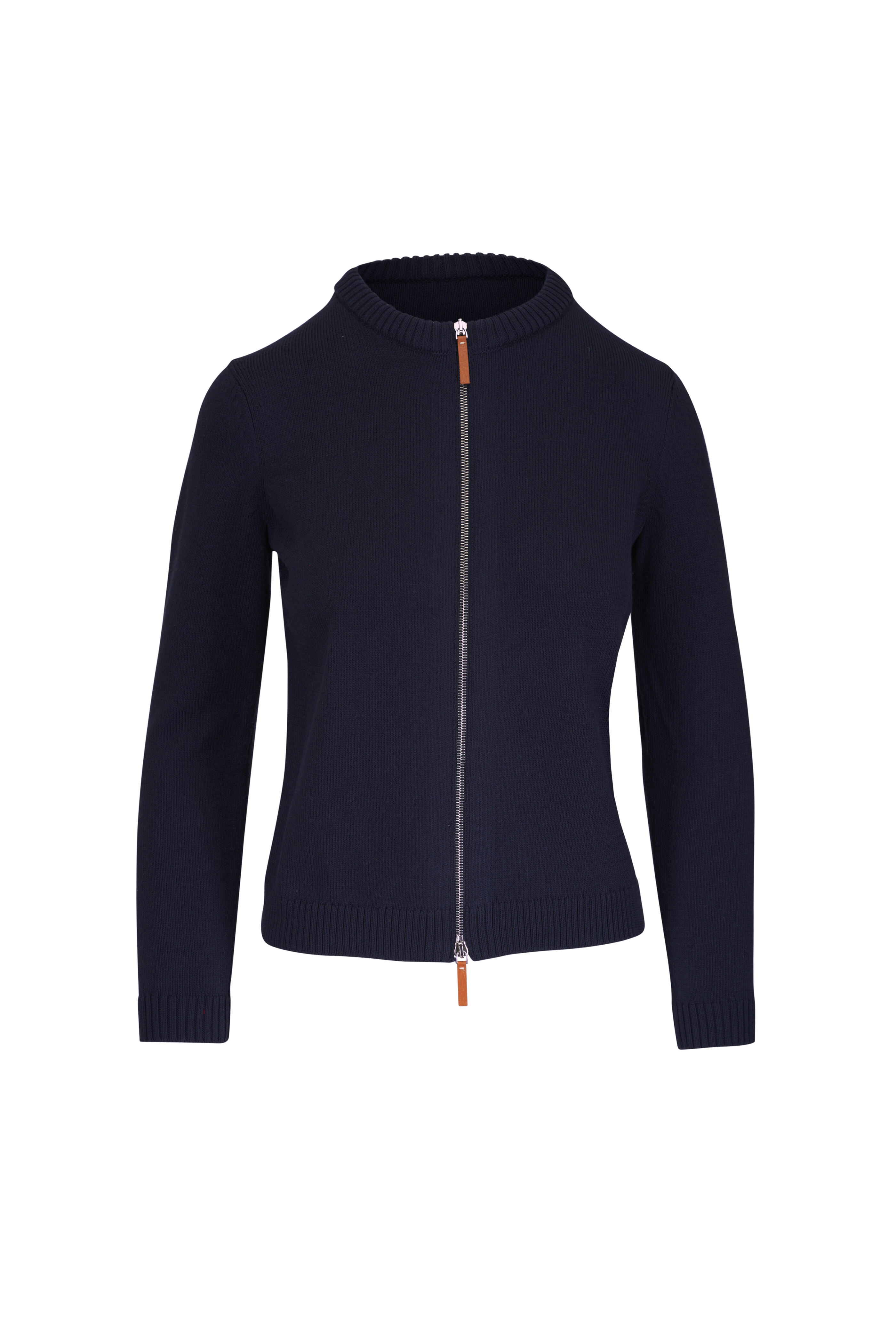 Stand collar. Two-way zip placket. Ribbed trims. Straight hem. Imported. 70% cotton, 30% silk. Dry clean.