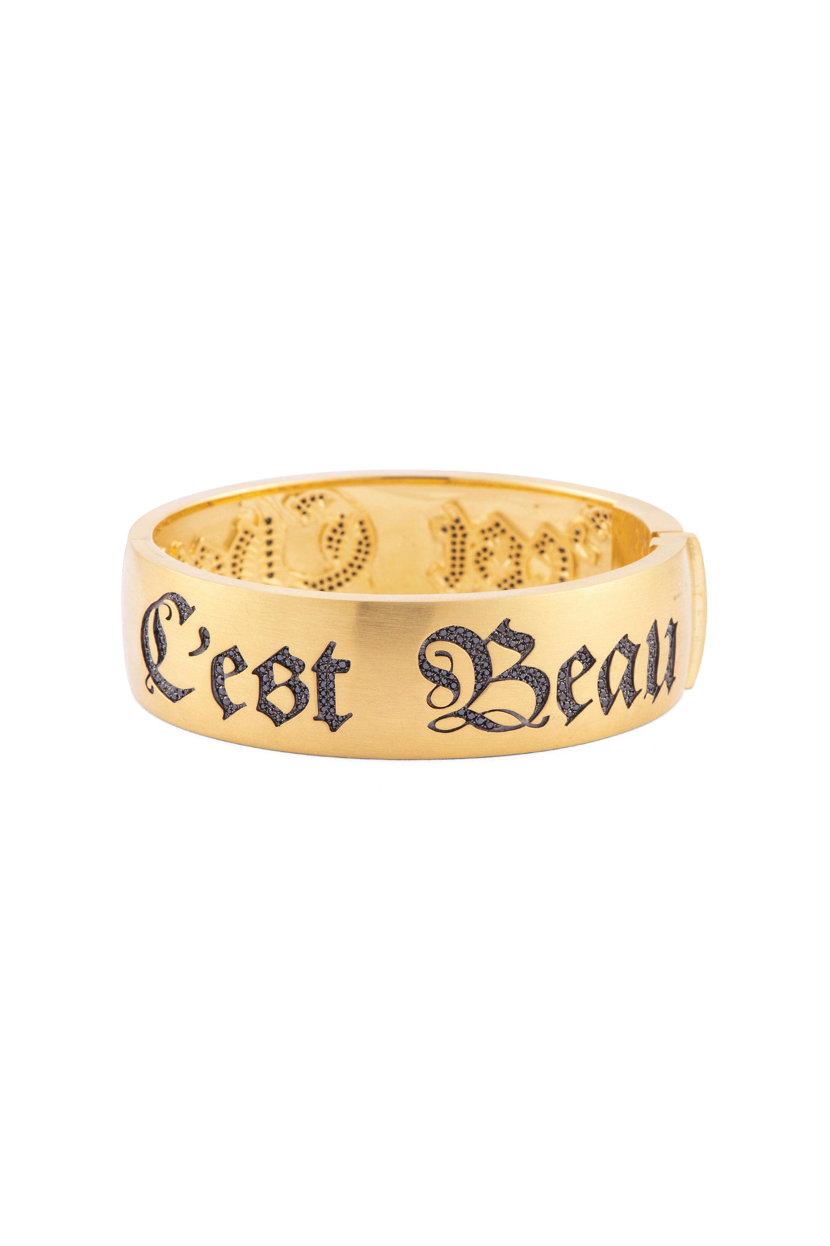 18k gold. Diamond 1.50 total carat weight. Black diamond. C'est Beau message design. Bangle style. Lock closure. Made in the USA.