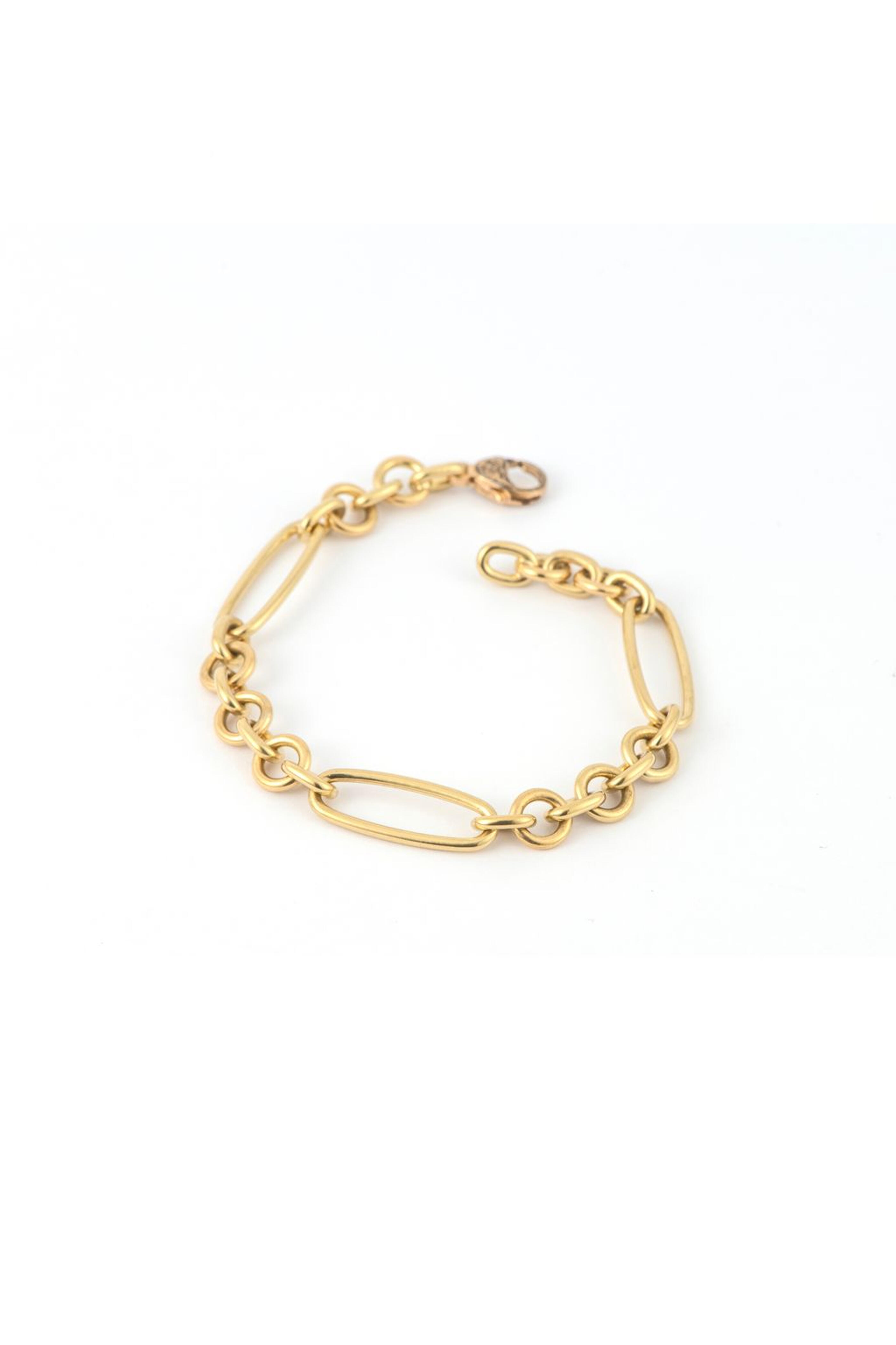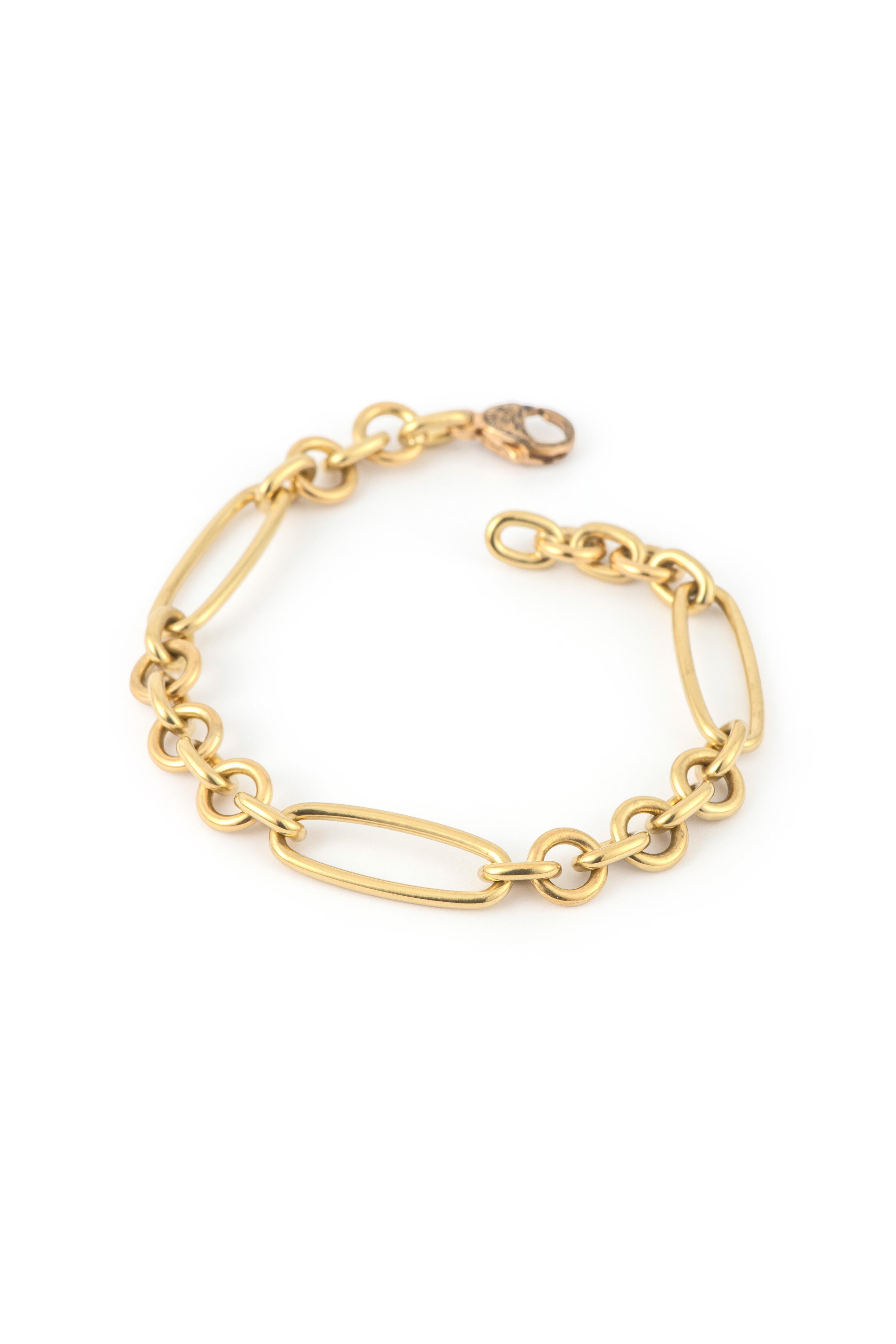 18k gold. Mixed round and oval chain link. Lobster claw clasps. Made in the USA. Length: 7".