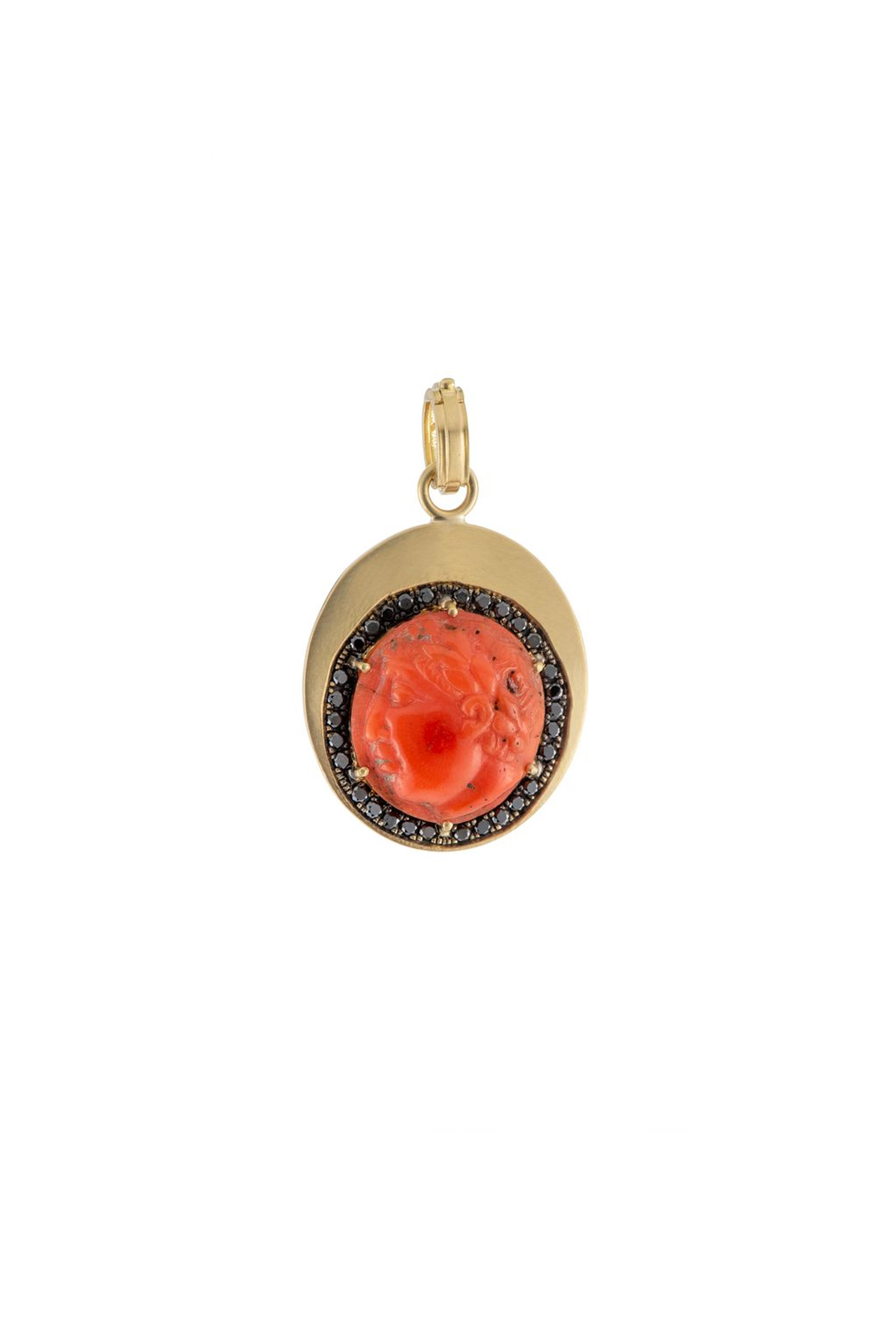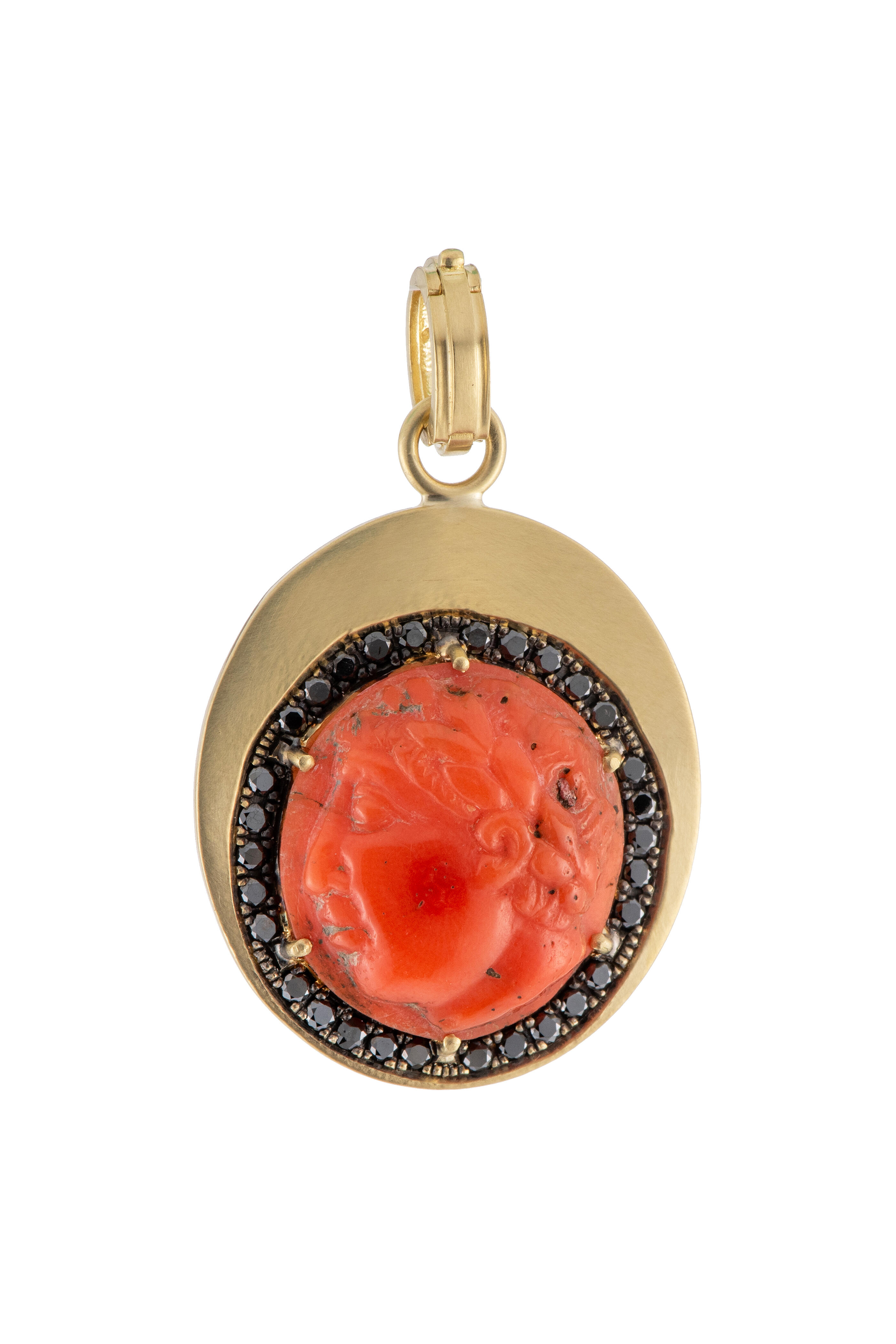 18k gold. Black diamond 0.51 total carat weight. Carnelian. Engraved ancient Roman noble design. Diamond halo. Prong setting. Hinge bail. Made in the USA.