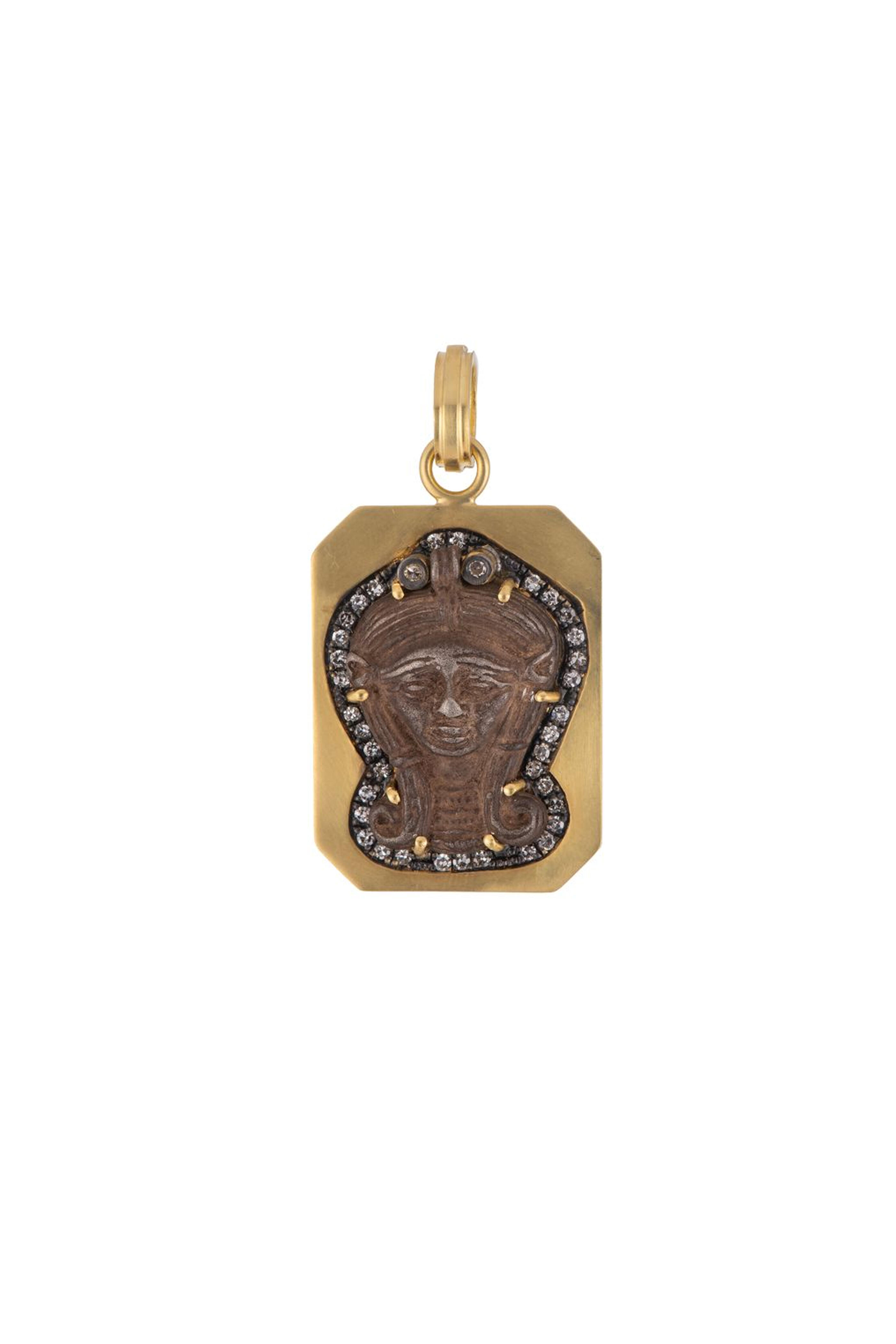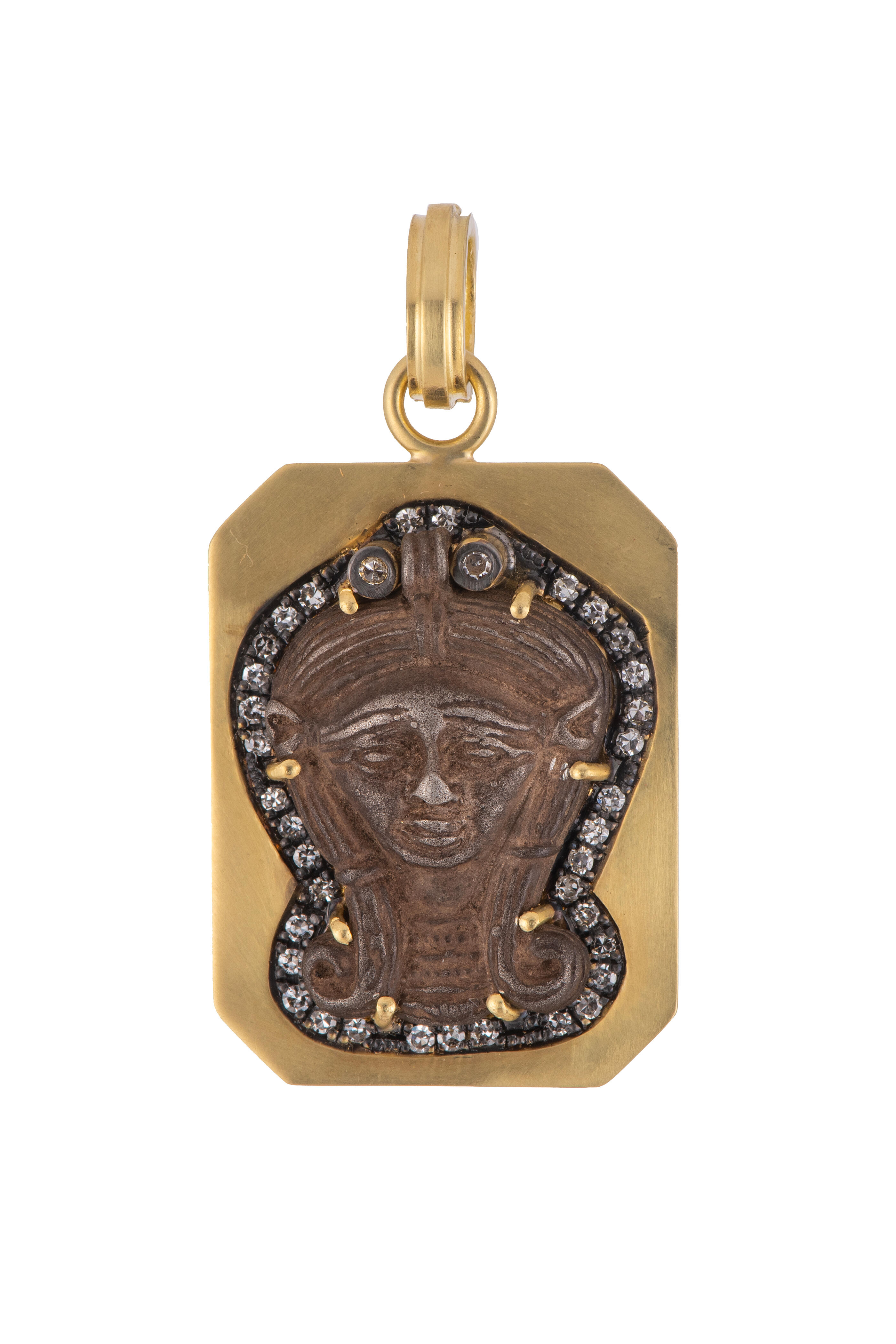 18k gold. Diamond. Engraved 1250BC Egyptian design. Prong setting. Hinge bail. Made in the USA.