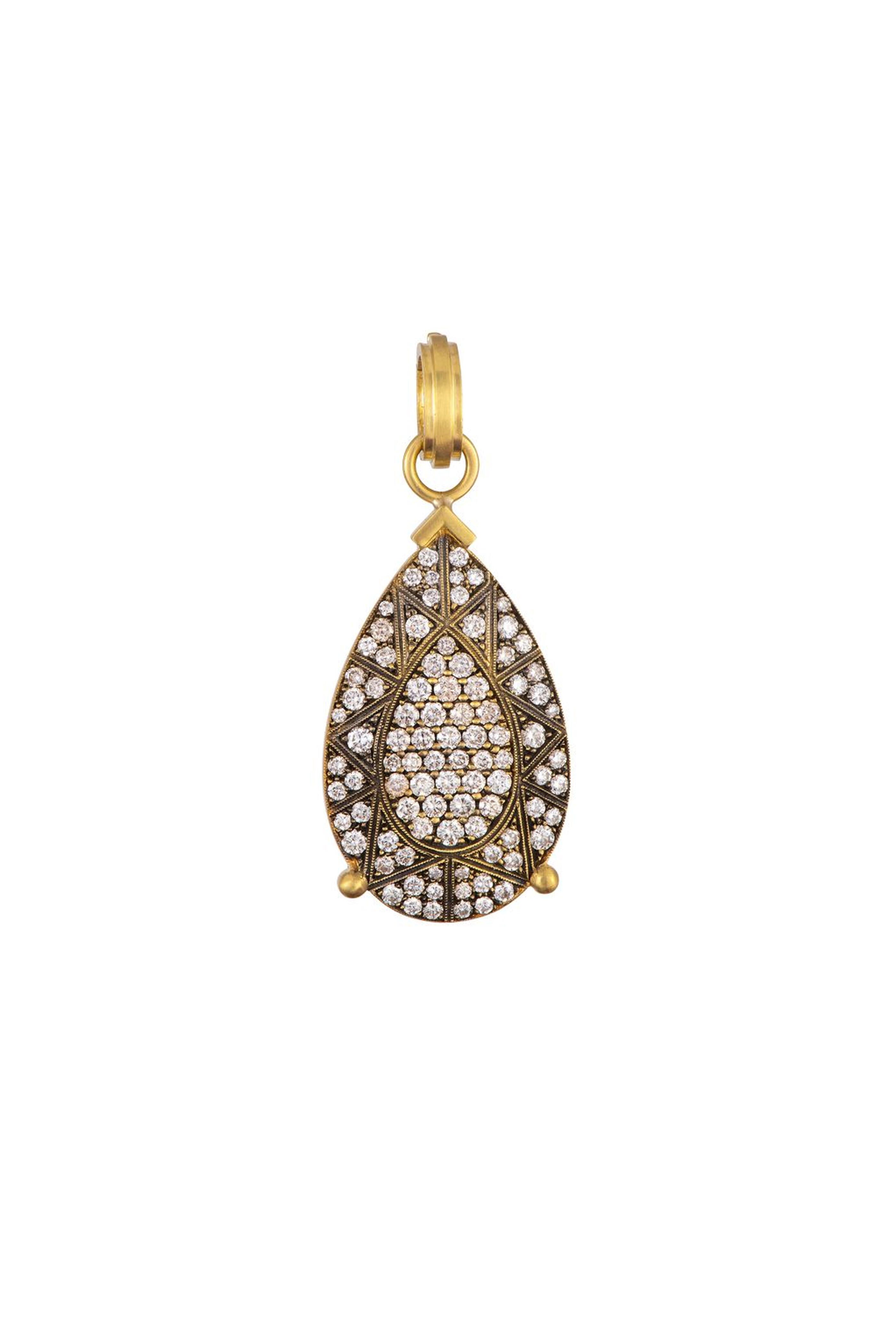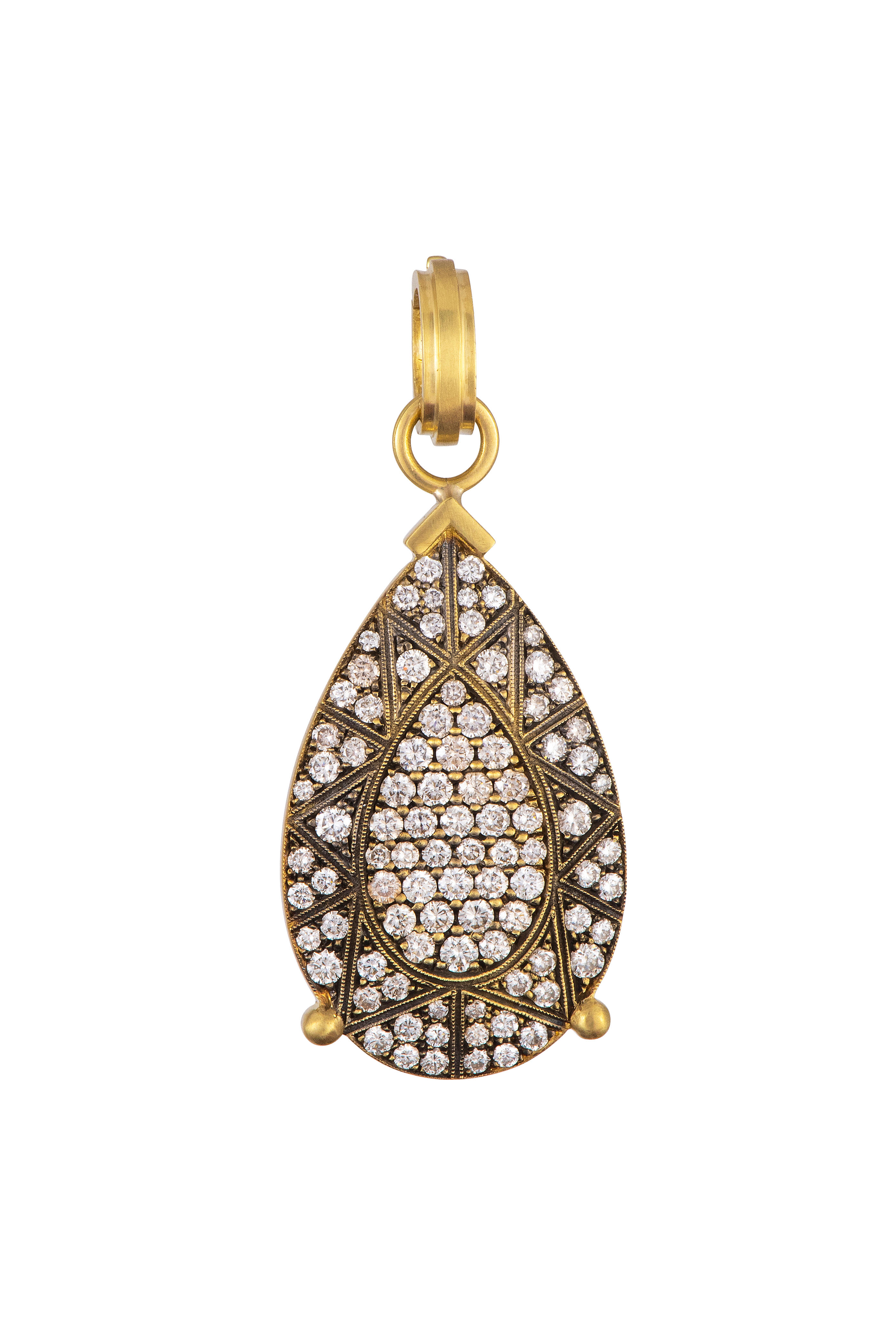 18k gold. Diamond 1.40 total carat weight. Round, brilliant cut diamond. Pear shape. Ten table design. Prong setting. Hinge bail. Made in the USA.