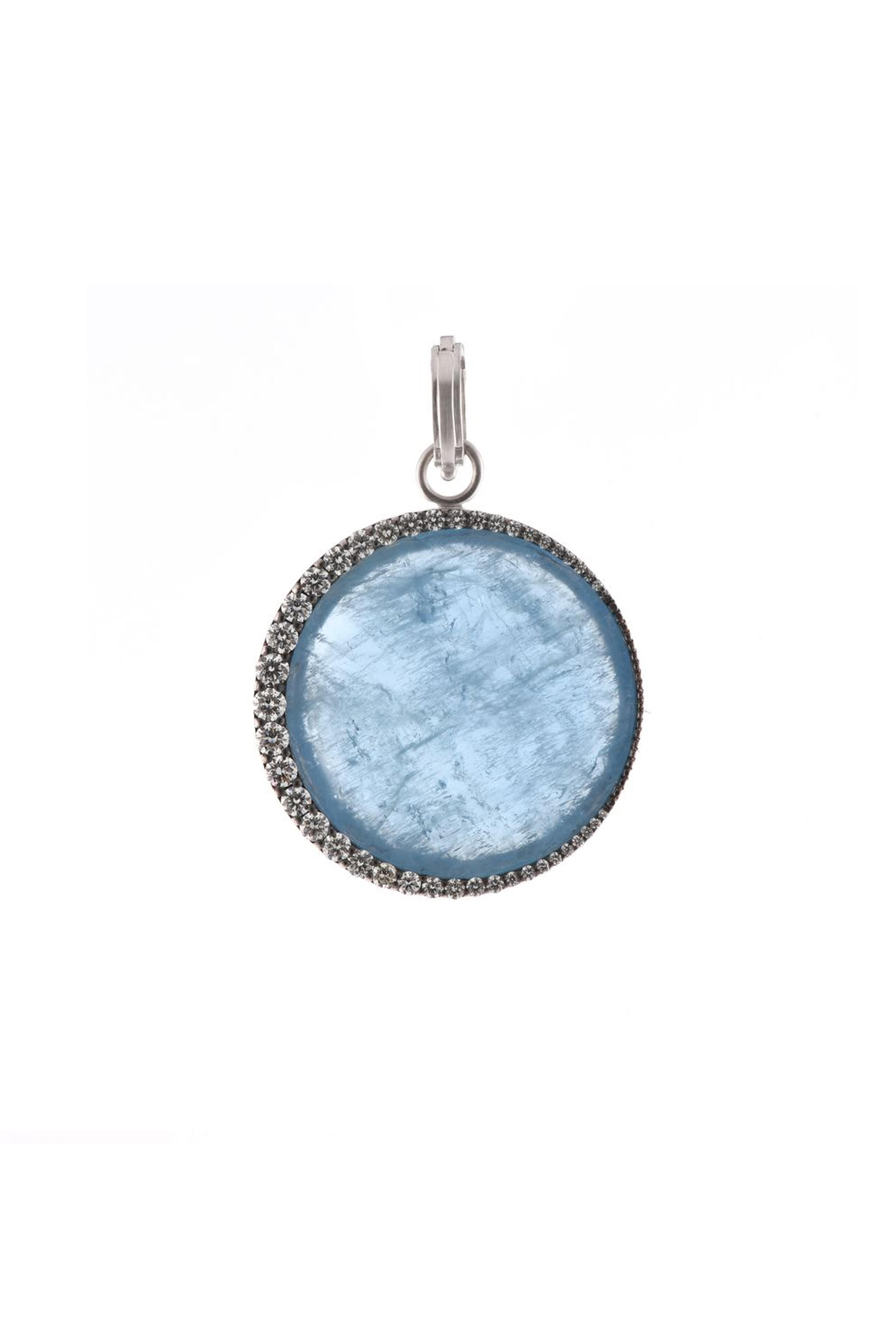 18k white gold. Diamond 0.98 total carat weight. Aquamarine 30.97 total carat weight. Moon design. Prong setting. Hinge bail. Made in the USA.