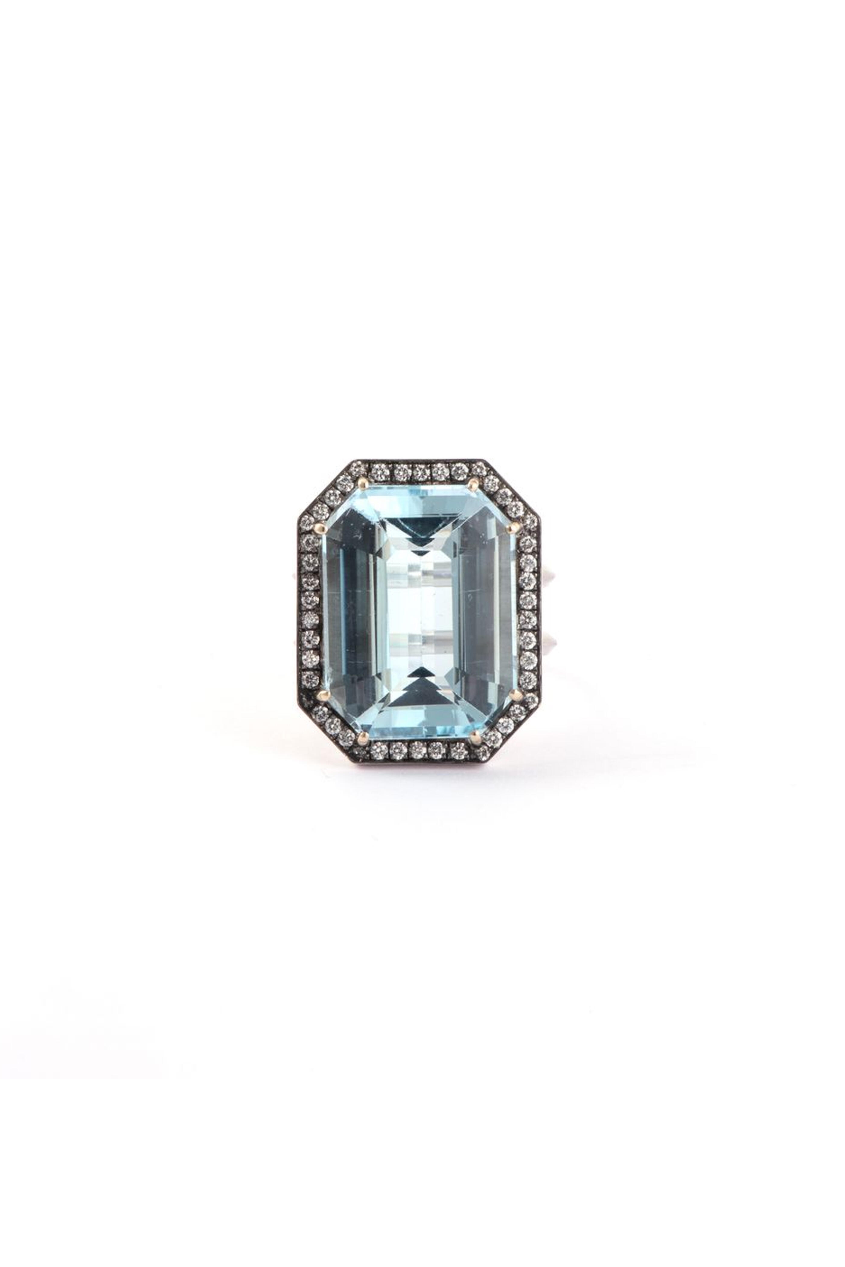 18k gold. Sterling silver. Diamond 0.50 total carat weight. Aquamarine 24.70 total carat weight. Octagon Design. Diamond halo. Prong setting. Made in the USA. Call for ring size.