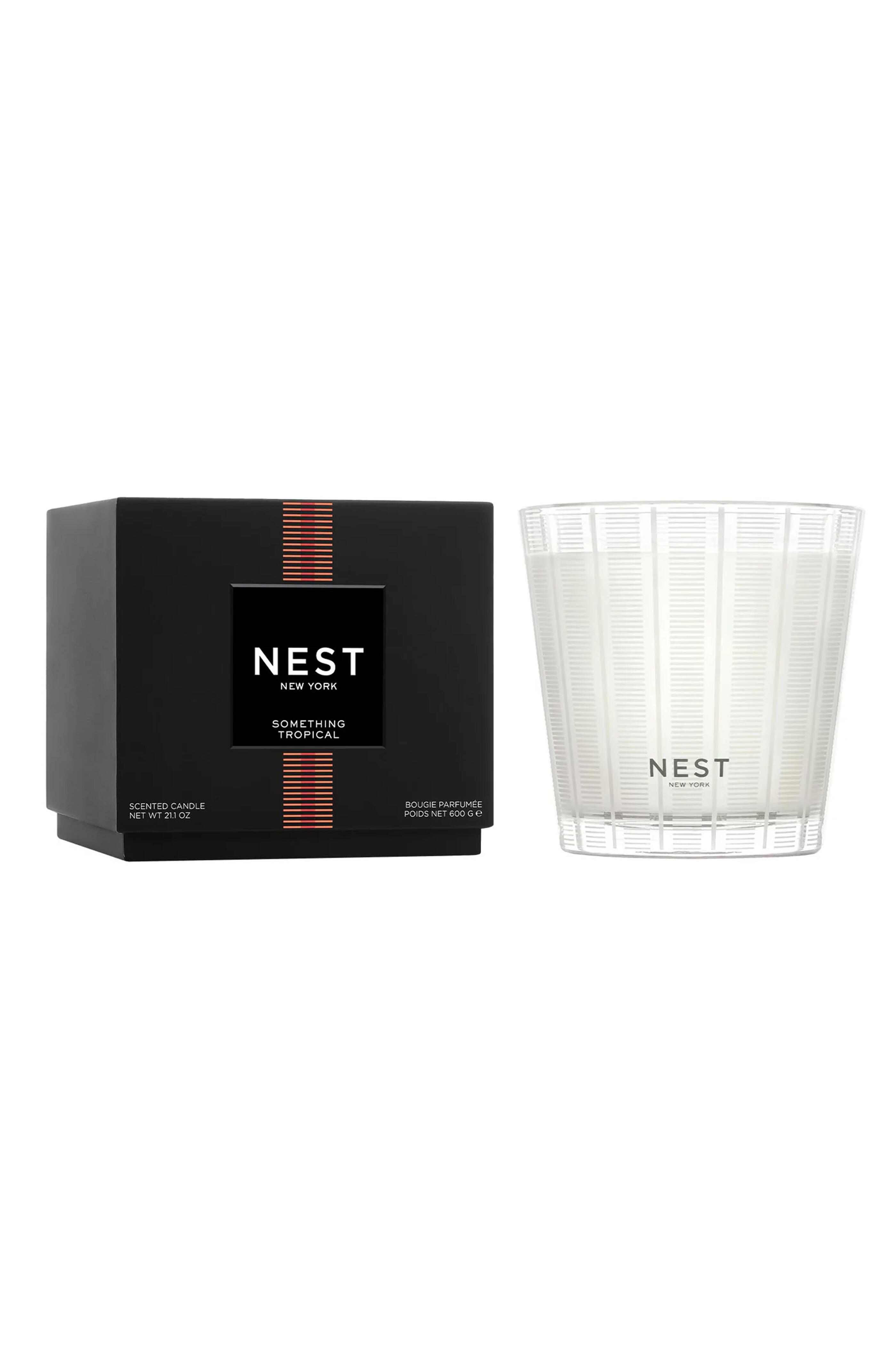 Scented, white wax. Glass vessel. A vibrant daydream painted in luscious layers of passion fruit, strawberry, and mango, wrapped in the soft bloom of peony and hibiscus. Grounded in the warmth of cashmere woods, this scented candle is a joyful invitation to imagine your own paradise.. Frosted stripe design on glass. Up to 100 hours burn time. Made in New York. Clean burn with 100% lead-free and cotton wicks.
