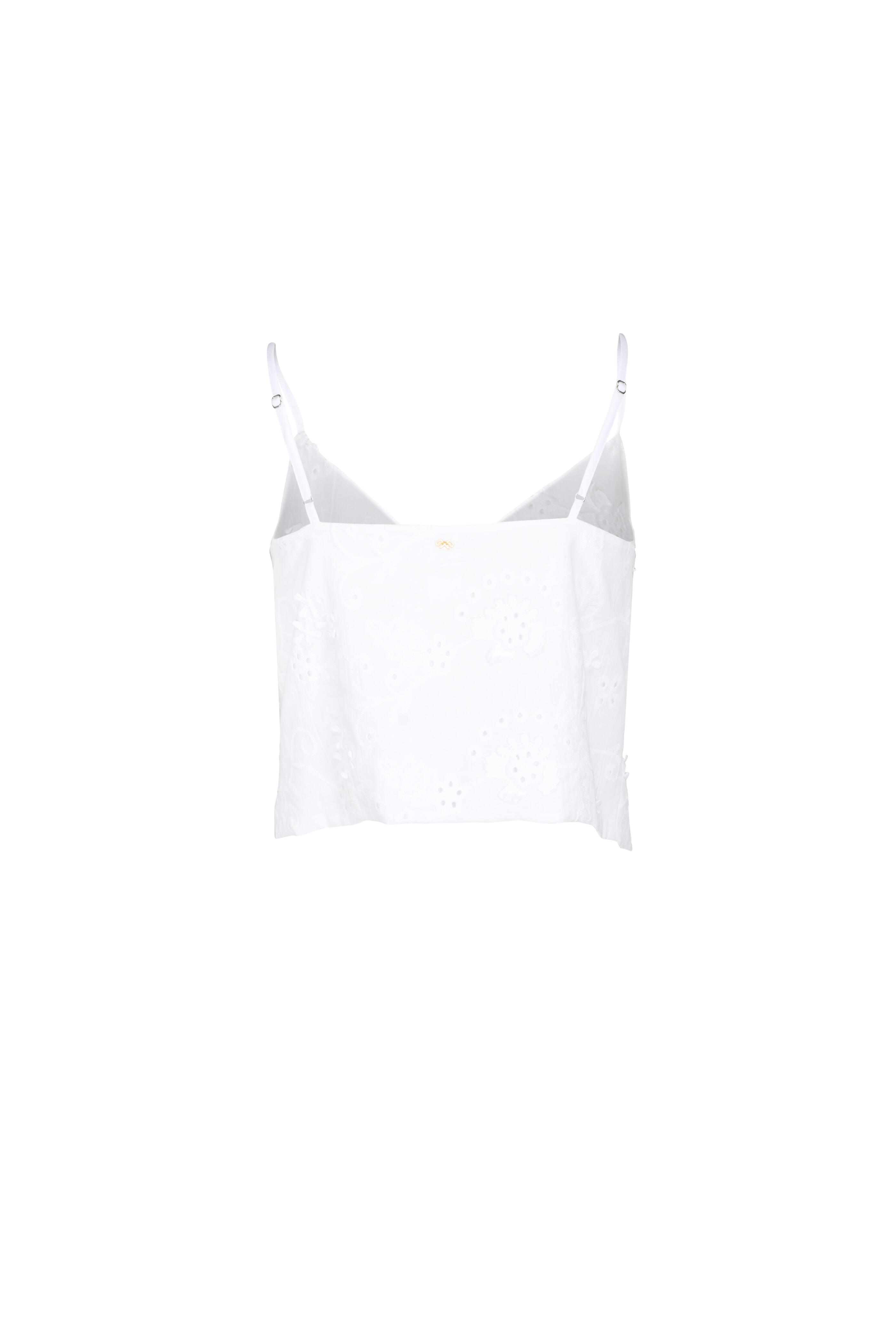V-neck. Spaghetti straps. Front tie closures. Imported. Cropped.. 100% cotton. Hand wash.