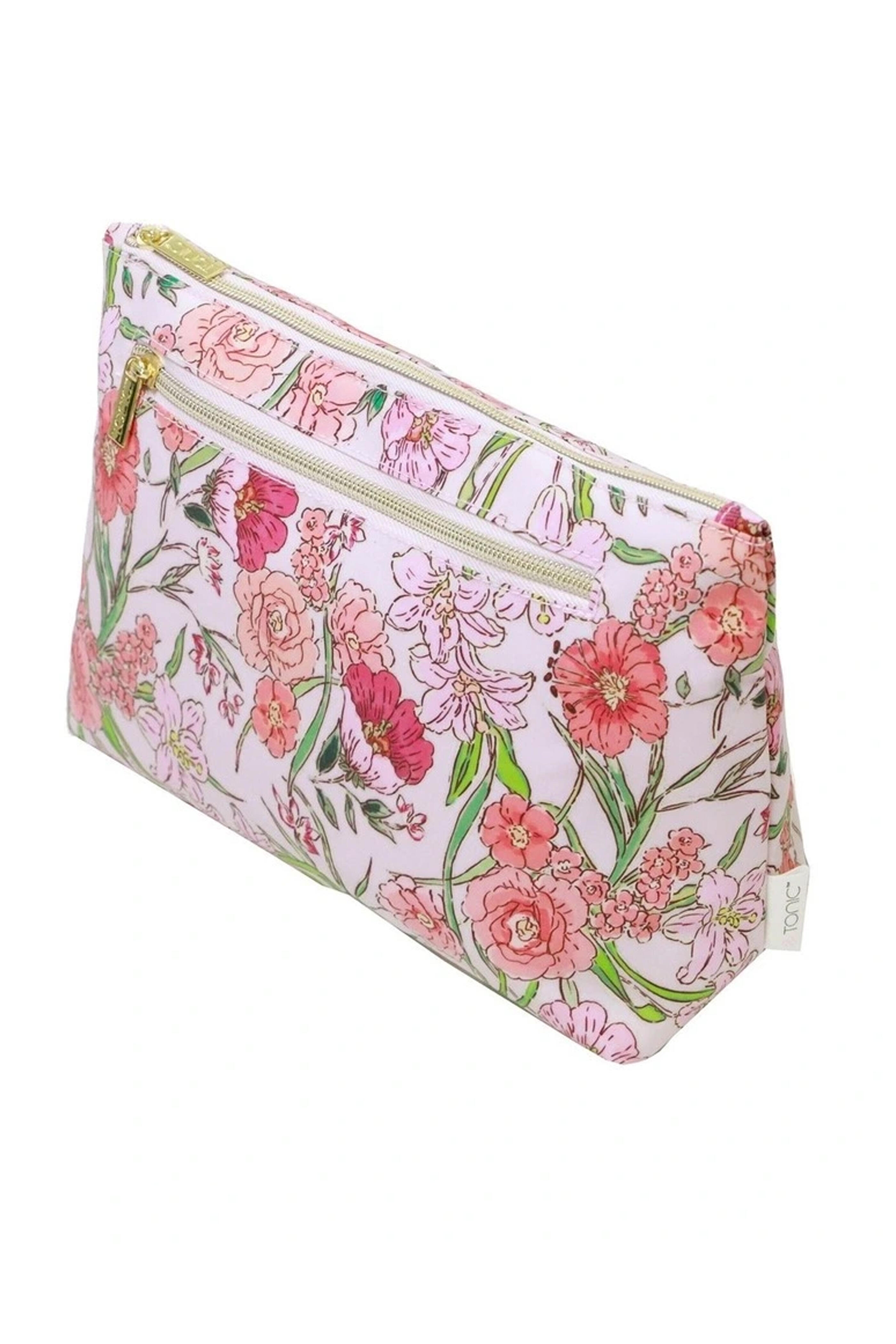 Materials: Sustainable Cotton with PVC Coating / Recycled Polyester Interior. Complemented by our signature gold zips, this toiletry bag opens to reveal an interior lined with soft pink recycled polyester. The four pockets inside are perfectly sized for keeping smaller makeup or toiletry items organized with the outer pocket designed for those essentials you wish to keep close at hand. Imported. Dimensions: 8.27” x 3.15” x 13”.