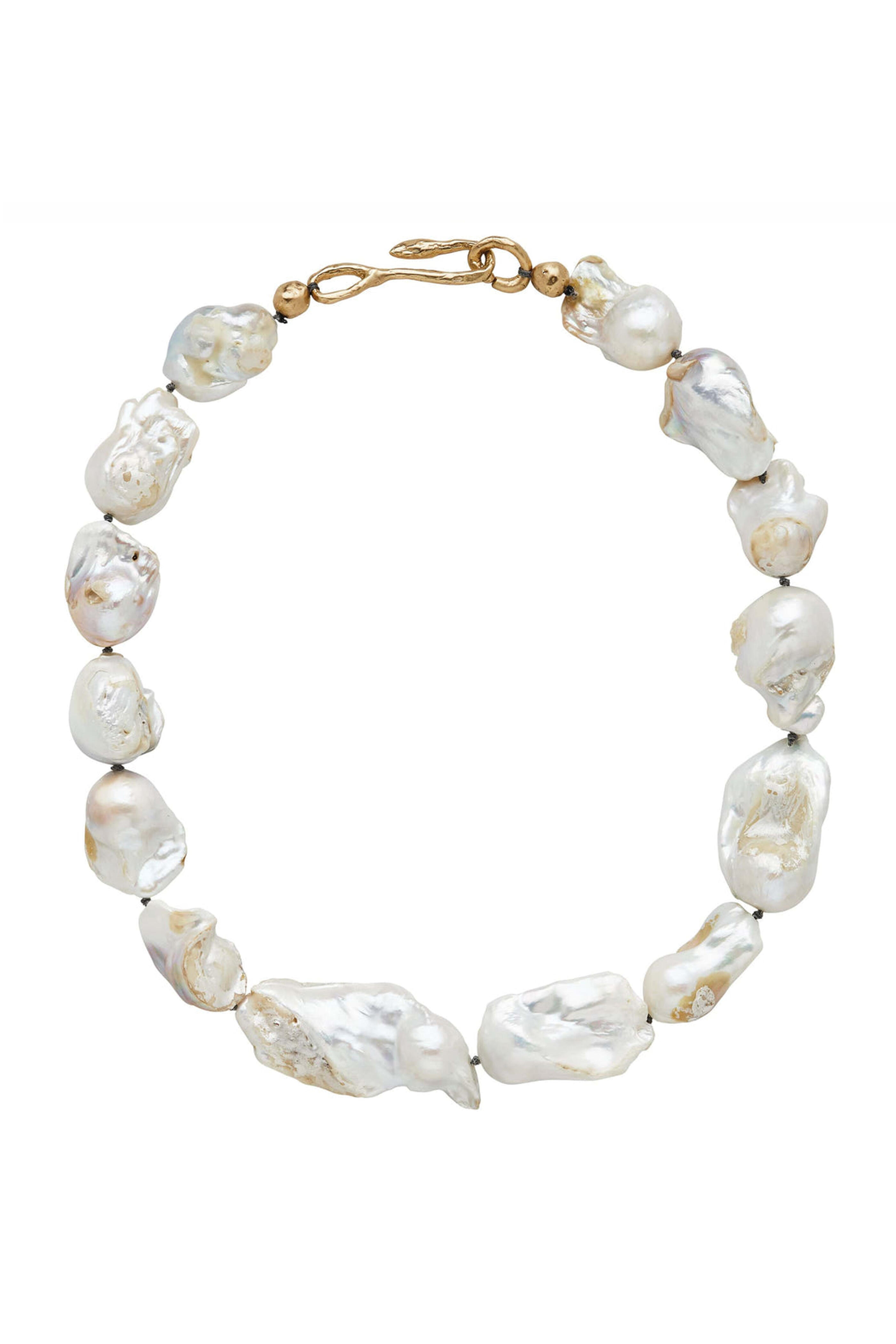 Bronze. Pearl. Beaded. Hand knotted. Hook clasps. Limited edition. Handcrafted in the USA. Length: 19”.