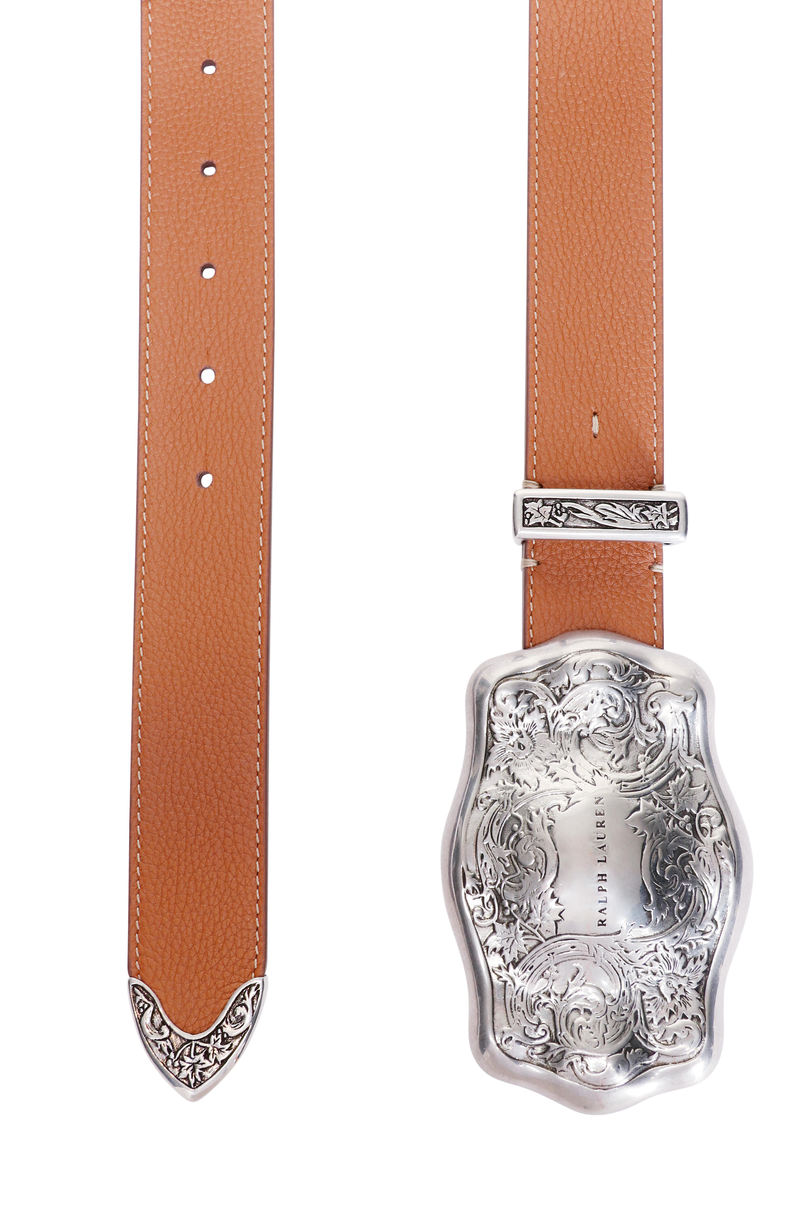 - Antiqued brass “Ralph Lauren” engraved Western-inspired buckle