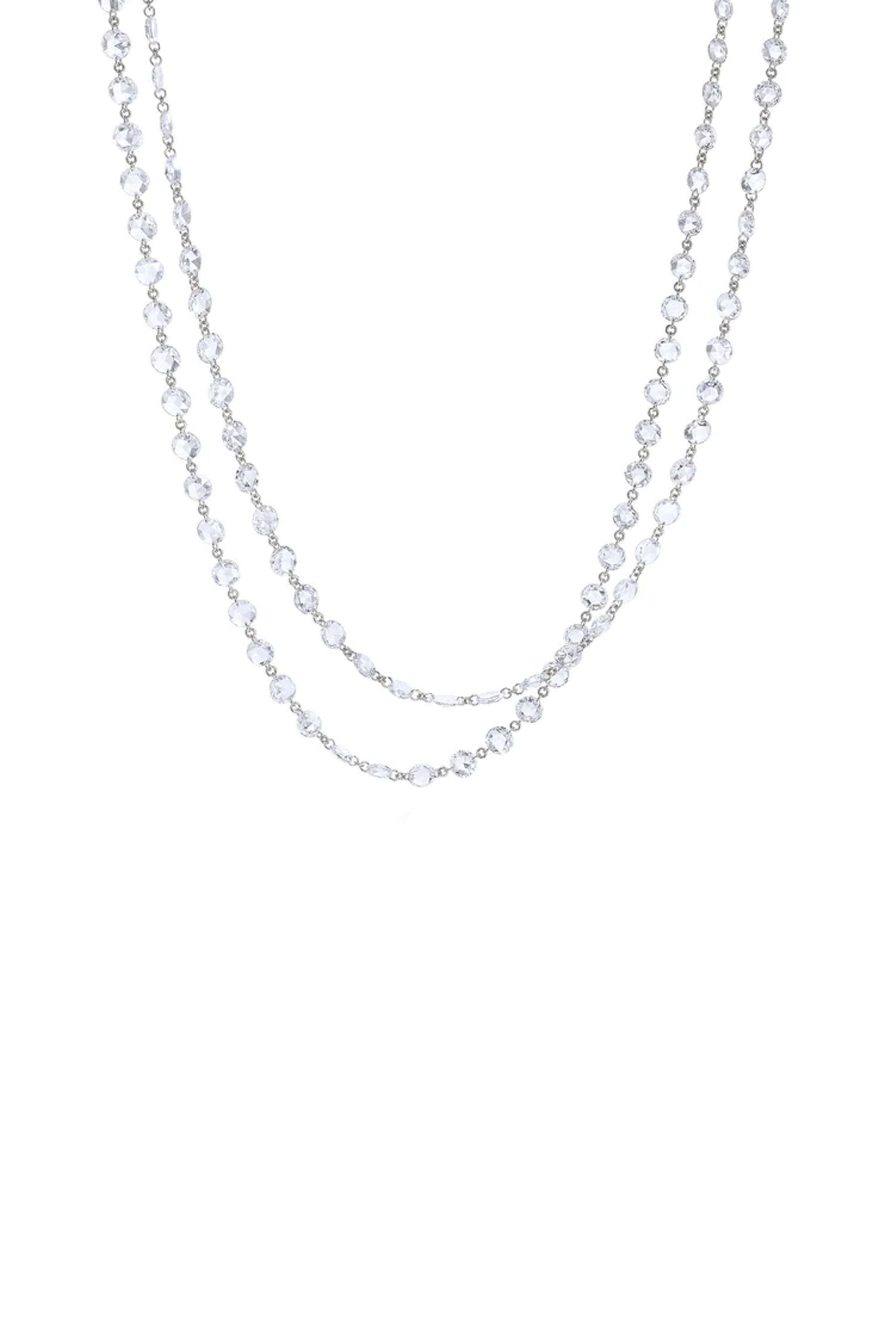 18k white gold. Diamond 10.50 total carat weight. Cable chain. Lobster claw clasps. Made in India. Length: 22”.
