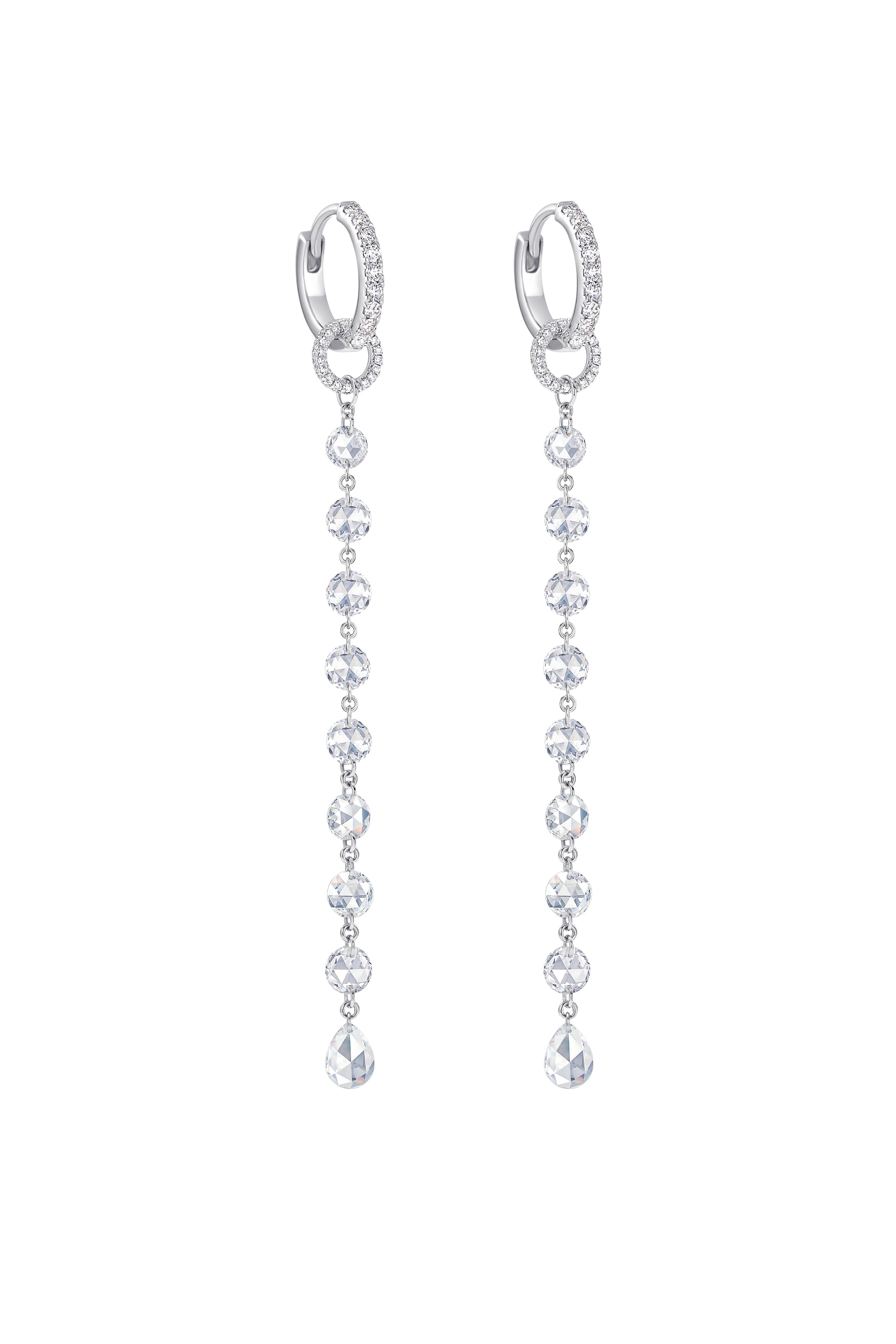 18k white gold. Diamond 2.20 total carat weight. Round, brilliant cut diamond. Pear rose cut diamond. Droplet design. Cable chain. Drop style. Diamond hinge huggie closure. Made in India.