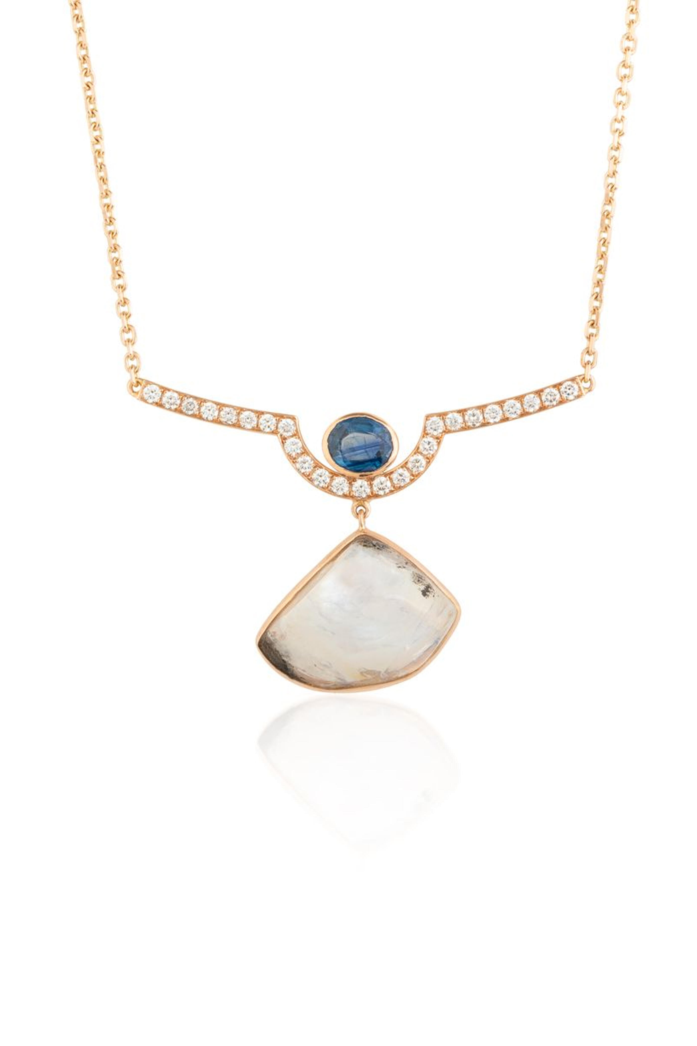 18k rose gold. Diamond. Moonstone. Blue sapphire. Diamond bar. Cable chain. Gold bezel. Lobster claw clasps. Imported.